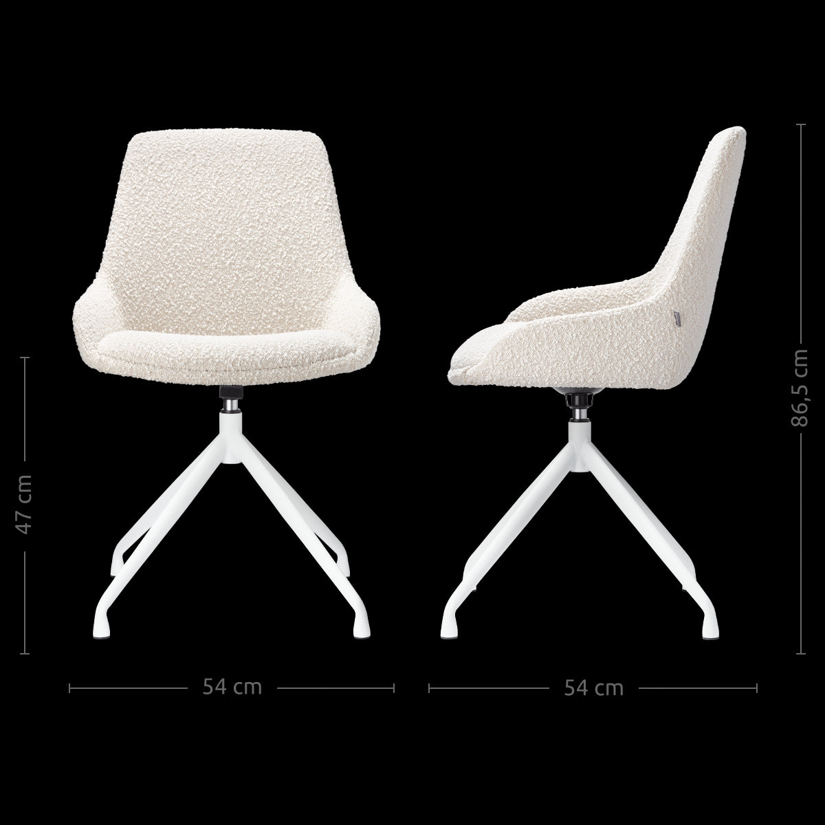 De eetkamerstoel heeft een comfortabele zitting met een sterk houten binnenwerk, waardoor je rug veel ondersteuning krijgt en je gemakkelijk een actieve zithouding aanneemt. Het gevoerde zitvlak zorgt voor veel comfort, evenals de zachte stoffen bekleding. Het metalen onderstel heeft een draaimechanisme, waardoor de zitting 360 graden op het onderstel kan draaien. Dit maakt van de Nola-Isa een uiterst functionele en flexibele stoel aan de eettafel. Maak een keuze uit de verschillende kleuren en materialen zitting, waaronder het trendy en onderhoudsvriendelijke bouclé stof, aan de hand van jouw persoonlijke smaak. De combinatie van het strakke ontwerp en de warme kleuropties van de bekleding geeft deze stoel een tijdloze, elegante uitstraling die bij elke inrichting past.