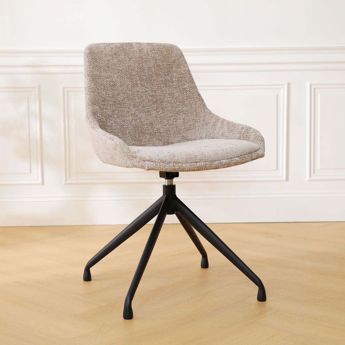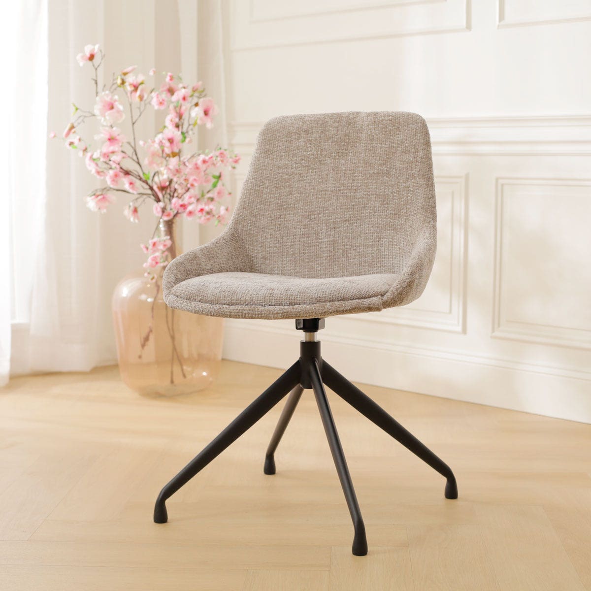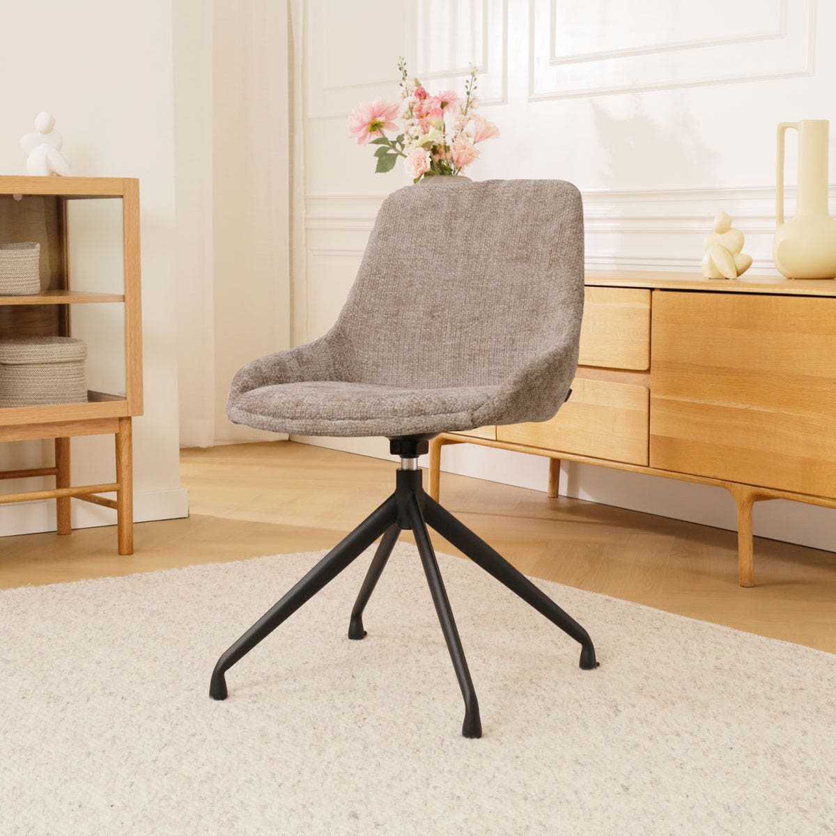 Deze stoel combineert stijl en functionaliteit met een stoer zwart metalen onderstel en een stoffen zitting in de kleur bruin. De bruine stof heeft een subtiele glans, waardoor de stoel een luxe en elegante uitstraling krijgt. Met een zithoogte van 47 cm en een zitdiepte van 40 cm biedt de stoel comfortabel zitten. Dankzij de 360-graden draaifunctie is de stoel ideaal voor kleinere ruimtes en biedt hij flexibiliteit in gebruik. De afwezigheid van armleuningen maakt hem bovendien ruimtebesparend. De Nola-Isa eetkamerstoel past perfect in zowel een hotel chique interieur als in een Scandinavische of moderne inrichting. De stoel is zeer eenvoudig in elkaar te zetten en heeft een totale hoogte van 86,5 cm. Eetkamerstoelen in bruin zijn gemakkelijk te combineren met andere kleuren en meubels in huis. Kortom, de Nola-Isa eetkamerstoel in bruin is een veelzijdige en elegante keuze voor elke eetkamer.