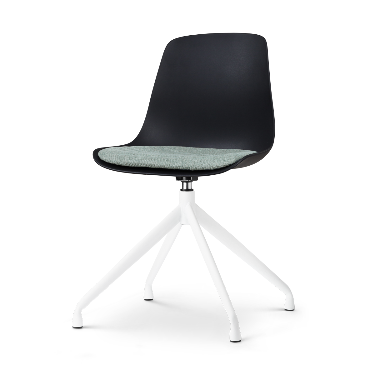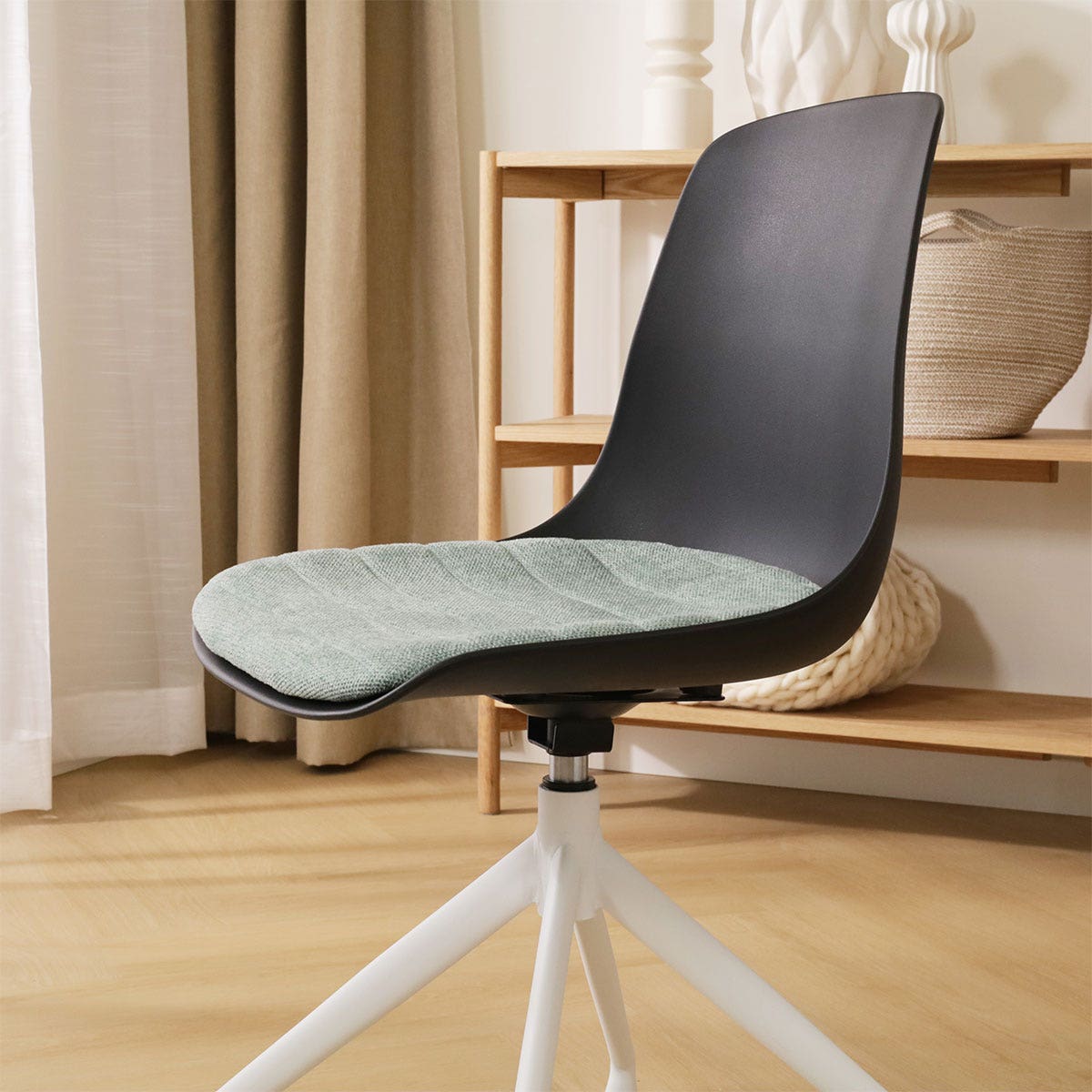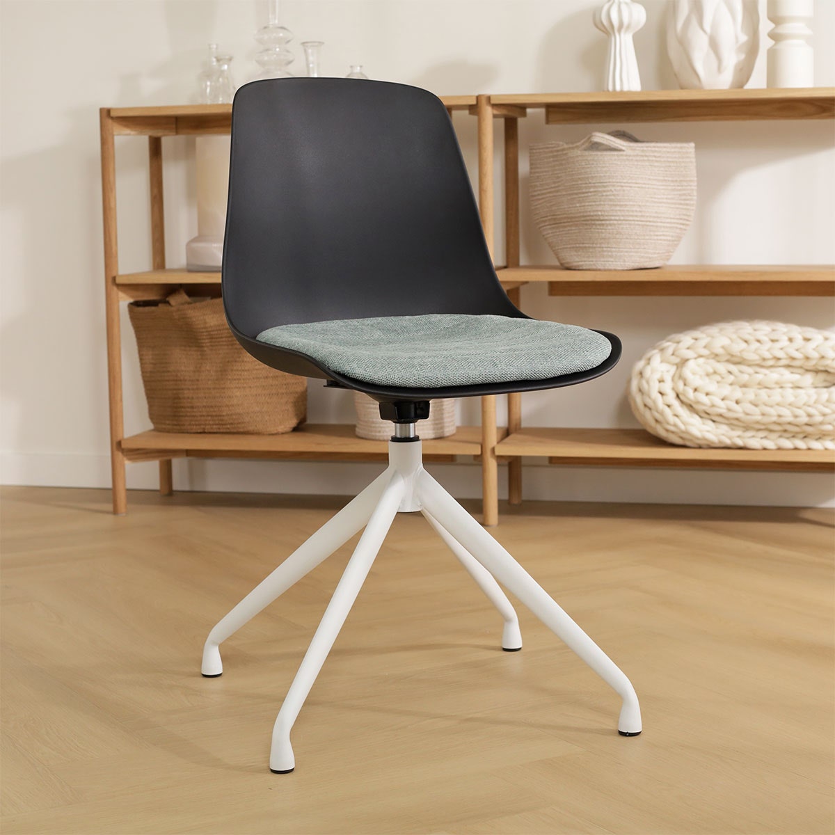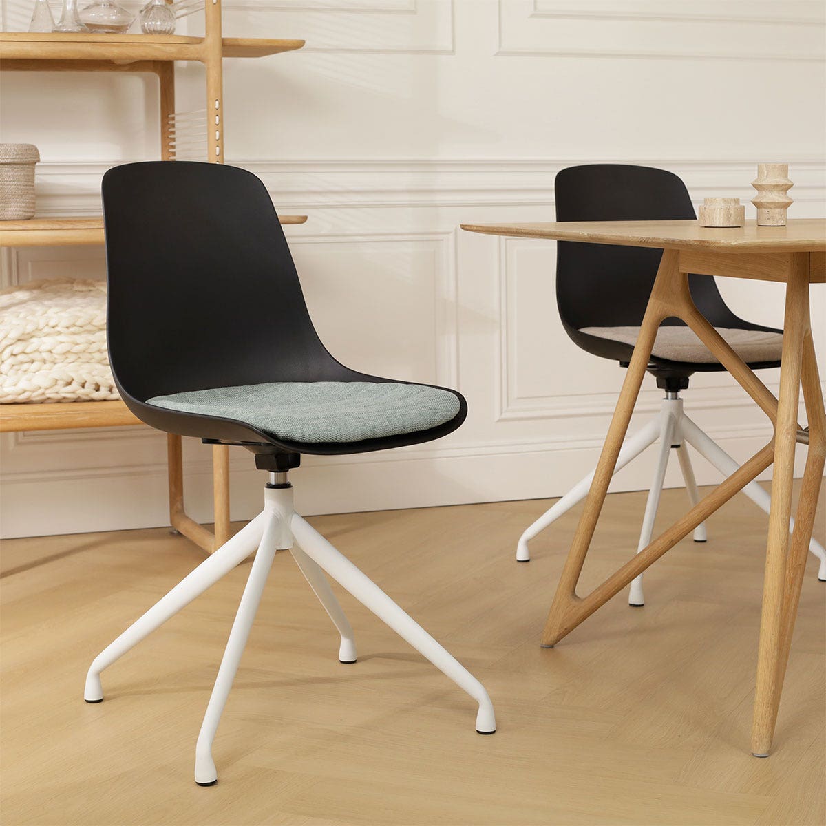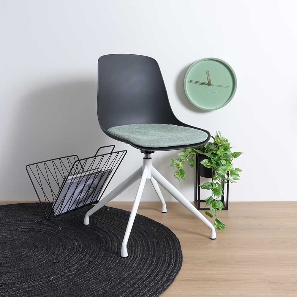 De eetkamerstoel heeft een modern draaibaar onderstel gemaakt van metaal. De zitting is gemaakt van door en door gekleurd kunststof, waardoor de stoel uiterst geschikt is voor inetnsief gebruik. De zitting draait 360 graden op het onderstel, zodat je de stoel niet ver naar achteren hoeft te schuiven om plaats te kunnen nemen. Ook aan het diner zorgt deze draaifunctie voor flexibiliteit. Om een uitstekend zitcomfort te bieden is de Nola-Liv eetkamerstoel niet alleen ontworpen met ergnomische vormen, het zitvlak van de stoel is voorzien van een vast zitkussen bekleed met zachte stof. Hierdoor zit je extra zacht en is urenlang natafelen of uitgebreid dineren op deze kunststof eetkamerstoel geen enkel probleem. Maak een keuze uit de zwarte of witte zitting en kies vervolgens uit één van de vijf beschikbare kleuren zitkussen om deze eetkamerstoel helemaal aan jouw eethoek aan te passen.