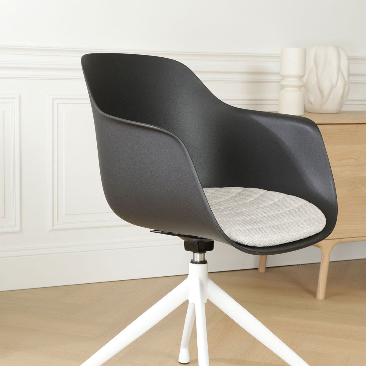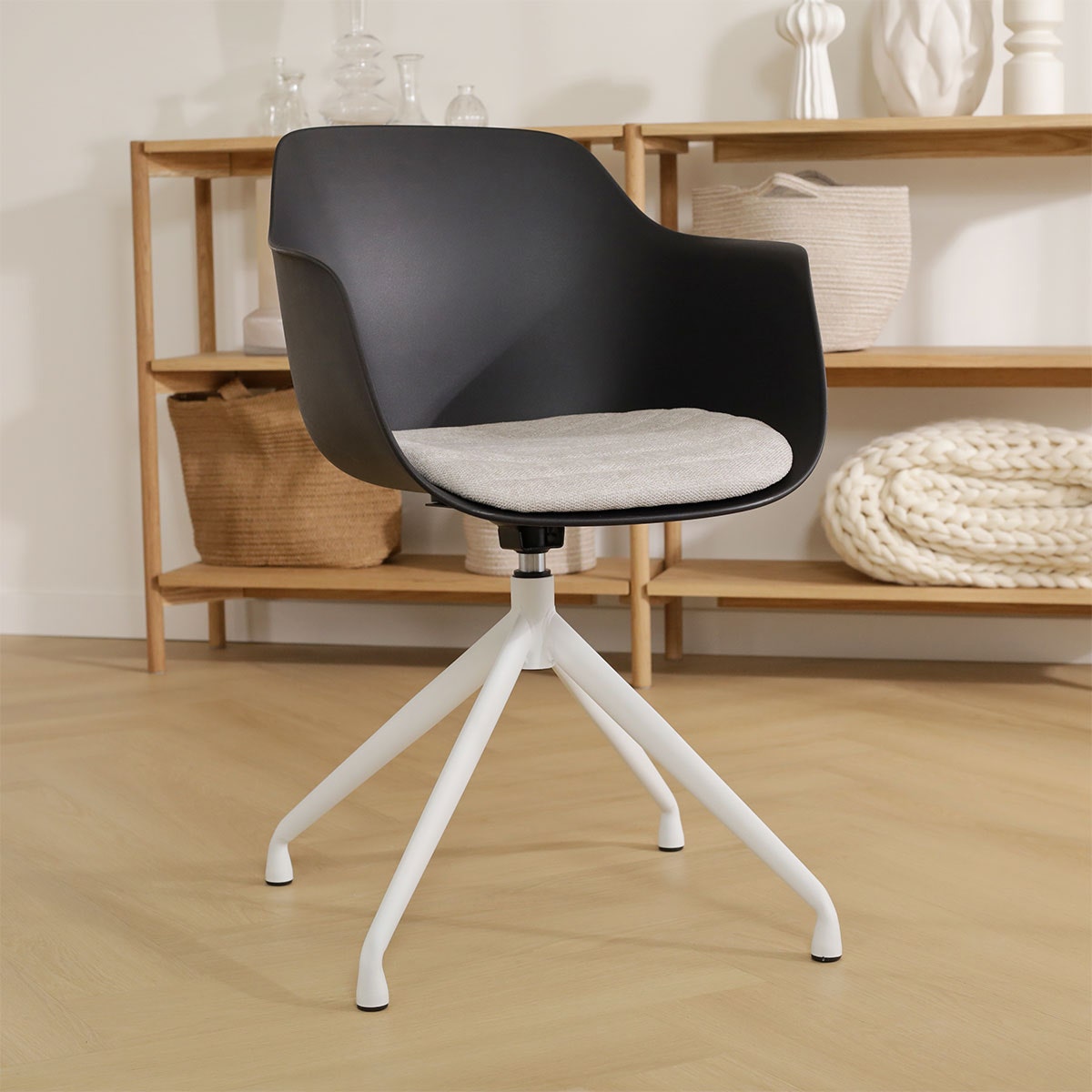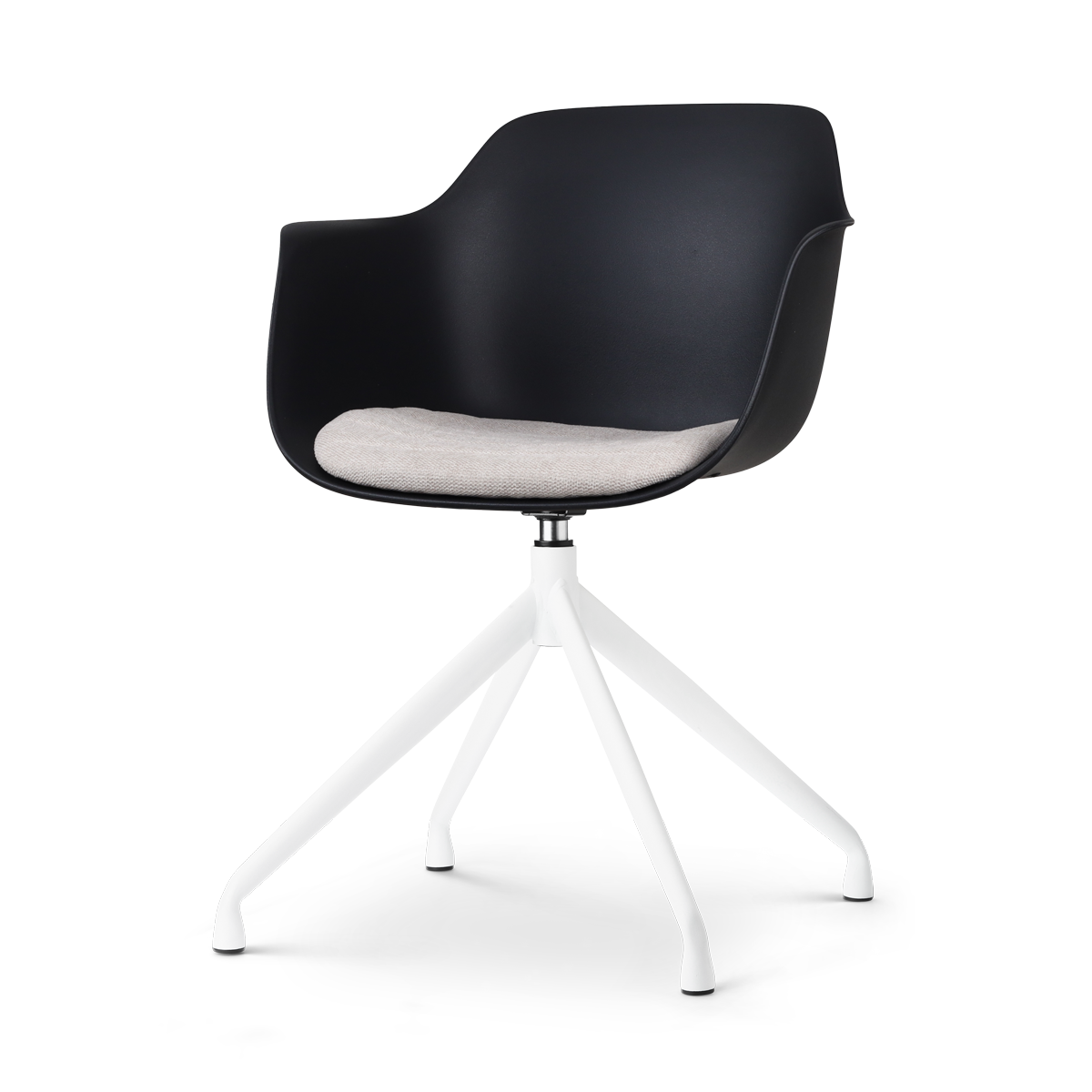 De Nola draaibare eetkamerstoel met een kunststof zitting met armleuningen is een mooie elegante stoel die als blikvanger dient rondom je eettafel.
