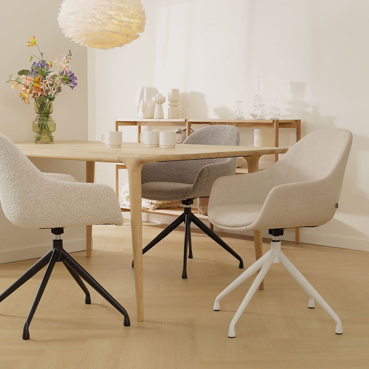 De Nola-Mae draaibare beige eetkamerstoel van Nolon is onderdeel van een mix en match collectie. Dit betekent dat zowel het onderstel als de zitting van deze stoel in diverse andere combinaties verkrijgbaar zijn. Zo kan je de beige stoffen Mae zitting ook combineren met een draaibaar onderstel in het zwart, een houten onderstel in naturel of walnoot kleur. Het draaibare Nola onderstel kan ook juist weer gecombineerd worden met alle andere zittingen van Nolon.