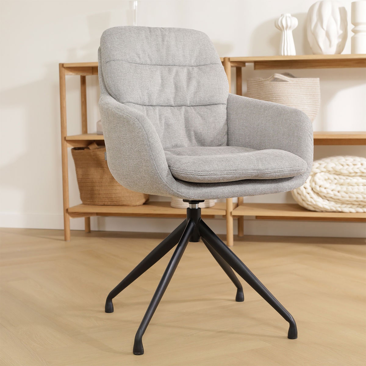 Deze eetkamerstoel heeft een metalen frame met een draaibare poot. Het onderstel van de draaibare eetkamerstoel heeft geen terugdraaifunctie, waardoor de zitting 360 graden op het onderstel kan draaien. Dit biedt veel flexibiliteit aan tafel en zorgt ervoor dat je de stoel niet helemaal naar achteren hoeft te schuiven. De comfortabele zitting is volledig bekleed met zachte stof en is verkrijgbaar in beige en grijs. De hoge rugleuning zorgt voor veel ondersteuning, net als het vaste zitkussen en de armleuningen. Urenlang natafelen is met de Nola-Mia eetkamerstoel dus geen probleem.