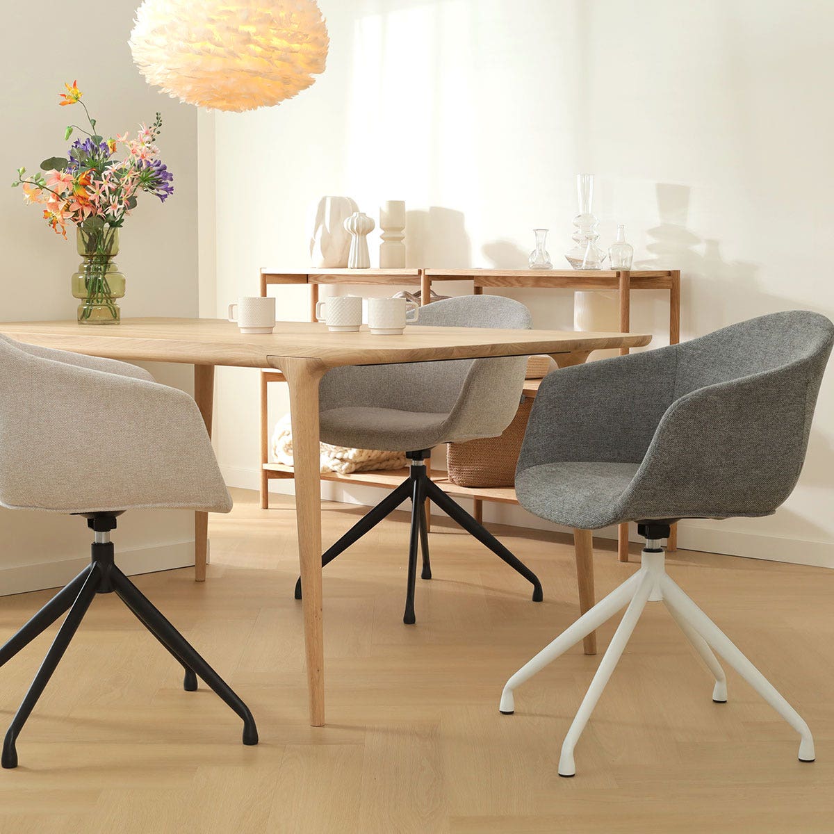 De stoel is ontworpen met armleuningen voor extra zitcomfort en de stoffen bekleding zorgt ervoor dat je lekker zacht zit. Met zes verschillende kleuren bekleding is er voor iedere woonstijl een geschikt exemplaar te vinden. Het moderne metalen onderstel staat op vier slanke poten en heeft een draaifunctie, zodat je gemakkelijk op en af kan stappen. De schuin aflopende armleuningen bieden volop ondersteuning en zorgen er in combinatie met de passieve zithouding voor dat je ontspannen aan tafel zit. Deze draaibare eetkamerstoel van Nolon is dus niet alleen erg leuk om te zien, maar zit ook nog eens heel erg comfortabel.