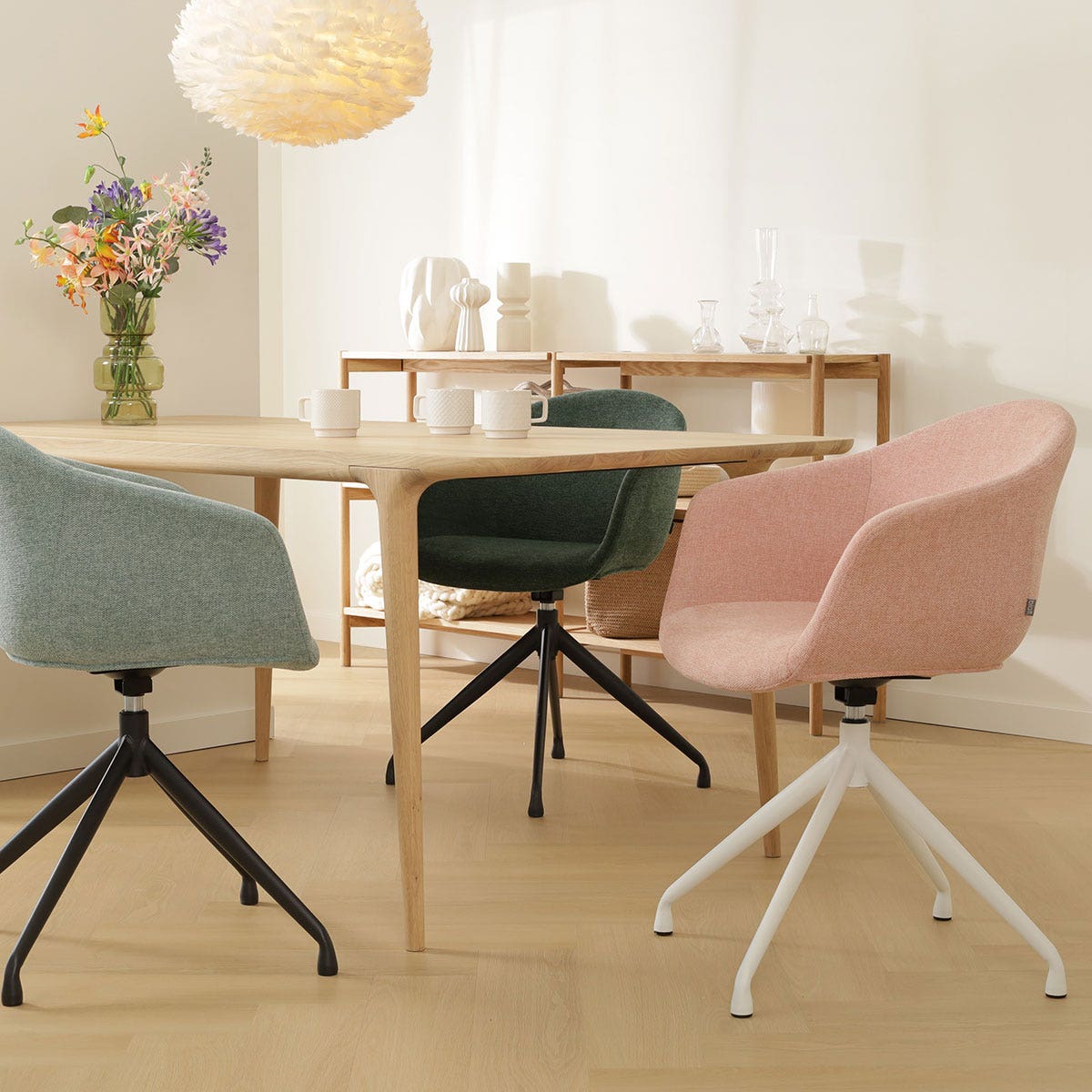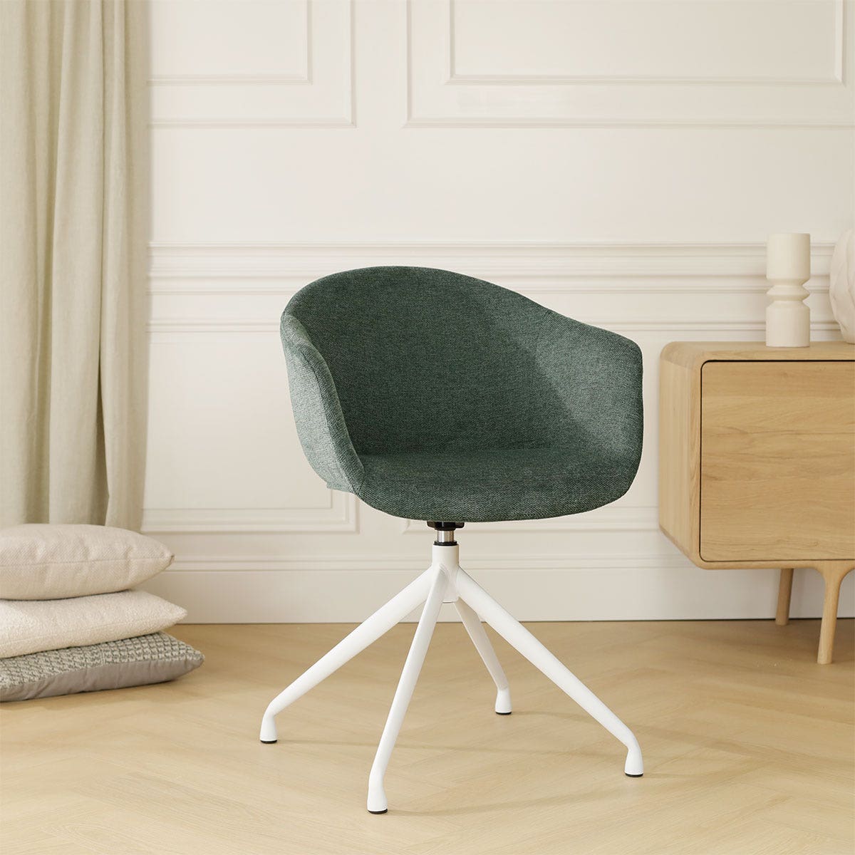 De stoel is ontworpen met armleuningen voor extra zitcomfort en de stoffen bekleding zorgt ervoor dat je lekker zacht zit. Met zes verschillende kleuren bekleding is er voor iedere woonstijl een geschikt exemplaar te vinden. Het moderne metalen onderstel staat op vier slanke poten en heeft een draaifunctie, zodat je gemakkelijk op en af kan stappen. De schuin aflopende armleuningen bieden volop ondersteuning en zorgen er in combinatie met de passieve zithouding voor dat je ontspannen aan tafel zit. Deze draaibare eetkamerstoel van Nolon is dus niet alleen erg leuk om te zien, maar zit ook nog eens heel erg comfortabel.