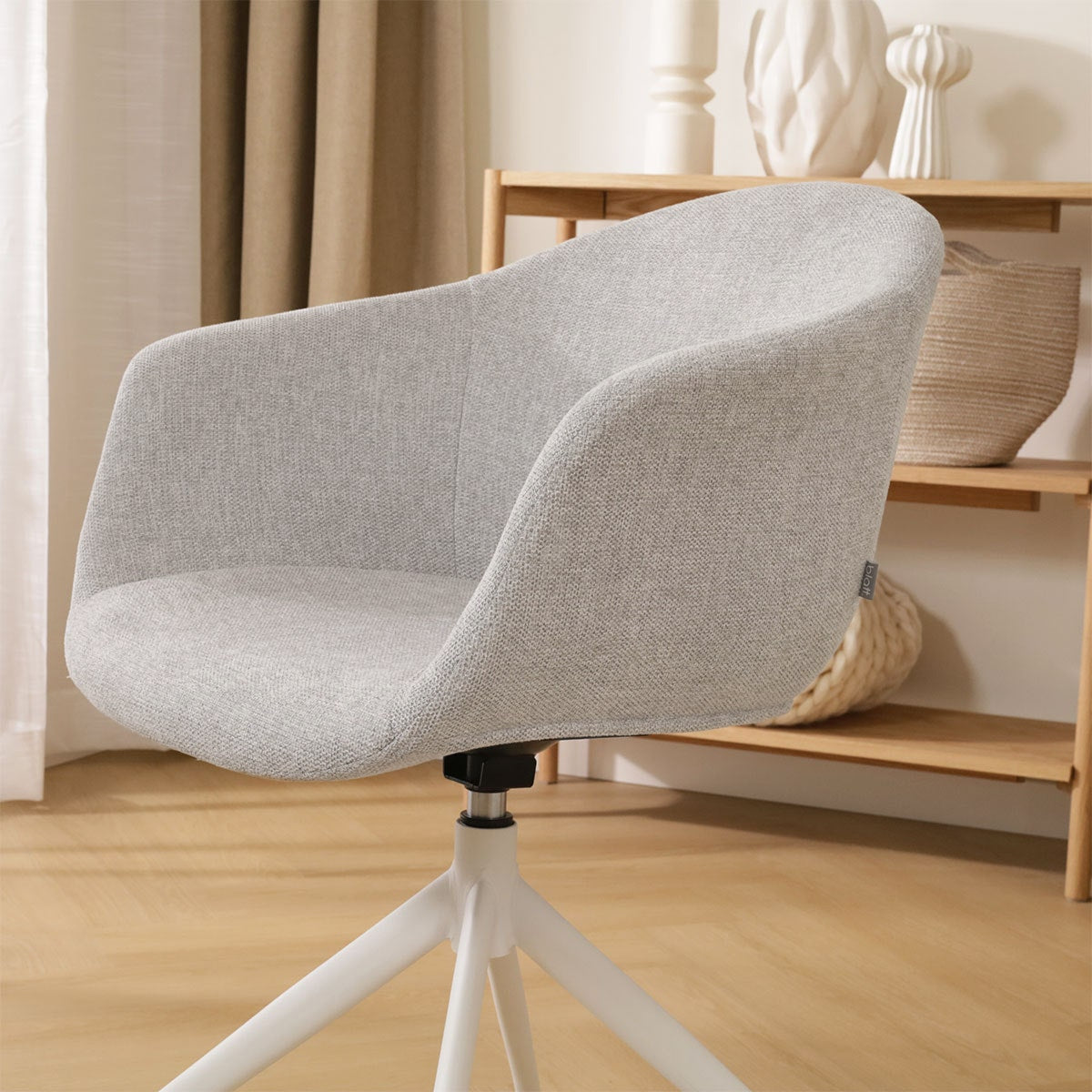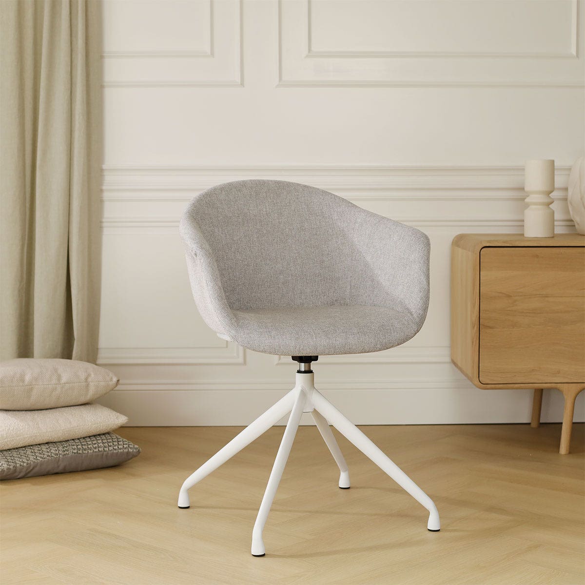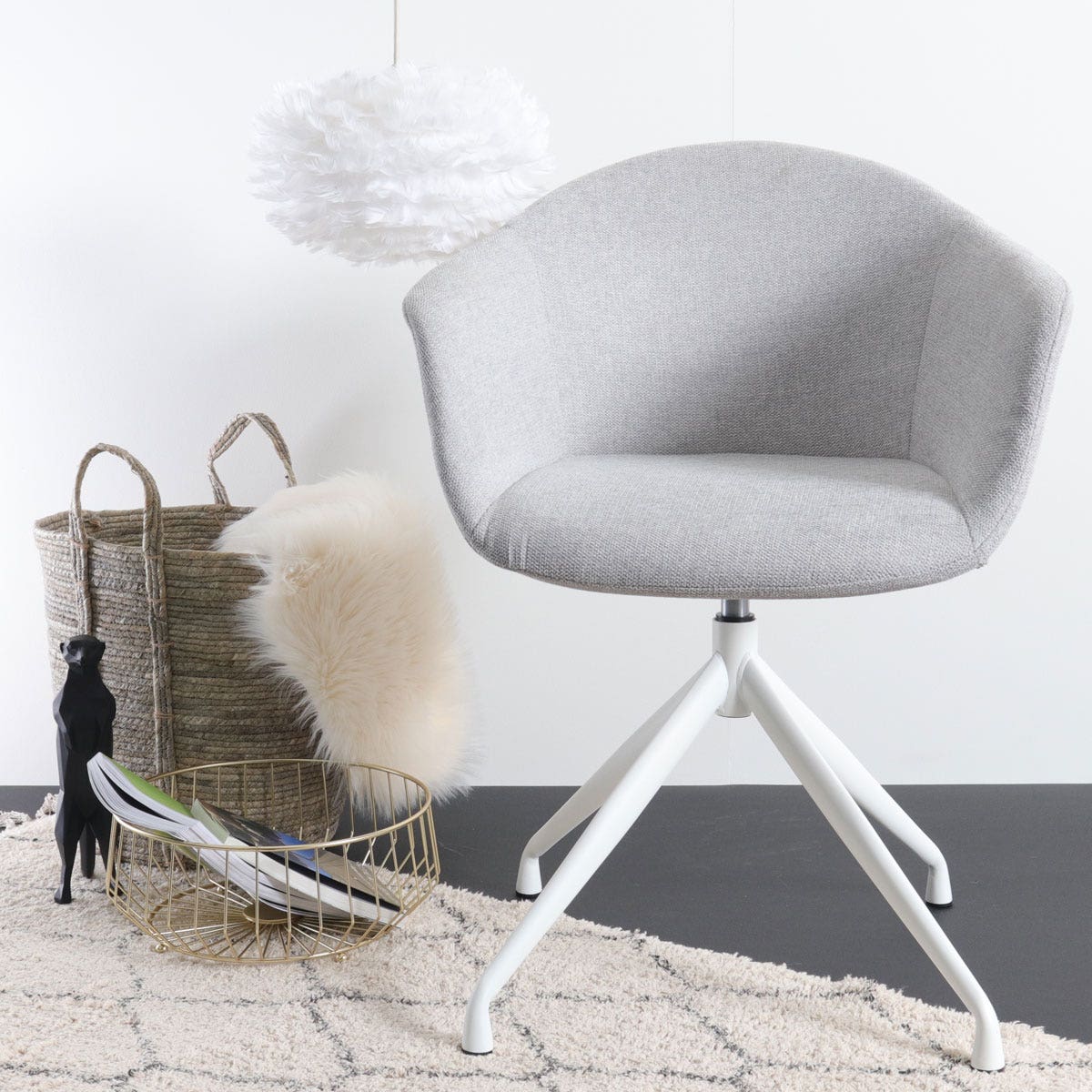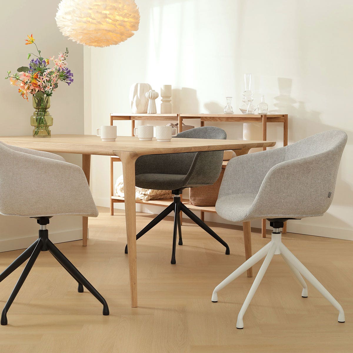 De stoel is ontworpen met armleuningen voor extra zitcomfort en de stoffen bekleding zorgt ervoor dat je lekker zacht zit. Met zes verschillende kleuren bekleding is er voor iedere woonstijl een geschikt exemplaar te vinden. Het moderne metalen onderstel staat op vier slanke poten en heeft een draaifunctie, zodat je gemakkelijk op en af kan stappen. De schuin aflopende armleuningen bieden volop ondersteuning en zorgen er in combinatie met de passieve zithouding voor dat je ontspannen aan tafel zit. Deze draaibare eetkamerstoel van Nolon is dus niet alleen erg leuk om te zien, maar zit ook nog eens heel erg comfortabel.
