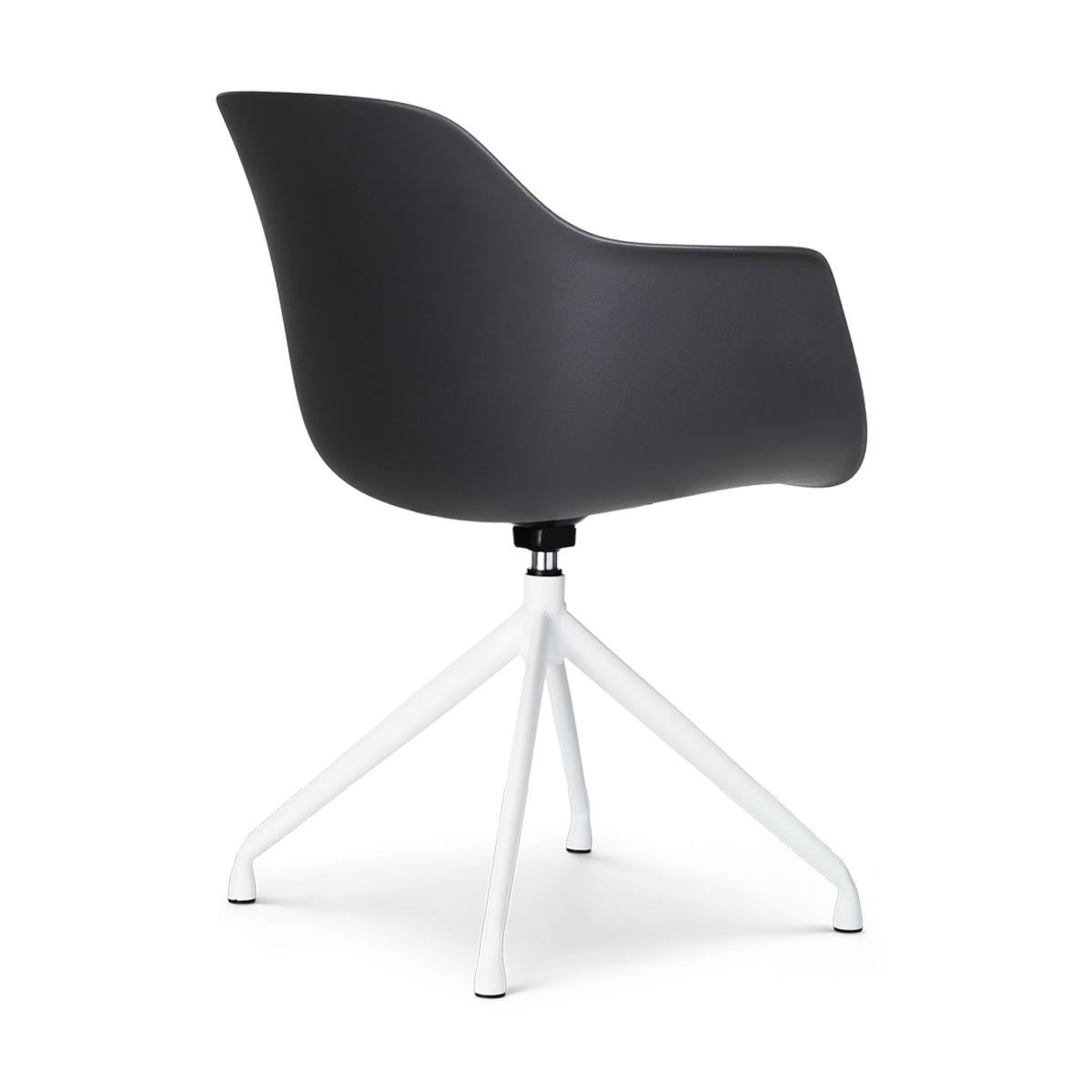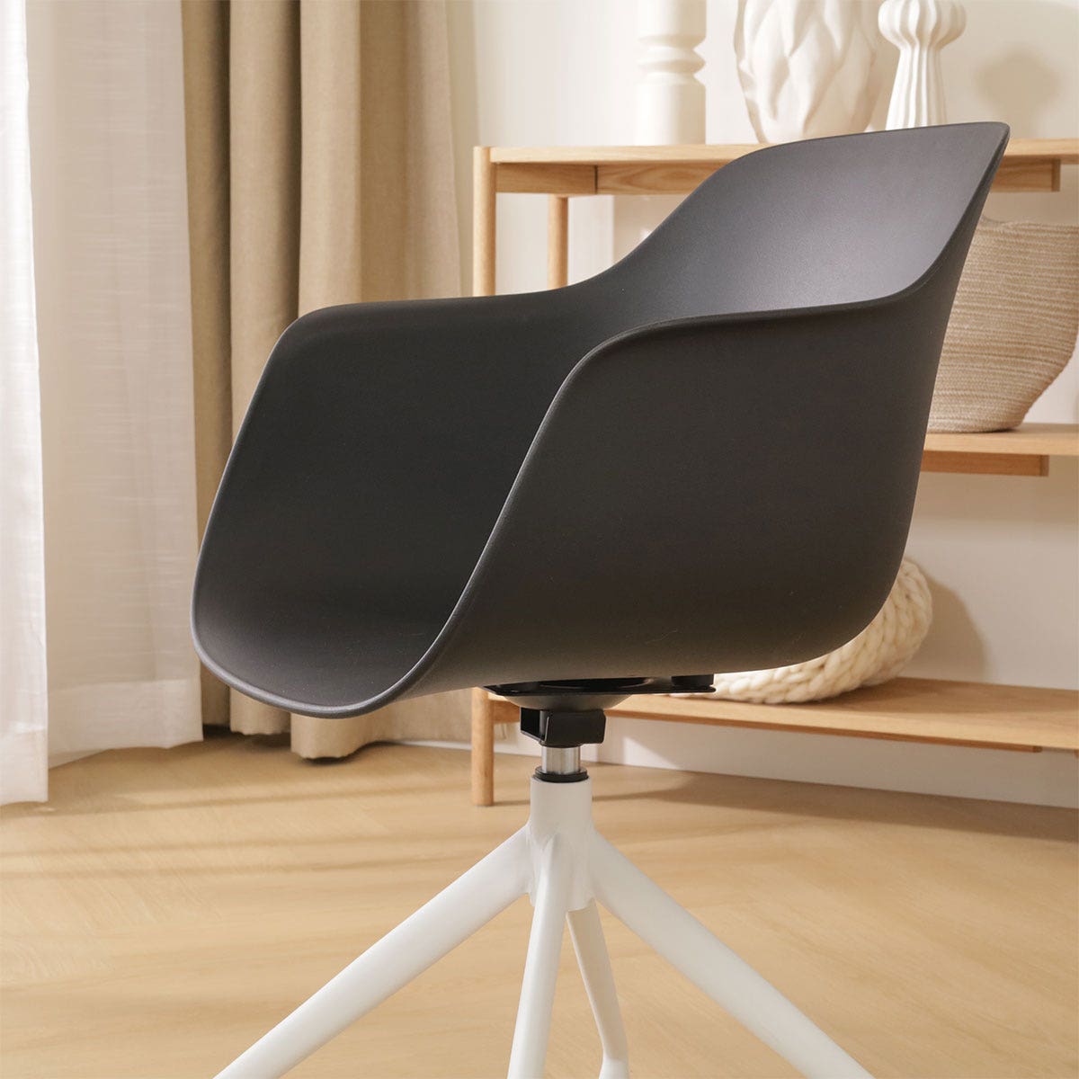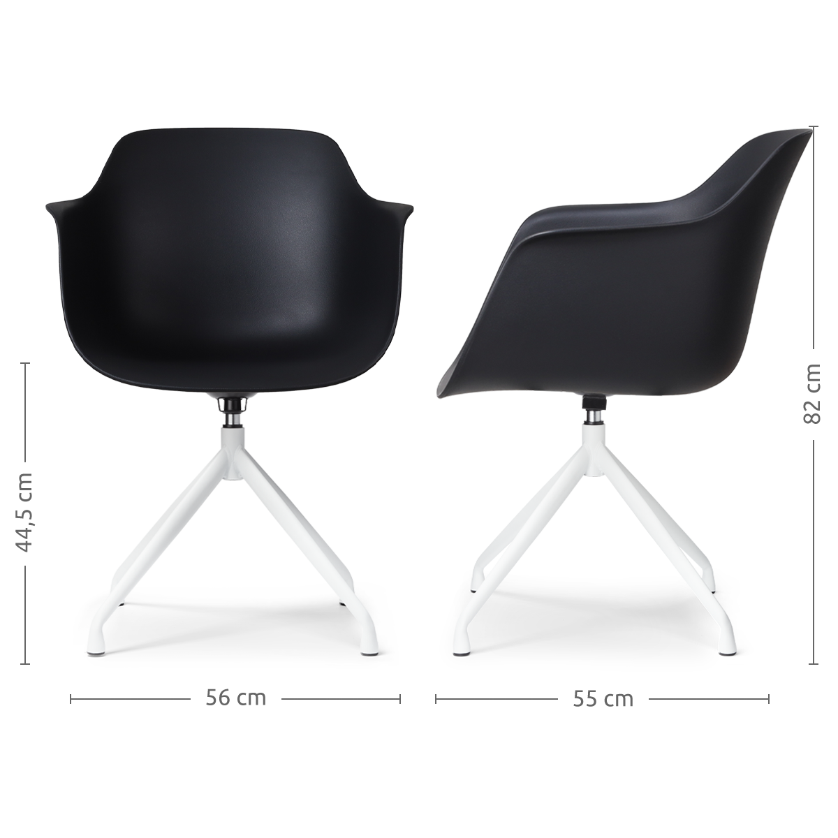 Deze eetkamerstoel, ontworpen met een industrieel en Scandinavisch tintje, biedt een comfortabele zitervaring dankzij de ergonomische kuipvorm en de aanwezigheid van armleuningen. De stoel is vervaardigd met een duurzame kunststof zitting, die zowel in wit als zwart verkrijgbaar is, en rust op een stevig metalen onderstel met witte poten. Met een hoogte van 82 cm en een zithoogte van 45 cm, biedt deze stoel een ideale zitpositie voor de meeste eettafels. De zitdiepte van 46 cm zorgt voor voldoende ondersteuning en comfort tijdens lange diners. Het draaibare ontwerp zonder terugdraaimechanisme maakt het gemakkelijk om in en uit de stoel te stappen, wat vooral handig is in kleinere ruimtes. Dankzij het gebruiksvriendelijke materiaal is de stoel eenvoudig schoon te maken, wat bijdraagt aan de onderhoudsvriendelijkheid en duurzaamheid. Deze moderne eetkamerstoel van Nolon is een praktische en stijlvolle keuze voor ieder interieur.