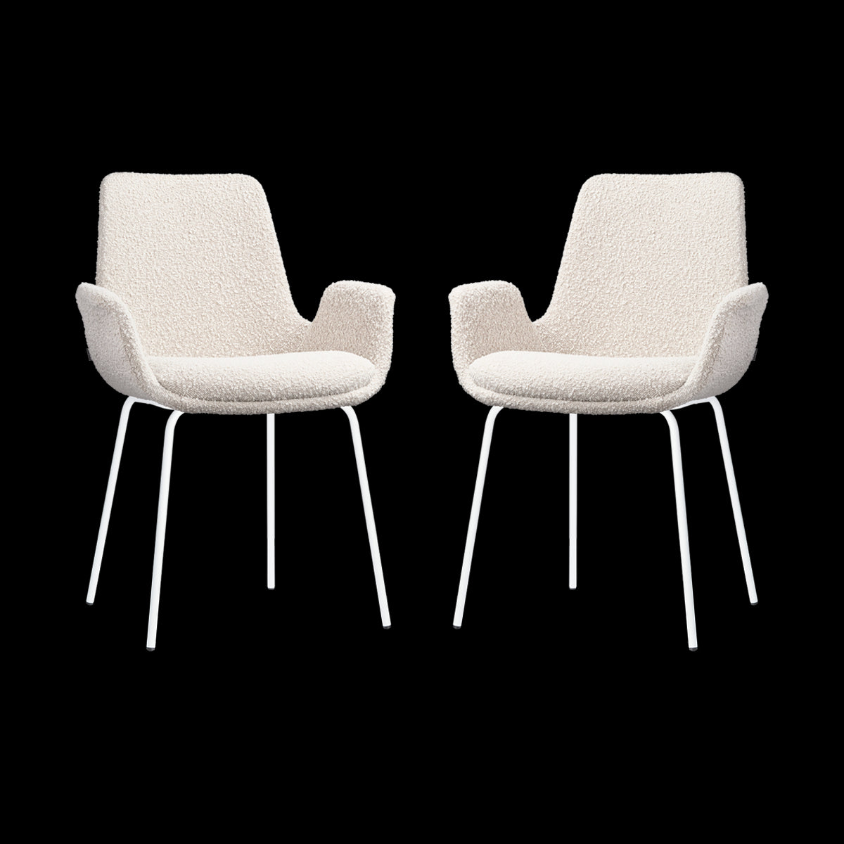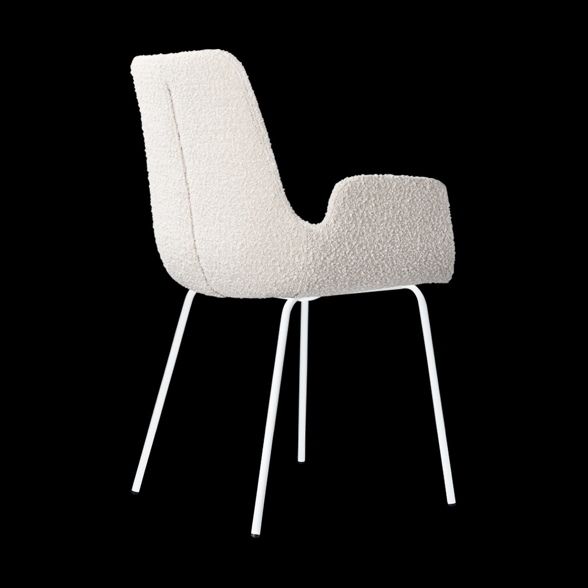 Deze eetkamerstoel is ontworpen met een rank metalen frame dat verkrijgbaar is in zwart en wit. De zitting heeft een stevige rugleuning en armleuningen voor een hoog zitcomfort. Zo kan je zorgeloos genieten van gezellige diners en bijeenkomsten. De armleuningen van deze eetkamerstoel zijn iets lager dan normaal, zodat beter onder de eettafel passen. De Nora-Eef is verkrijgbaar met een zitting in twee verschillende kleuren en materialen, waaronder bouclé stof. Dit populaire materiaal zorgt dankzij de rijke textuur voor de ultieme warme sfeer in de eethoek en is daarnaast ook nog eens extra onderhoudsvriendelijk. Heb je liever een eetkamerstoel met een tijdloze uitstraling? De zitting is ook verkrijgbaar met een luxe beige stof. Welke variant je ook kiest, de Nora-Eef eetkamerstoel is altijd een goede keuze.