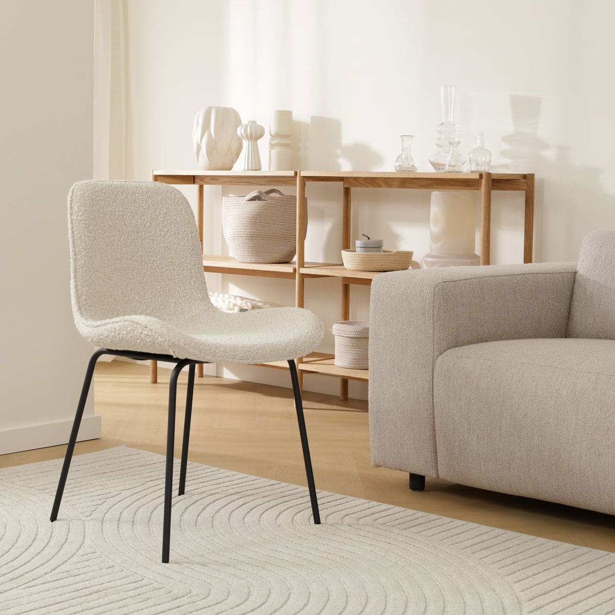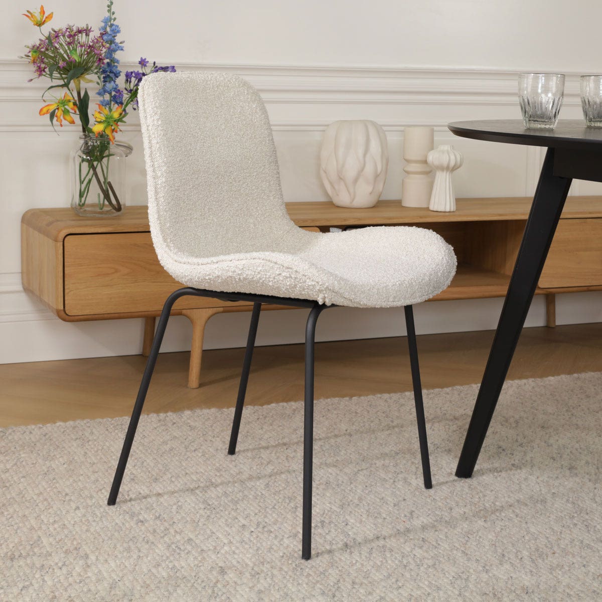 De strakke lijnen van het onderstel en de subtiele rondingen van de gestoffeerde zitting geven deze eetkamerstoel een tijdloze en stijlvolle uitstraling. Deze eetkamerstoel heeft een tijdloos design dat gemakkelijk te combineren is met iedere woonstijl. Het stabiele onderstel van de stoel is gemaakt van metaal en heeft een elegante en minimalistische uitstraling dankzij de ranke poten. De gestoffeerde zitting met gevleugeld zitvlak voegt warmte toe aan de eethoek en zorgt ervoor dat je erg comfortabel zit. Het houten binnenwerk biedt veel ondersteuning aan de rug en biedt een actieve zithouding. De Nora-Fé eetkamerstoel heeft geen armleuningen en kan daardoor zorgeloos aan iedere eettafel en op elke plek worden aangeschoven. Maak een keuze uit de verschillende kleuren en materialen voor de zitting en voeg een vleugje sfeer toe aan de eetkamer.