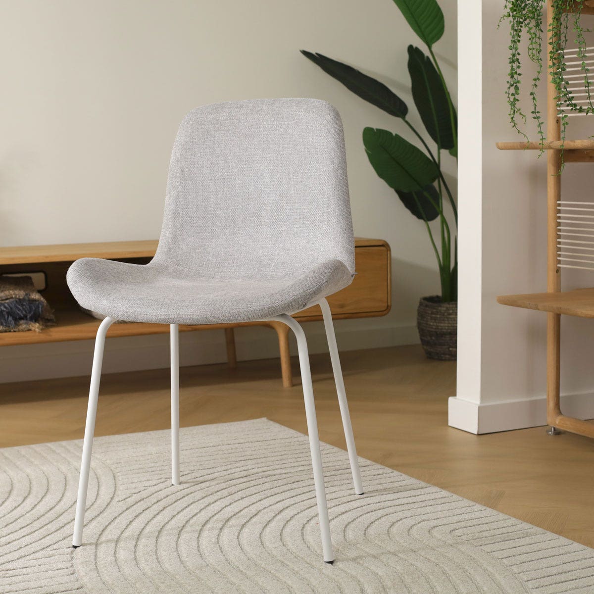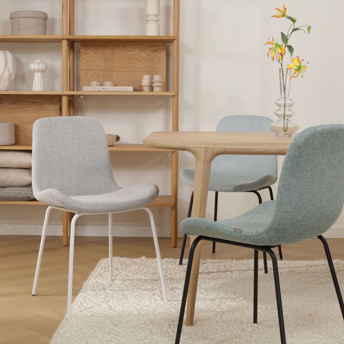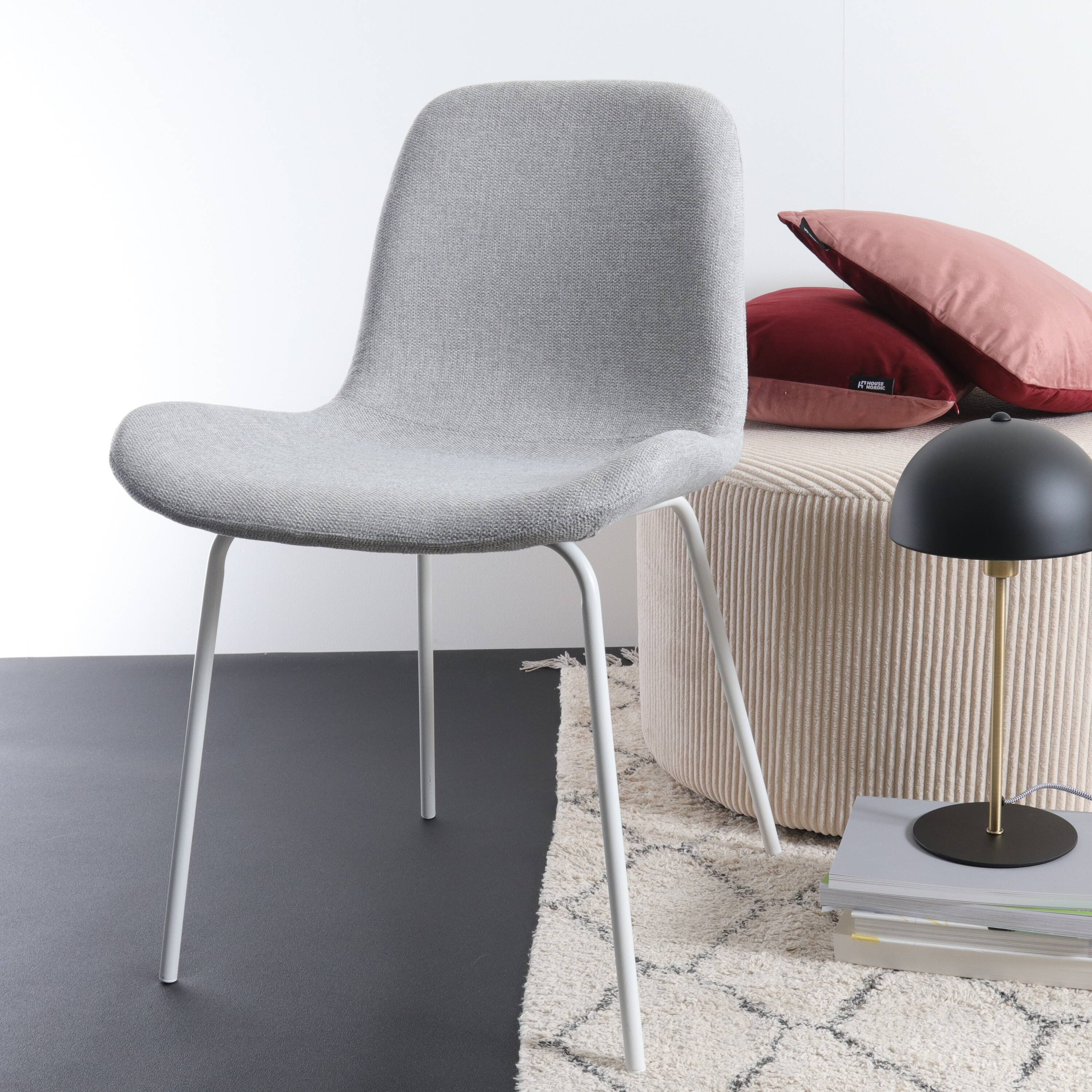 De strakke lijnen van het onderstel en de subtiele rondingen van de gestoffeerde zitting geven deze eetkamerstoel een tijdloze en stijlvolle uitstraling. Deze eetkamerstoel heeft een tijdloos design dat gemakkelijk te combineren is met iedere woonstijl. Het stabiele onderstel van de stoel is gemaakt van metaal en heeft een elegante en minimalistische uitstraling dankzij de ranke poten. De gestoffeerde zitting met gevleugeld zitvlak voegt warmte toe aan de eethoek en zorgt ervoor dat je erg comfortabel zit. Het houten binnenwerk biedt veel ondersteuning aan de rug en biedt een actieve zithouding. De Nora-Fé eetkamerstoel heeft geen armleuningen en kan daardoor zorgeloos aan iedere eettafel en op elke plek worden aangeschoven. Maak een keuze uit de verschillende kleuren en materialen voor de zitting en voeg een vleugje sfeer toe aan de eetkamer.