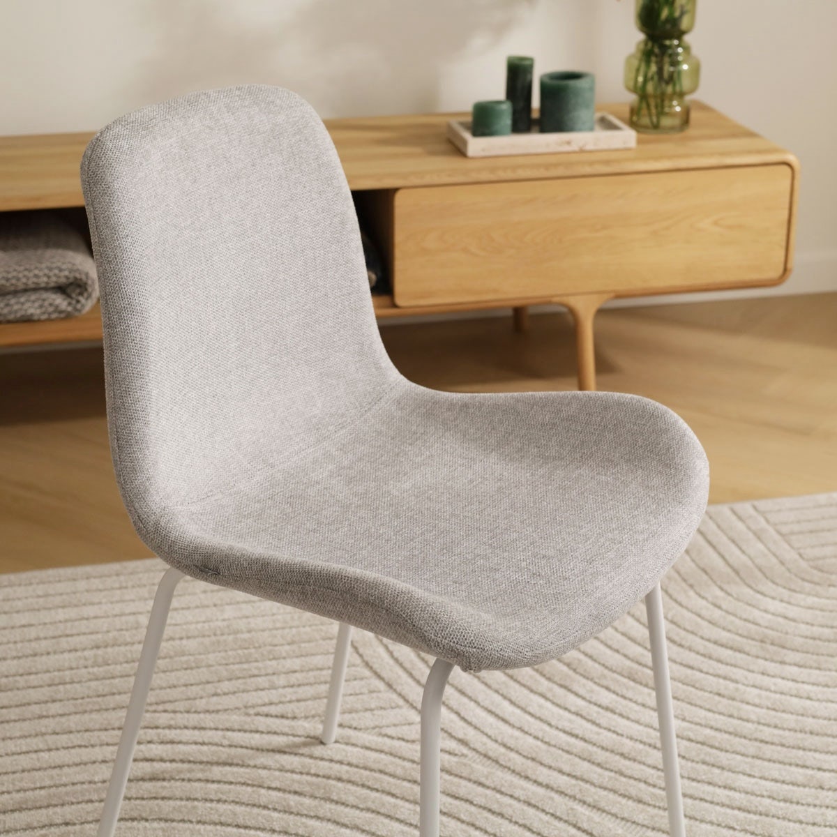 - De stoffen bekleding zorgt voor een warme sfeer in de eethoek