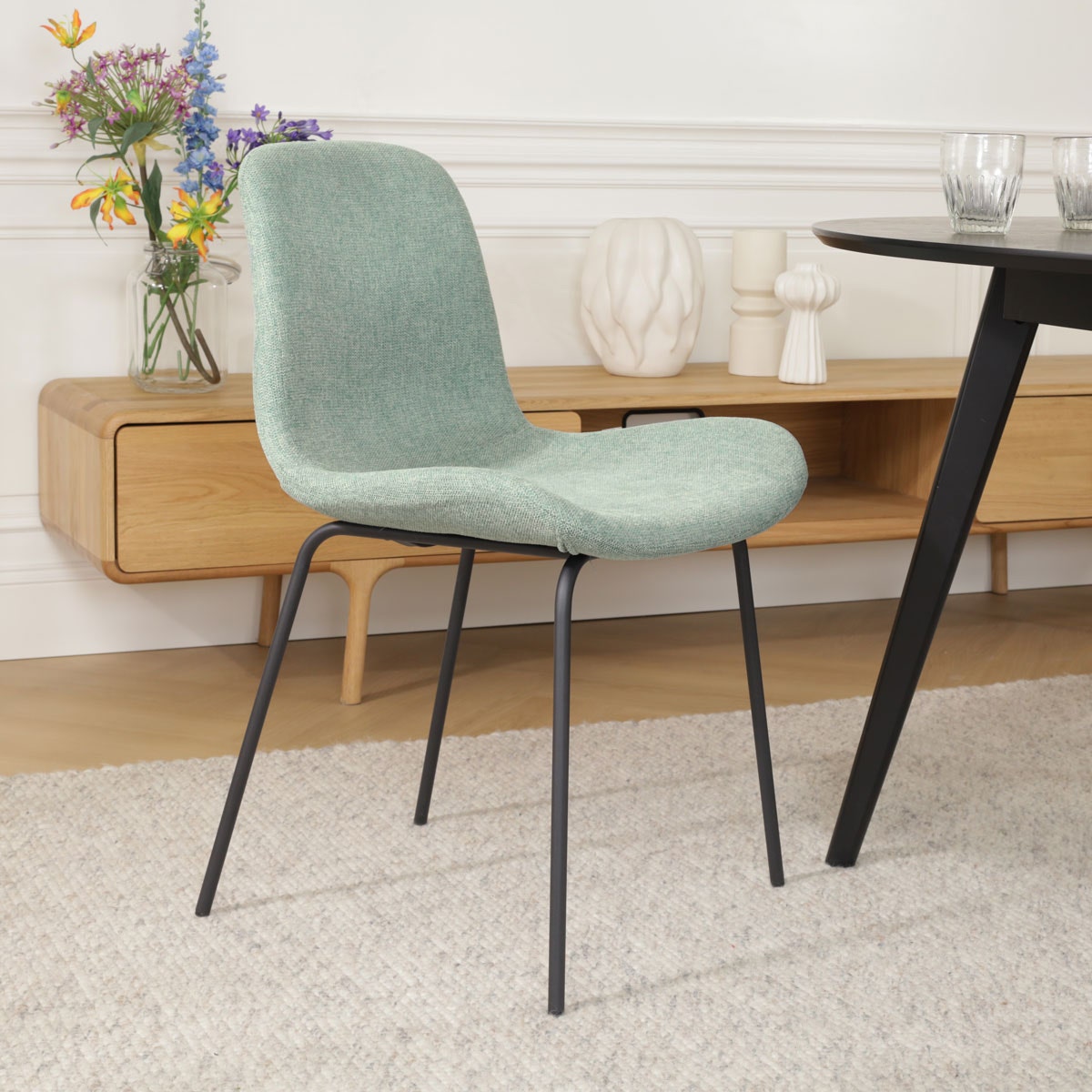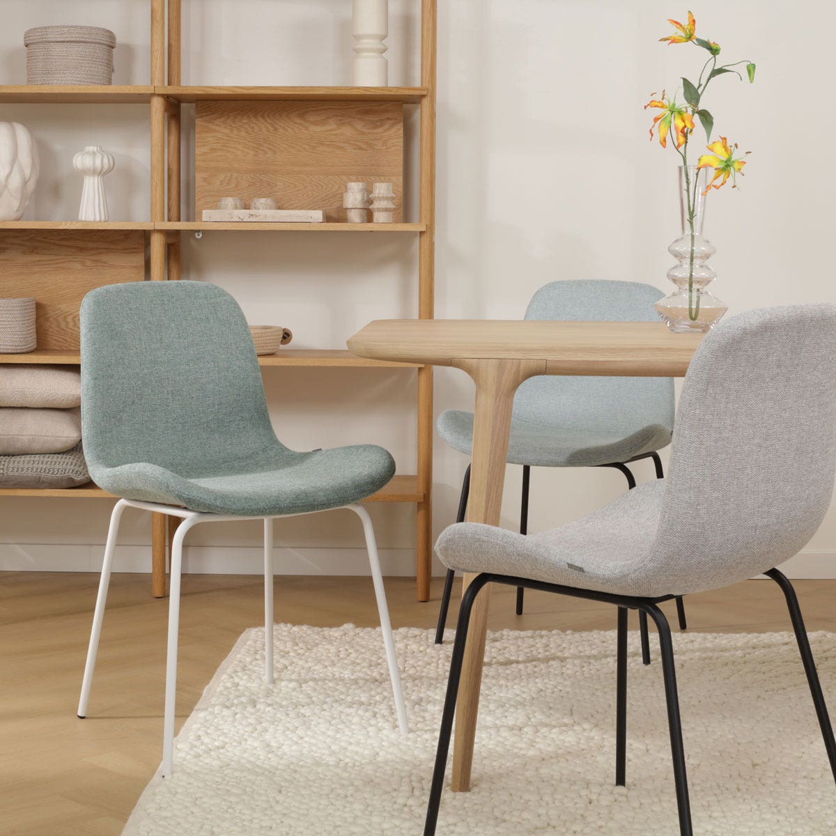 De strakke lijnen van het onderstel en de subtiele rondingen van de gestoffeerde zitting geven deze eetkamerstoel een tijdloze en stijlvolle uitstraling. Deze eetkamerstoel heeft een tijdloos design dat gemakkelijk te combineren is met iedere woonstijl. Het stabiele onderstel van de stoel is gemaakt van metaal en heeft een elegante en minimalistische uitstraling dankzij de ranke poten. De gestoffeerde zitting met gevleugeld zitvlak voegt warmte toe aan de eethoek en zorgt ervoor dat je erg comfortabel zit. Het houten binnenwerk biedt veel ondersteuning aan de rug en biedt een actieve zithouding. De Nora-Fé eetkamerstoel heeft geen armleuningen en kan daardoor zorgeloos aan iedere eettafel en op elke plek worden aangeschoven. Maak een keuze uit de verschillende kleuren en materialen voor de zitting en voeg een vleugje sfeer toe aan de eetkamer.