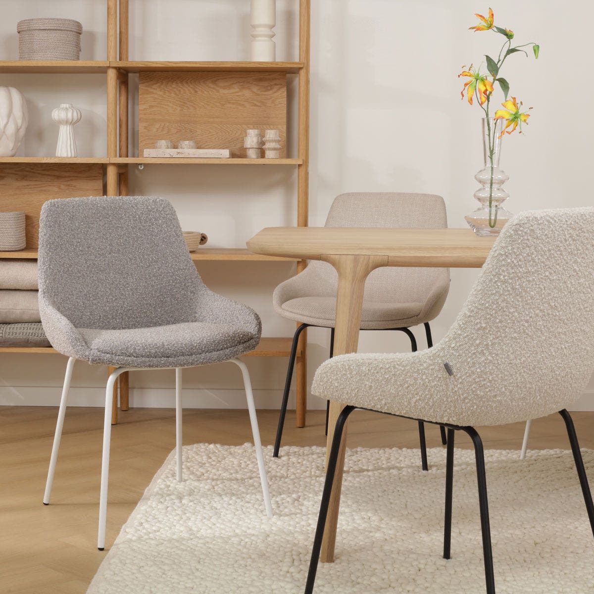 Verrijk jouw eetkamer met de moderne Nora-Isa eetkamerstoel bouclé taupe van het merk Nolon.