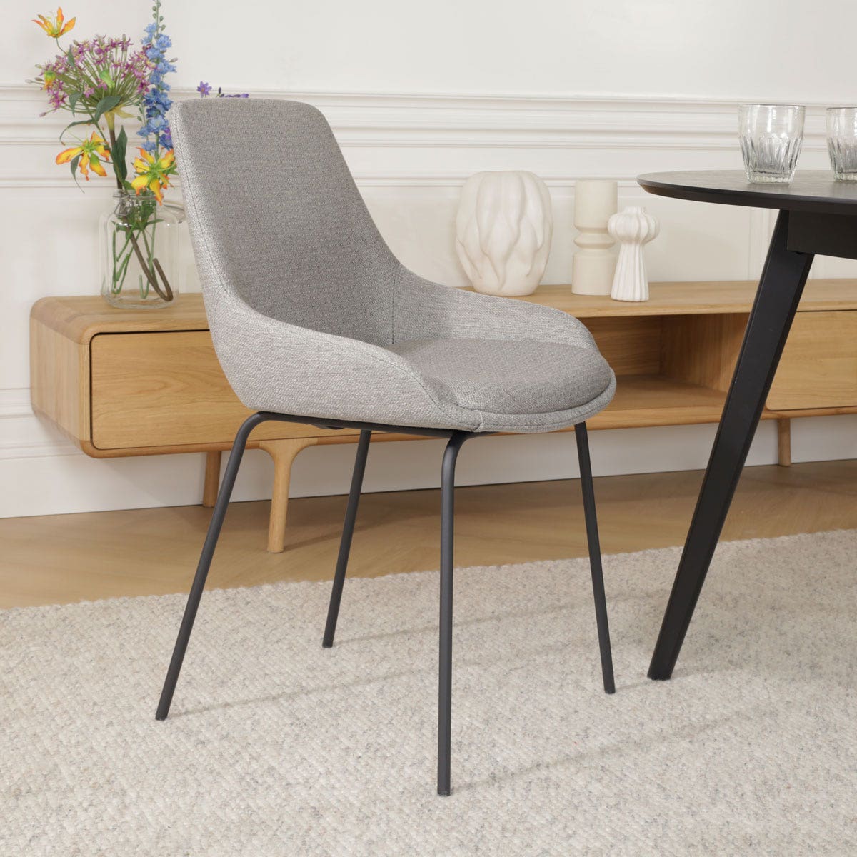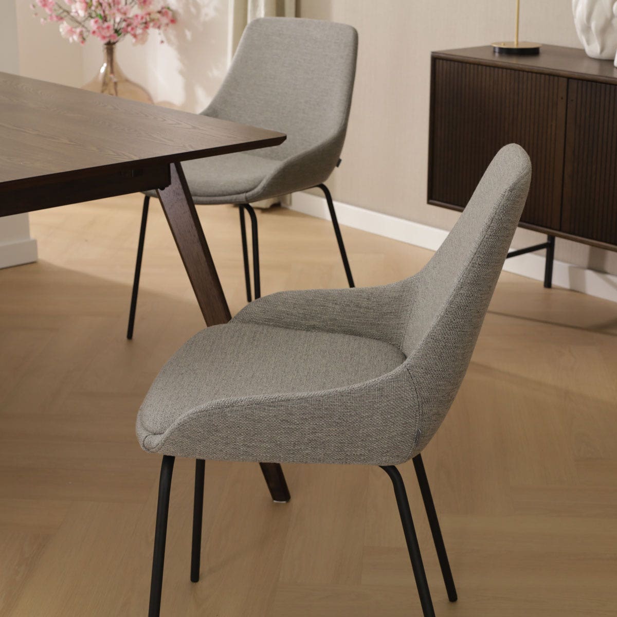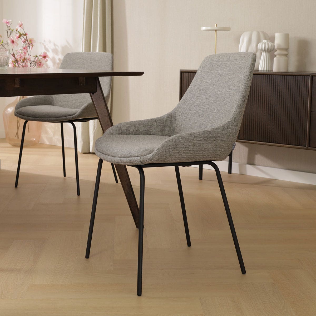 Verrijk jouw eetkamer met de Nora-Isa eetkamerstoel in warm grijs met een zwart metalen onderstel van het merk Nolon.