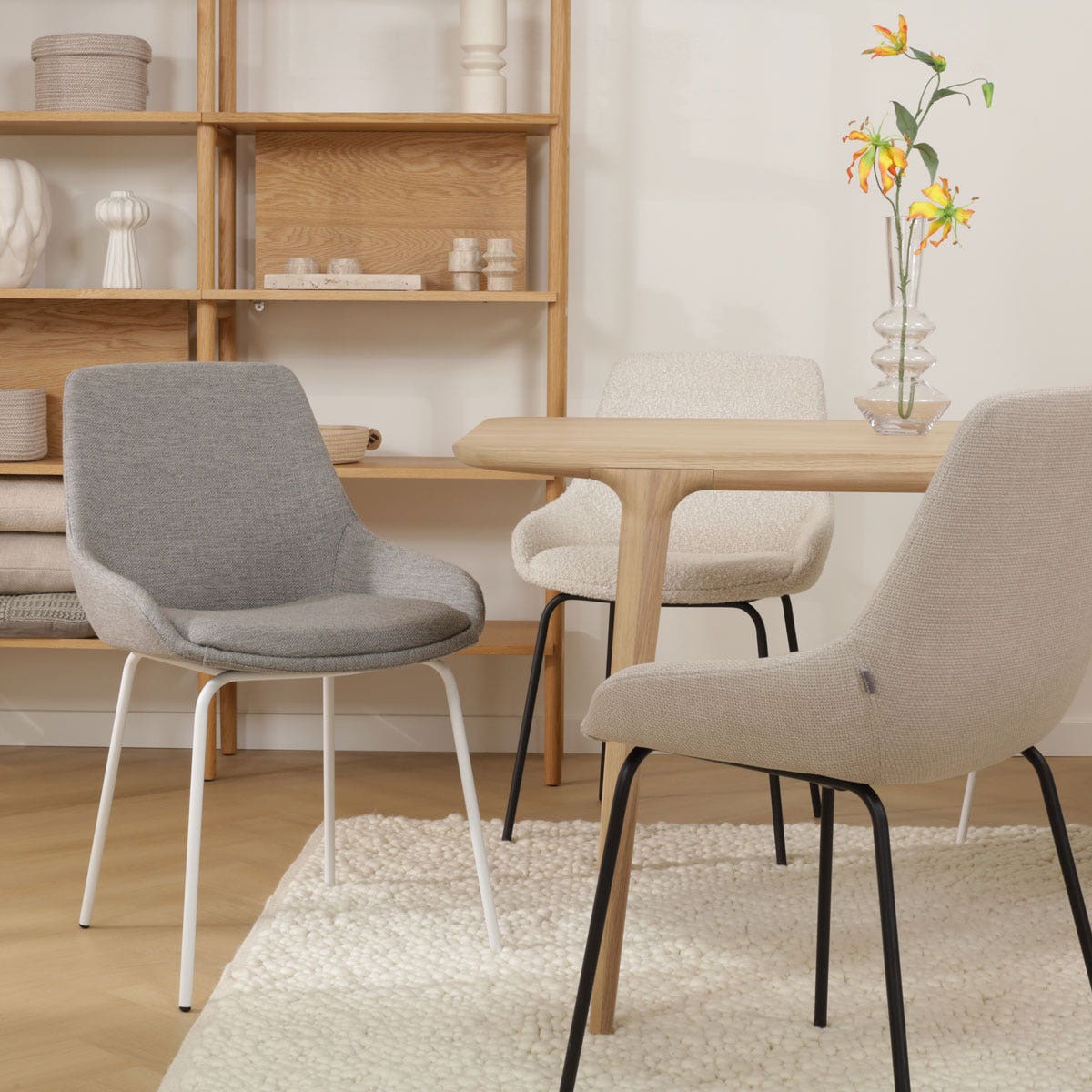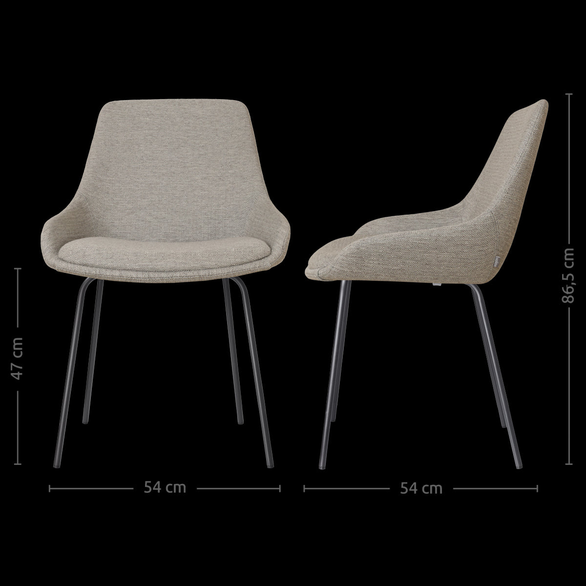 De Nora-Isa eetkamerstoel warm grijs - zwart onderstel is onderdeel van een mix en match collectie. Dit betekent dat zowel het onderstel als de zitting van deze stoel in diverse andere combinaties verkrijgbaar zijn. Zo is de stoel met een wit onderstel en een zwart onderstel verkrijgbaar in de kleuren bouclé taupe, beige, warm grijs, bruin, beige gemêleerd en in het groen. Met het zwarte onderstel biedt de collectie ook bouclé beige en bouclé taupe. Deze varianten bieden voldoende keuze om verschillende interieurstijlen te complementeren en persoonlijke voorkeuren te weerspiegelen.| Afmetingen | |