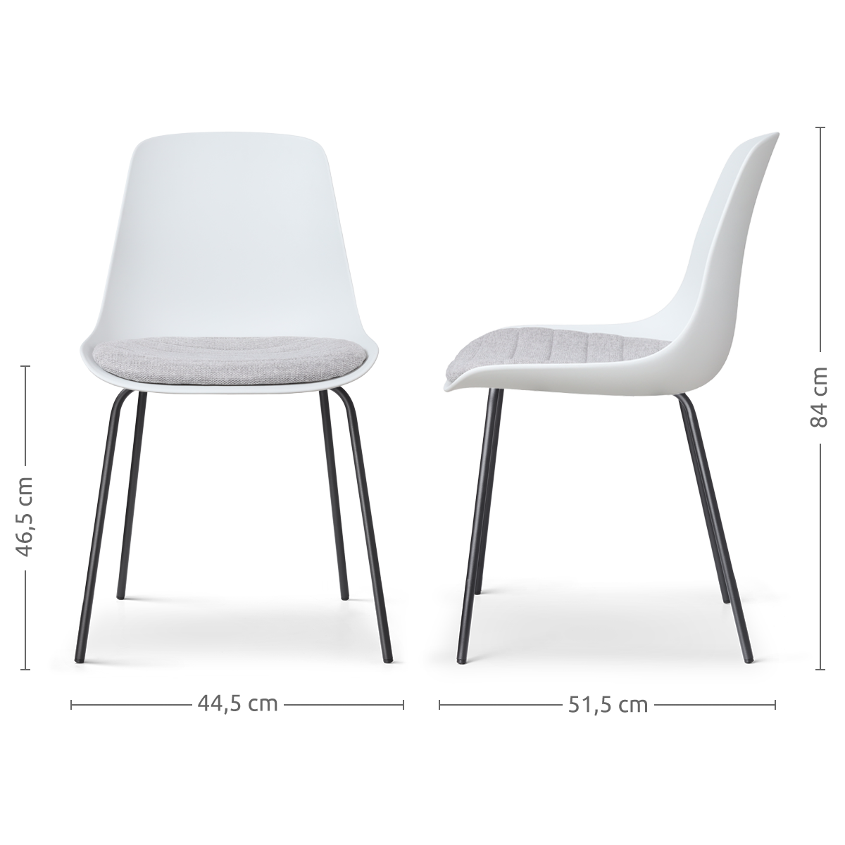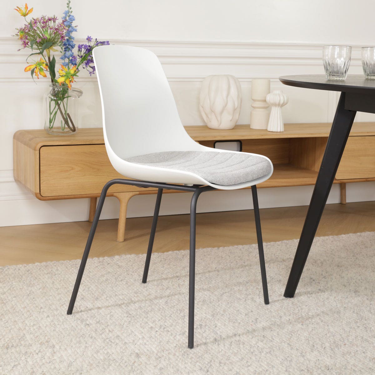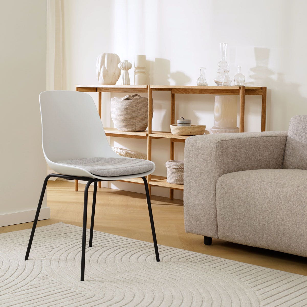 Deze eetkamerstoel combineert verschillende materialen op stijlvolle wijze en geeft de eethoek daarmee een echte upgrade. De duurzame kunststof zitting is niet alleen gemakkelijk schoon te maken, maar biedt ook een stevige en comfortabele basis. Het metalen onderstel met ranke pootjes zorgt ervoor dat de eetkamerstoel stabiel op de grond staat en draagt bij aan het tijdloze karakter van dit ontwerp. Naast de ergonomisch ontworpen kunststof zitting draagt ook het vaste zitkussen bij aan het zitcomfort van deze stoel. Het kussen is bekleed met hoogwaardige stof en is in vijf verschillende kleuren verkrijgbaar. Met een keuze tussen zwart en wit voor de kunststof kuip en daarnaast nog de twee kleuren waarin het Nora onderstel verkrijgbaar is, is de Nora-Liv eetkamerstoel in ieder interieur te combineren.