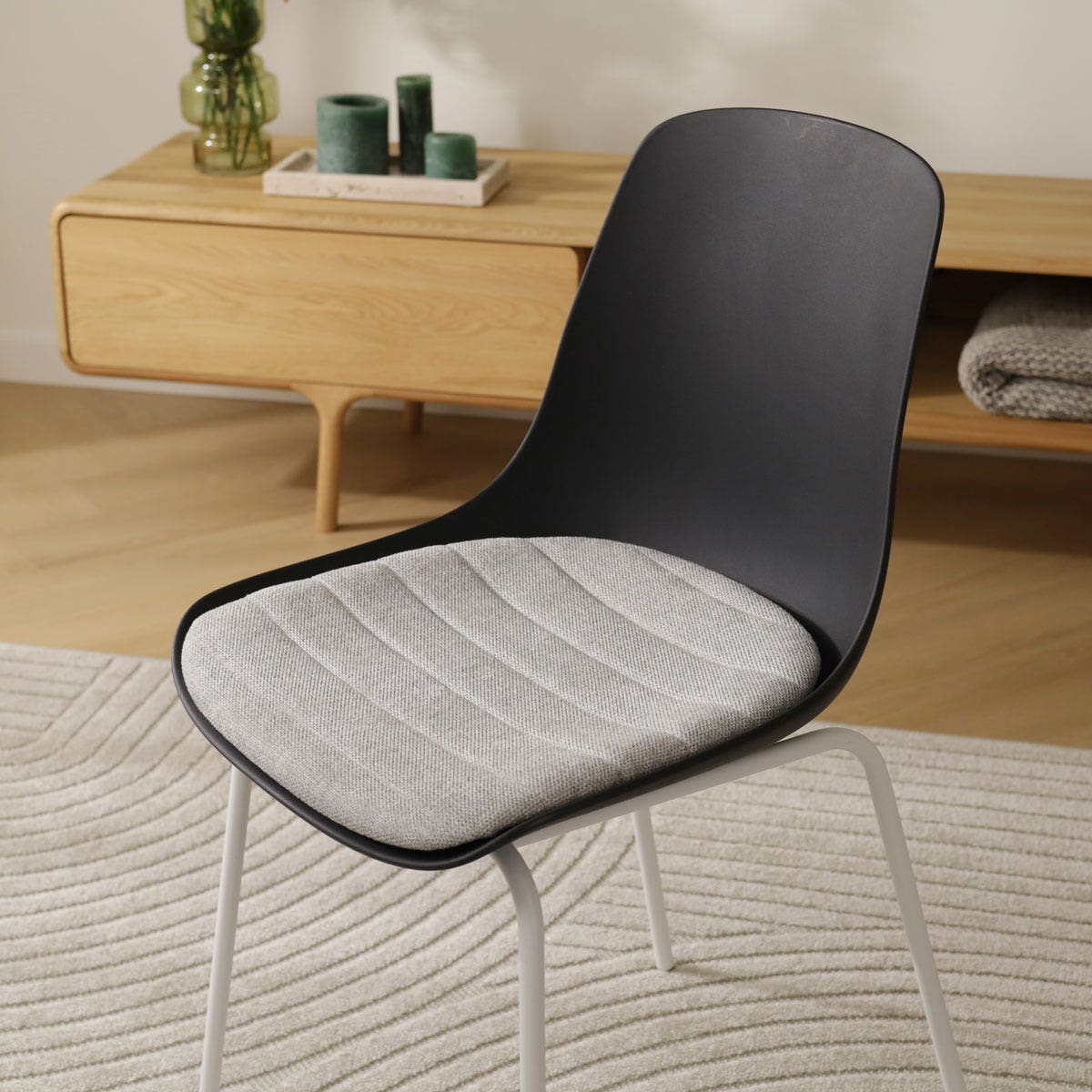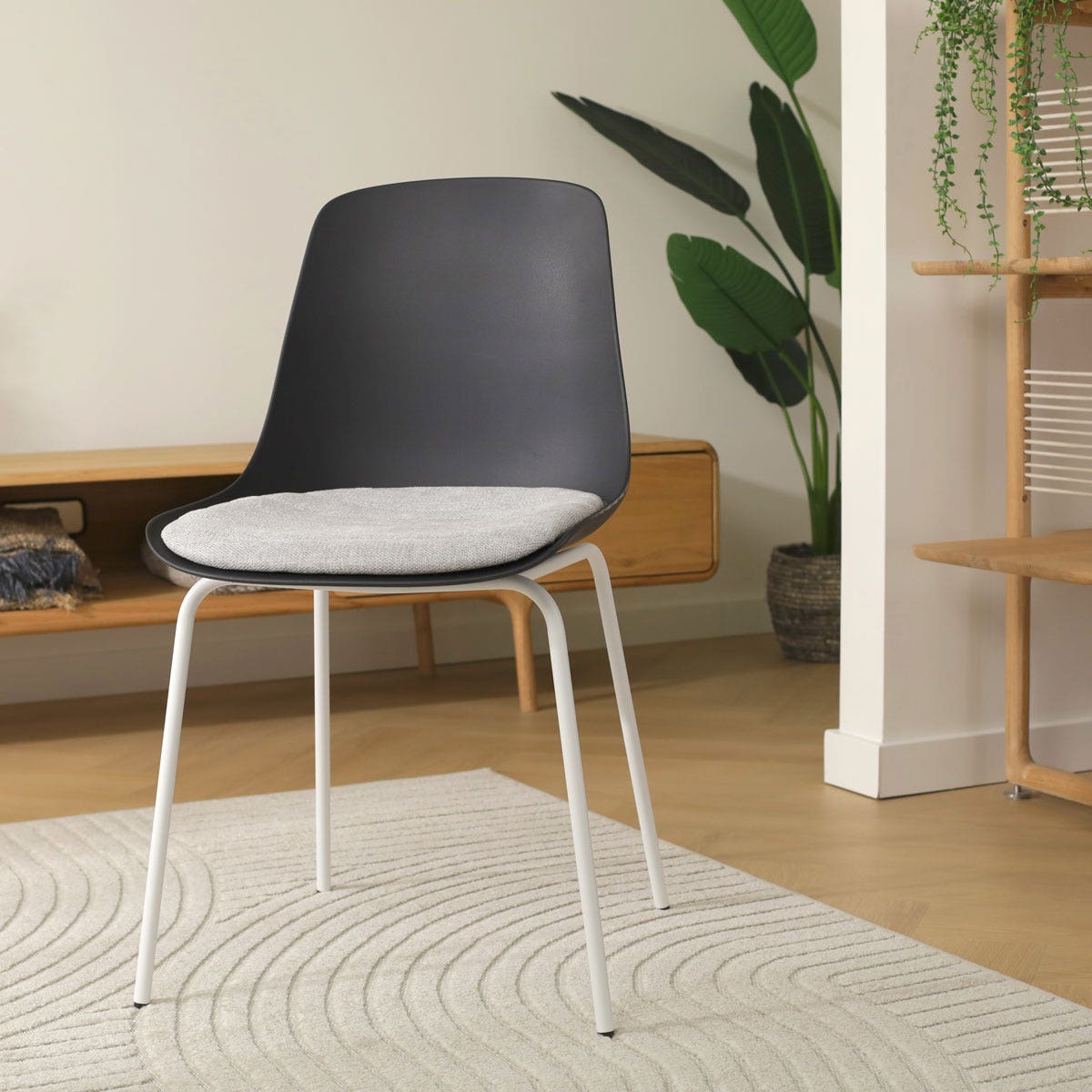 Deze eetkamerstoel combineert verschillende materialen op stijlvolle wijze en geeft de eethoek daarmee een echte upgrade. De duurzame kunststof zitting is niet alleen gemakkelijk schoon te maken, maar biedt ook een stevige en comfortabele basis. Het metalen onderstel met ranke pootjes zorgt ervoor dat de eetkamerstoel stabiel op de grond staat en draagt bij aan het tijdloze karakter van dit ontwerp. Naast de ergonomisch ontworpen kunststof zitting draagt ook het vaste zitkussen bij aan het zitcomfort van deze stoel. Het kussen is bekleed met hoogwaardige stof en is in vijf verschillende kleuren verkrijgbaar. Met een keuze tussen zwart en wit voor de kunststof kuip en daarnaast nog de twee kleuren waarin het Nora onderstel verkrijgbaar is, is de Nora-Liv eetkamerstoel in ieder interieur te combineren.