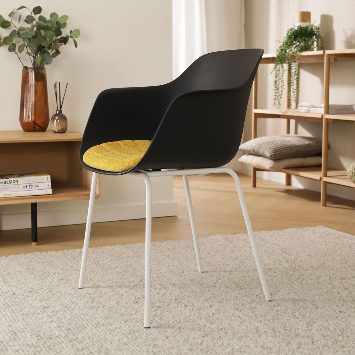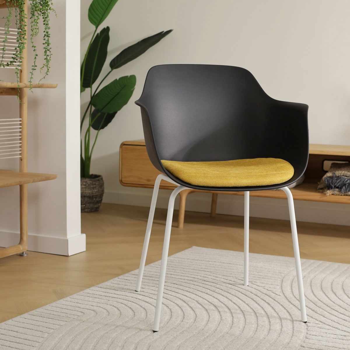 De zitting van deze eetkamerstoel is verkrijgbaar in het kunststof en je kunt kiezen uit verschillende kleuren vaste zitkussens in de stoel. Bovendien heeft de zitting armleuningen, voor nog meer comfort. Gebruik de stoel in de eetkamer aan de grote eettafel om urenlang te kunnen natafelen, in de slaapkamer om je kleding op te leggen en in de gang om gemakkelijk je schoenen aan- en uit te trekken. Kortom een ideale stoel voor bij jou thuis!