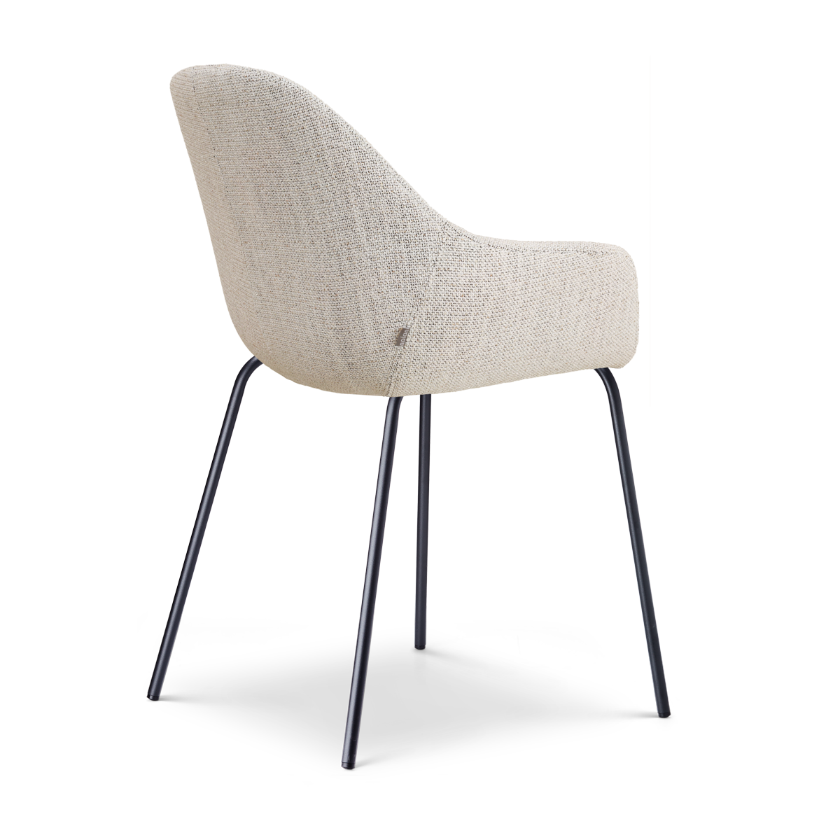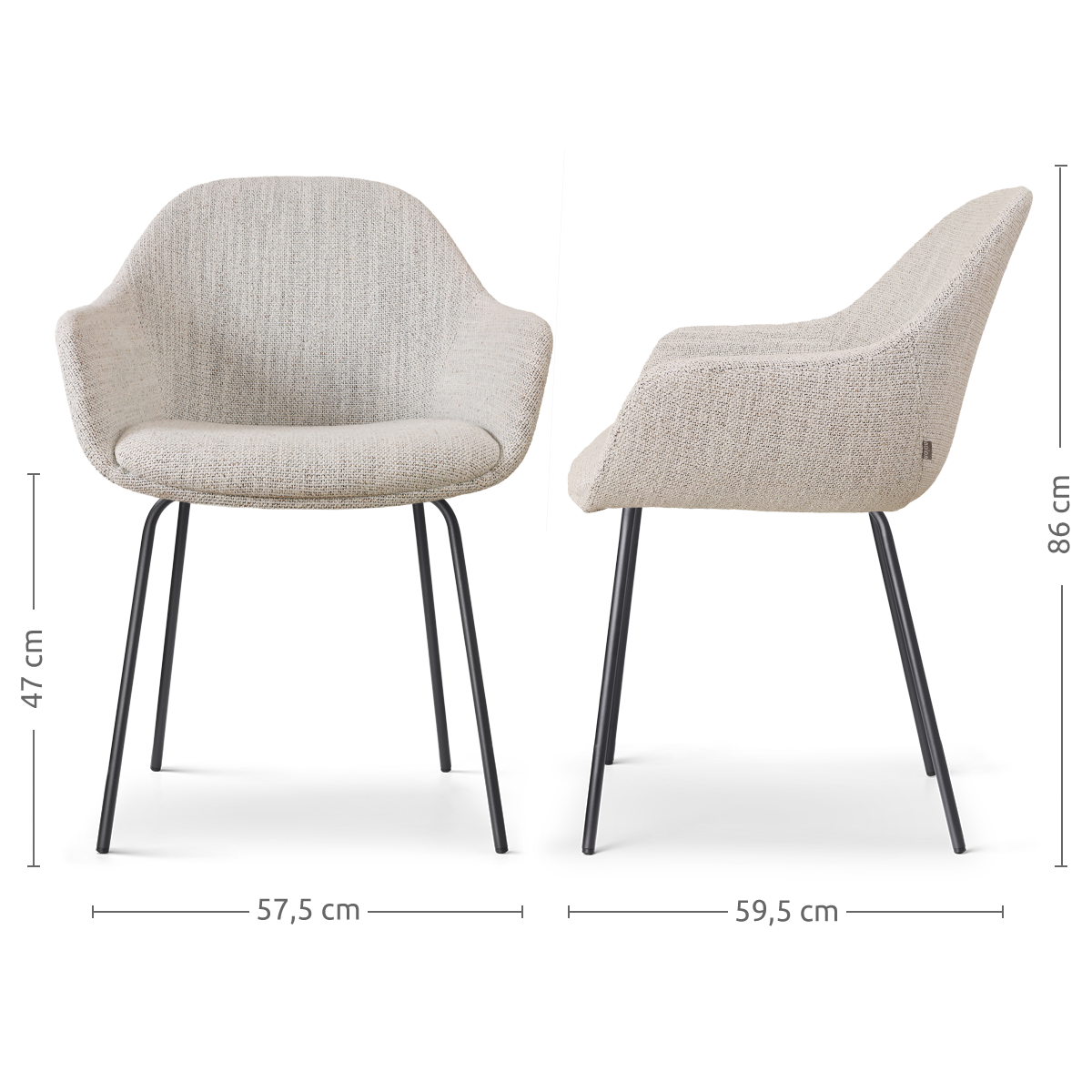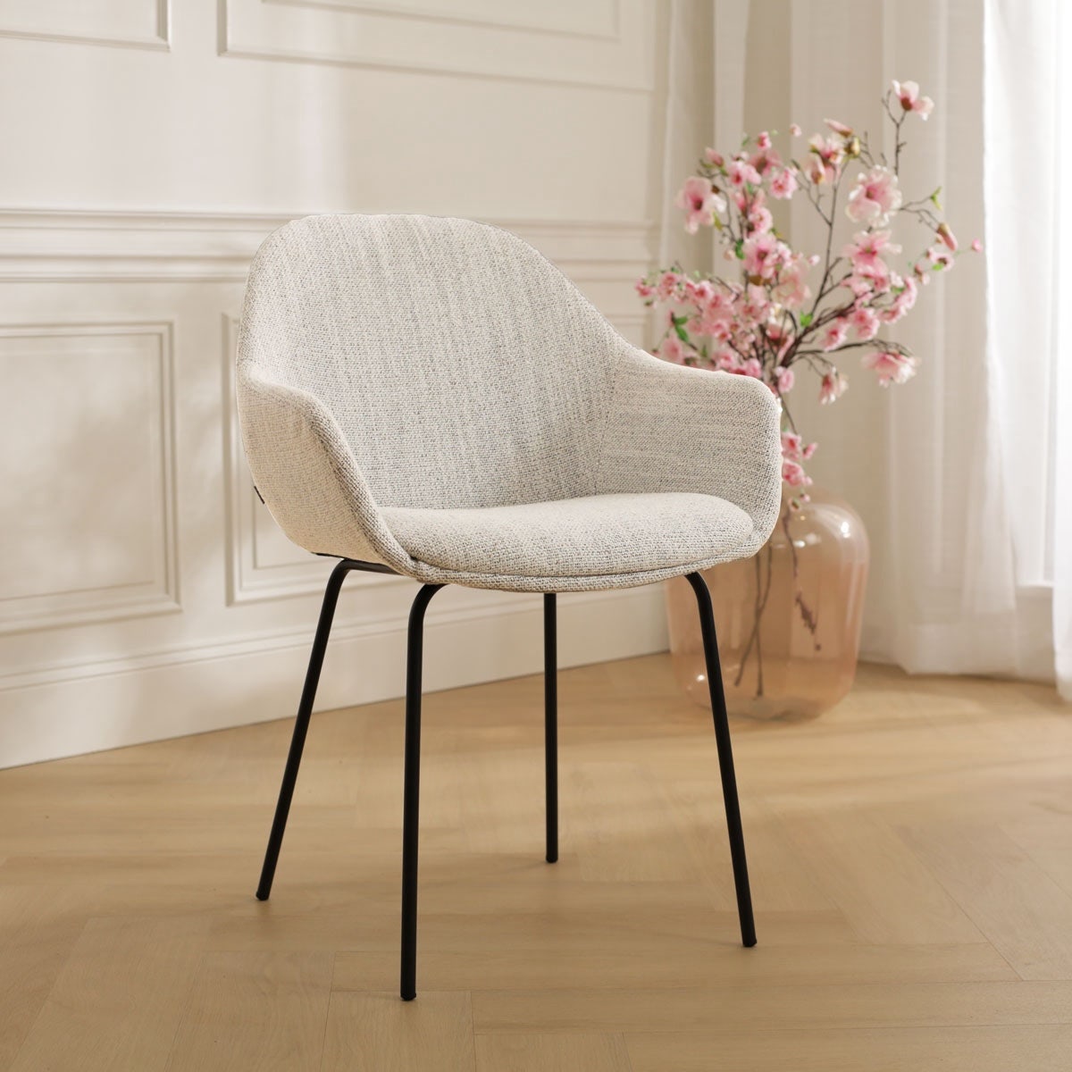 Deze eetkamerstoel is de ideale combinatie van een modern metalen onderstel met een uitnodigende stoffen zitting. Dankzij de zachte beige gemêleerde bekleding zit je urenlang comfortabel aan het diner. Het ranke onderstel met de vier metalen poten zorgt voor een stabiele zit en geeft de eetkamerstoel de nodige elegantie. De comfortabele zitting is daarnaast voorzien van armleuningen, zodat urenlang natafelen geen enkel probleem is. De Nora-Mae eetkamerstoel heeft een rugleuning in ronde vorm en ook de andere hoeken van de zitting zijn mooi afgerond, wat de stoel een zachte en organische uitstraling geeft. De combinatie van de beige zitting met de zwarte poten maakt deze eettafelstoel een perfecte match met vrijwel alle woonstijlen, maar vooral een Scandinavisch of een industrieel interieur.