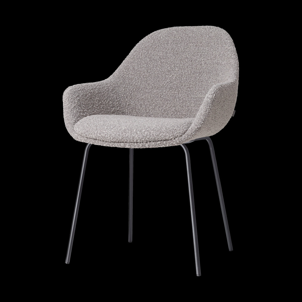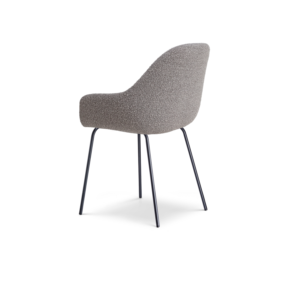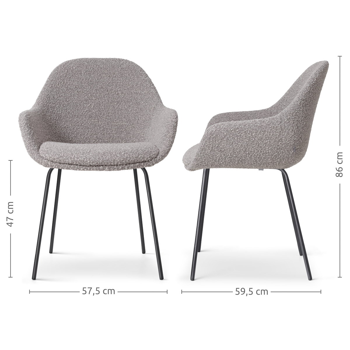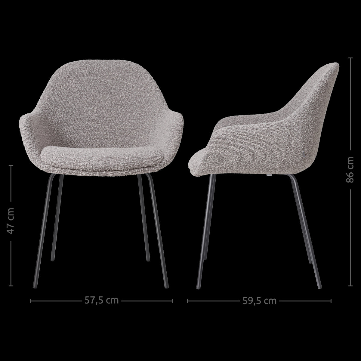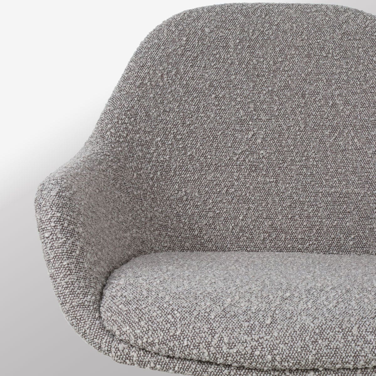 Moderne taupe eetkamerstoel in bouclé stof - zwart frame - met armleuning Nora-Mae.