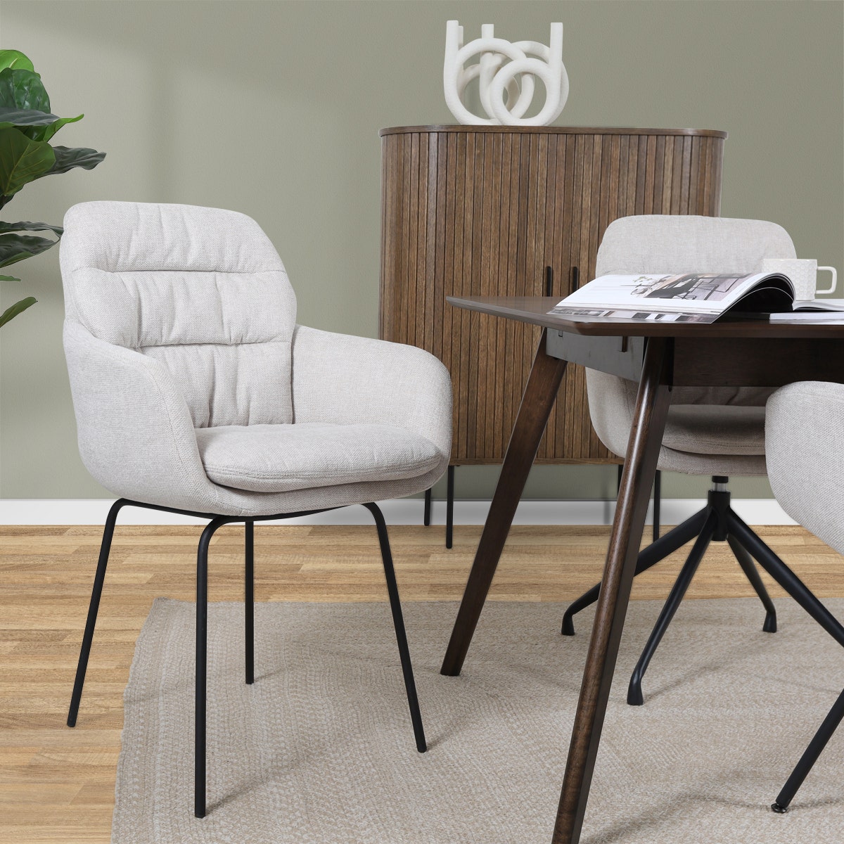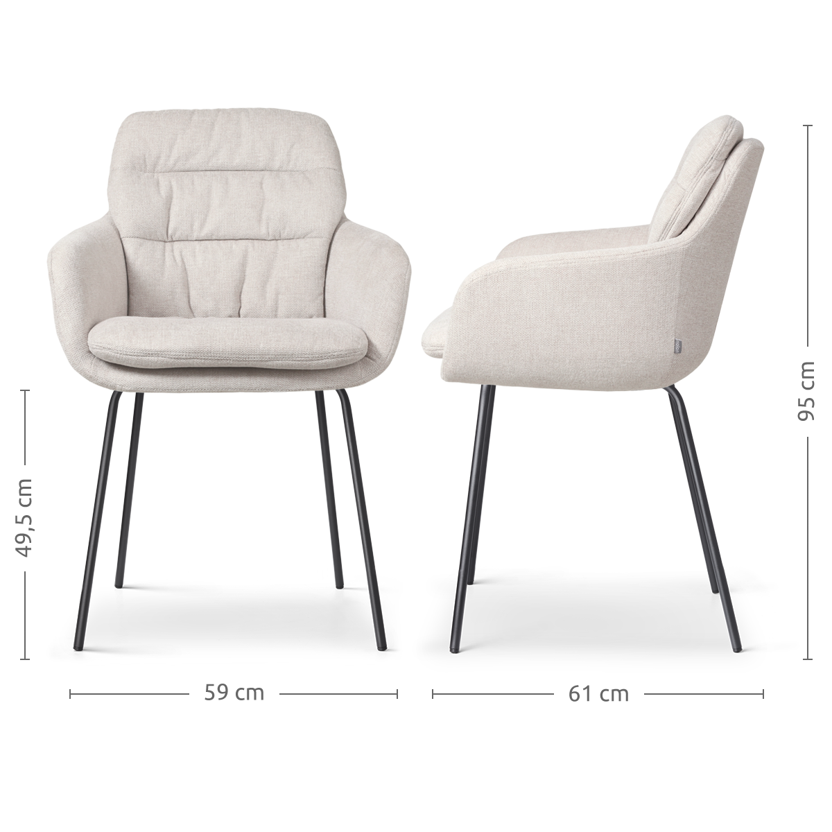 Deze eetkamerstoel is niet alleen een lust voor het oog, maar ook een genot om op te zitten. De luxe zitting is ontworpen met een hoge rugleuning en armleuningen om het lichaam optimale ondersteuning te bieden tijdens uitgebreide diners. Het vaste zitkussen zorgt ervoor dat je extra zacht zit en ook de stoffen bekleding draagt bij aan het comfort. Het minimalistische metalen onderstel heeft slanke, ronde pootjes en vormt een perfect contrast met de zitting. De hoogwaardige materialen van deze eetkamerstoel garanderen duurzaamheid en langdurig gebruik. Met de Nora-Mia eetkamerstoel is comfortabel aan tafel zitten een zekerheid en zorg je daarnaast dus ook nog eens voor een stijlvolle toevoeging aan de eethoek.
