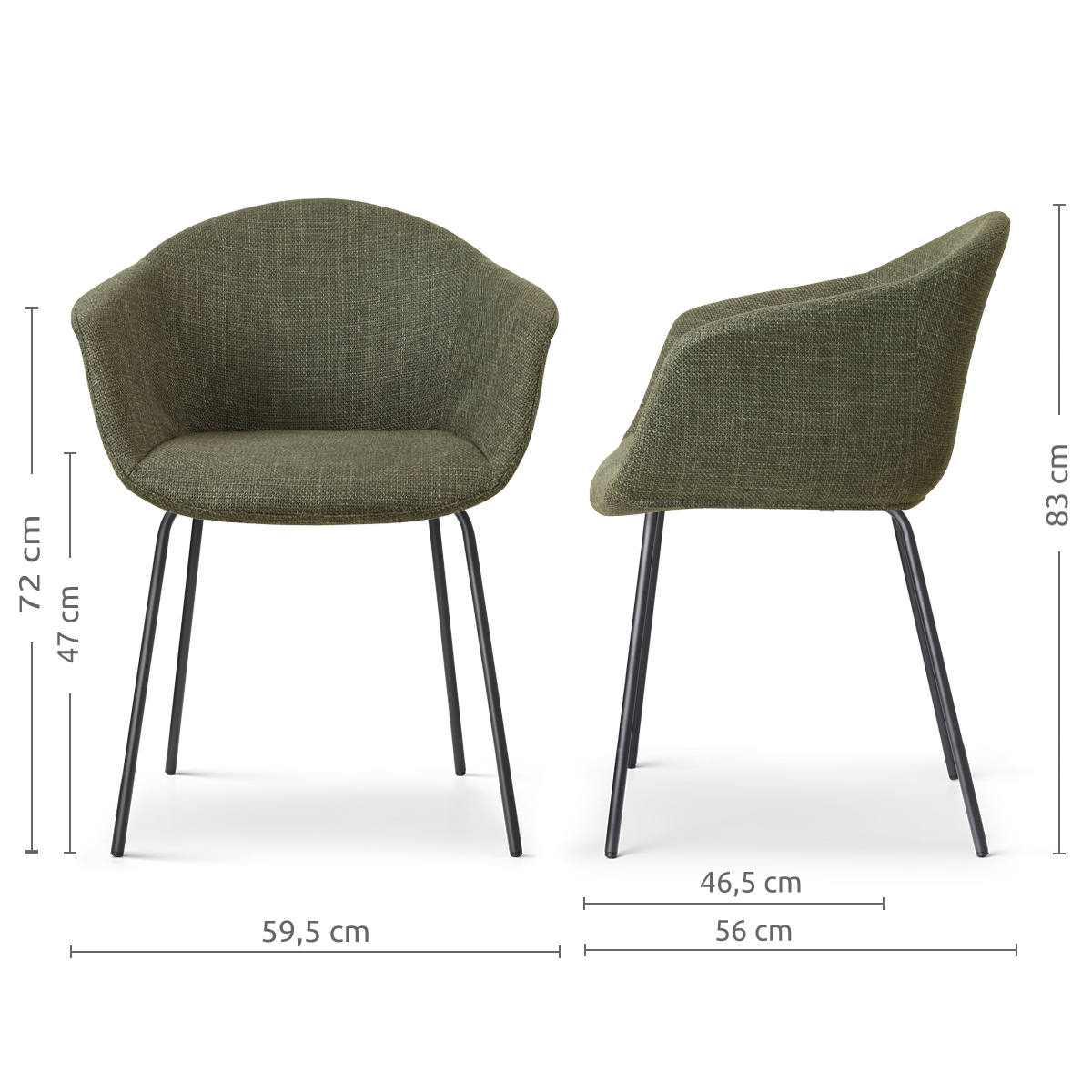 De Nora-Otis eetkamerstoel met armleuningen van Nolon is onderdeel van een mix en match collectie. Dit betekent dat zowel het onderstel als de zitting van deze stoel in diverse andere combinaties verkrijgbaar zijn. De Otis zitting is verkrijgbaar in verschillende stoffen en kleuren, maar het metalen Nora onderstel kan ook gecombineerd worden met één van de andere zittingen van Nolon. De Otis zitting kan juist weer worden gecombineerd met alle andere onderstellen, zoals een draaibaar onderstel of een onderstel met houten poten.