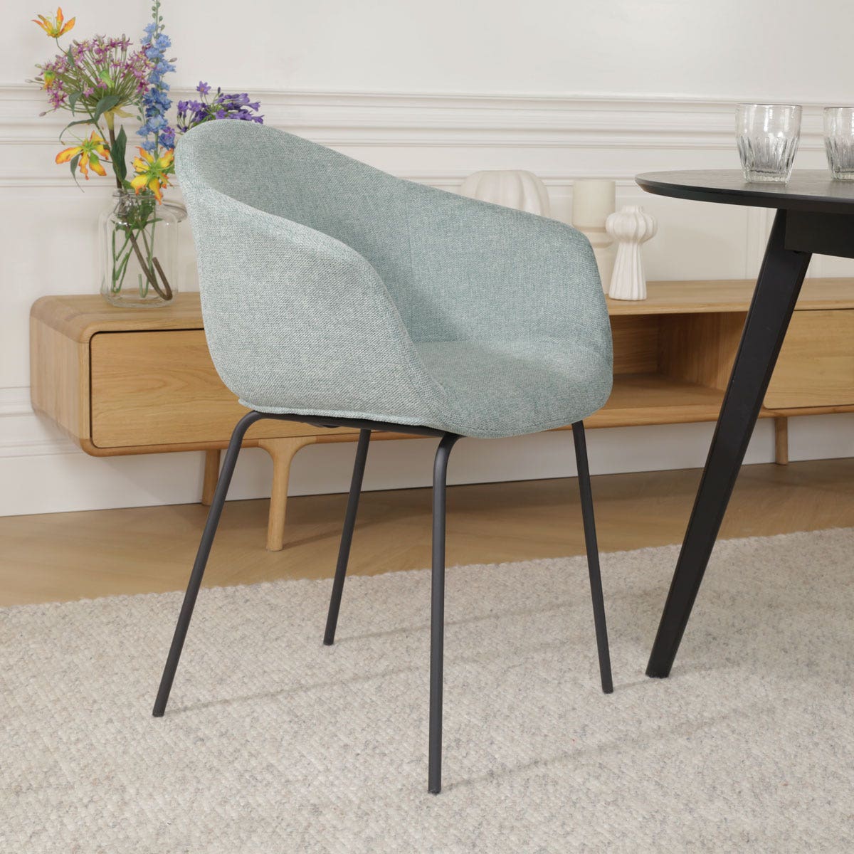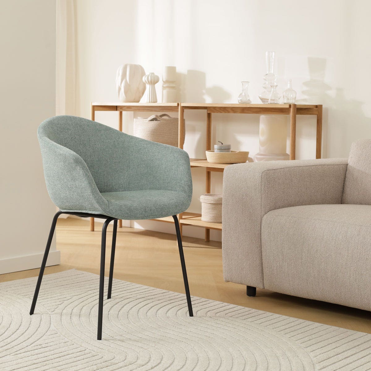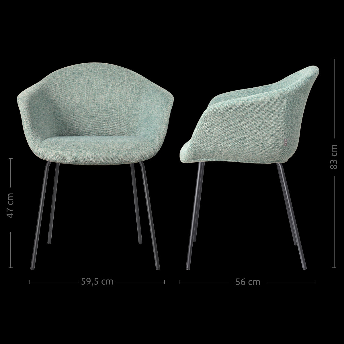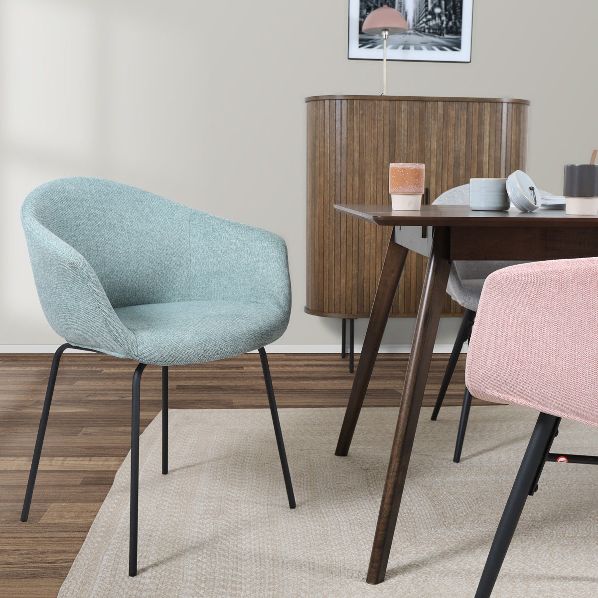 Deze eetkamerstoel heeft elegante uitstraling dankzij het ranke onderstel met vier ronde poten en een comfortabele zit door de ergonomisch gevormde kuipzitting. De stoffen bekleding zorgt voor een warm gevoel en maakt de eetkamer een uitnodigende plek voor vrienden en familie. Het stevige metalen onderstel zorgt ervoor dat de stoel stevig op de grond staat. De gestoffeerde zitting is voorzien van armleuningen om optimaal comfort te bieden tijdens gezellige diners of borrelavonden. In combinatie met de passieve zithouding van deze kuip zit je dus altijd ontspannen aan tafel. Maak een keuze uit één van de zes verschillende kleuren stoffen bekleding en geef jouw eethoek een stijlvolle upgrade.