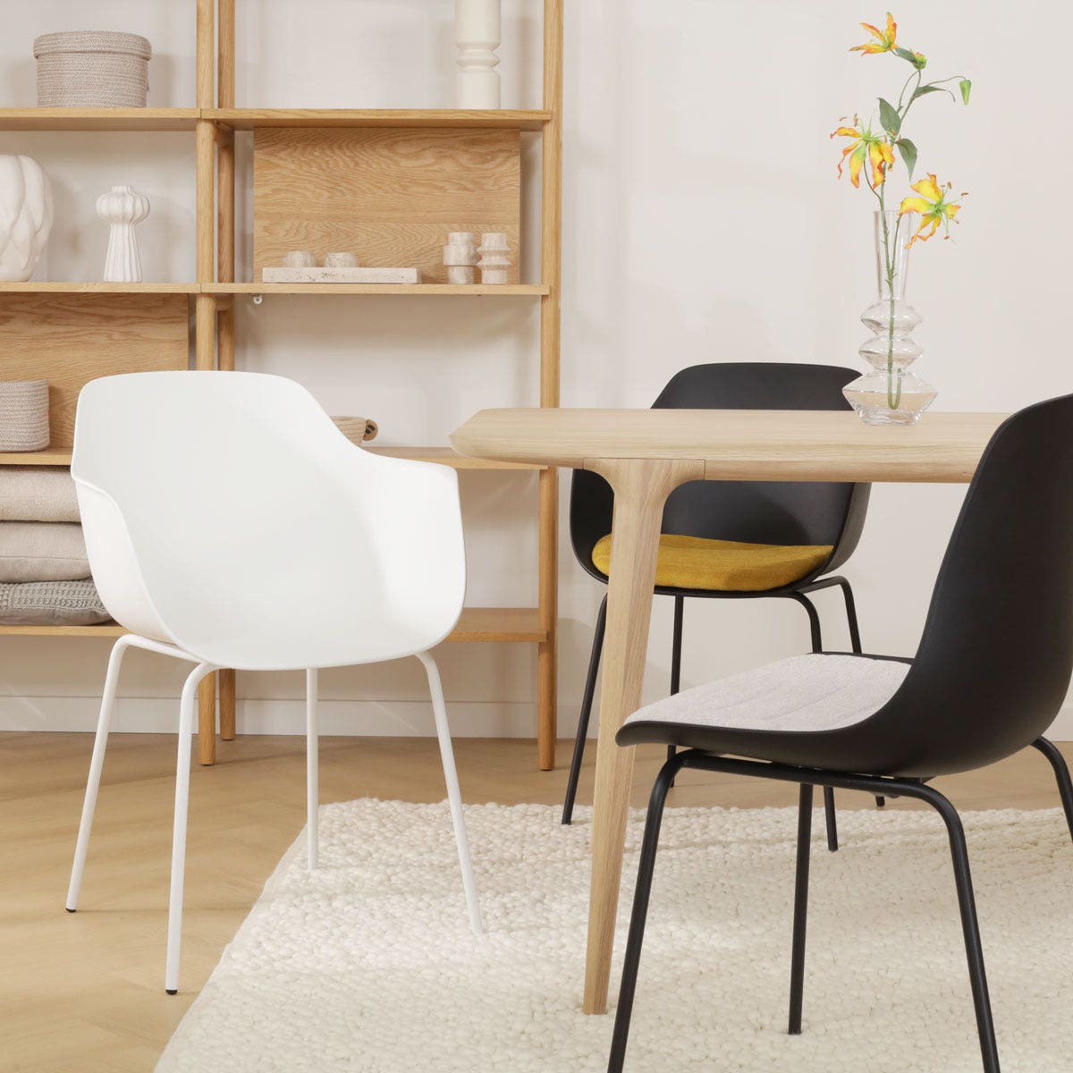 - Wil je wat extra comfort? Combineer de stoel met het Fem zitkussen, beschikbaar in 17 kleuren, om je eetkamer een persoonlijke touch te geven.
