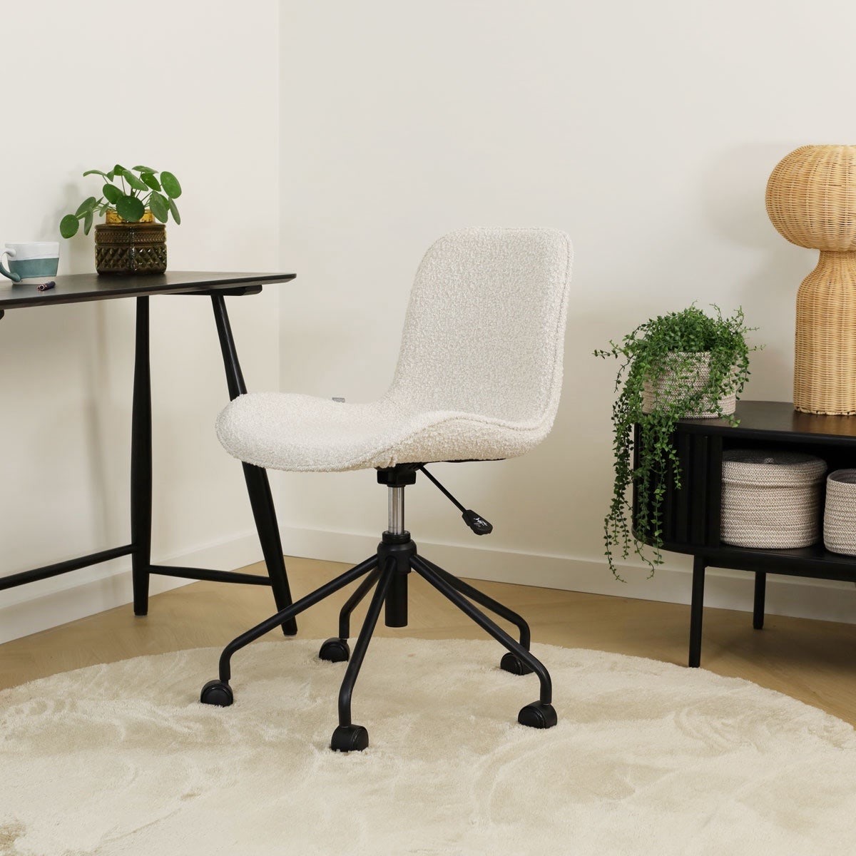 Deze bureaustoel is de ideale keuze als je op zoekt bent naar een exemplaar dat stijlvol, comfortabel en functioneel tegelijk is. Het metalen onderstel van deze bureaustoel is in hoogte verstelbaar, zodat je overal op de juiste zithoogte zit. De zitting kan 360 graden draaien op het onderstel en de stoel is voorzien van wieltjes, zodat je veel bewegingsvrijheid hebt aan je bureau. De zitting is bekleed met hoogwaardige stof voor een zachte zitervaring, en heeft subtiele rondingen en een gevleugeld zitvlak voor een hoog zitcomfort. Dankzij de actieve zithouding zit je rechtop achter je bureau. Maak een keuze uit de verschillende opties voor de bekleding, waaronder teddy en bouclé, en geef jouw werkruimte een stijlvolle upgrade.