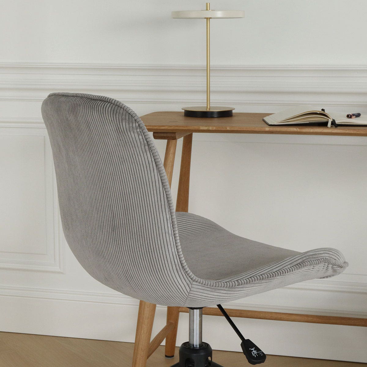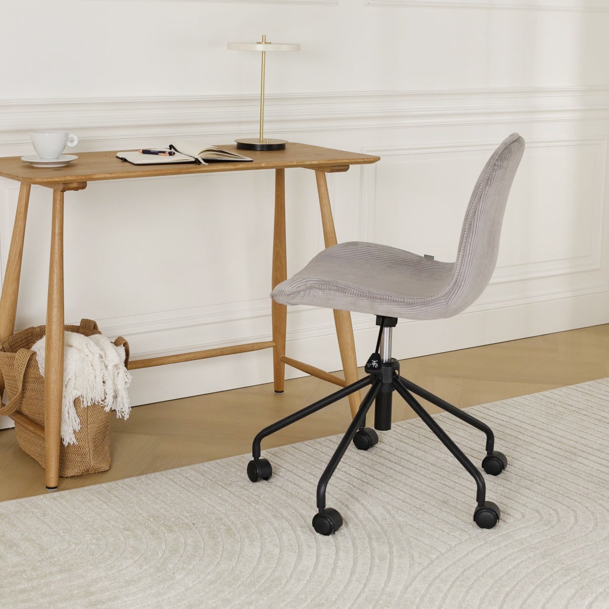 Deze bureaustoel is de ideale keuze als je op zoekt bent naar een exemplaar dat stijlvol, comfortabel en functioneel tegelijk is. Het metalen onderstel van deze bureaustoel is in hoogte verstelbaar, zodat je overal op de juiste zithoogte zit. De zitting kan 360 graden draaien op het onderstel en de stoel is voorzien van wieltjes, zodat je veel bewegingsvrijheid hebt aan je bureau. De zitting is bekleed met hoogwaardige stof voor een zachte zitervaring, en heeft subtiele rondingen en een gevleugeld zitvlak voor een hoog zitcomfort. Dankzij de actieve zithouding zit je rechtop achter je bureau. Maak een keuze uit de verschillende opties voor de bekleding, waaronder teddy en bouclé, en geef jouw werkruimte een stijlvolle upgrade.