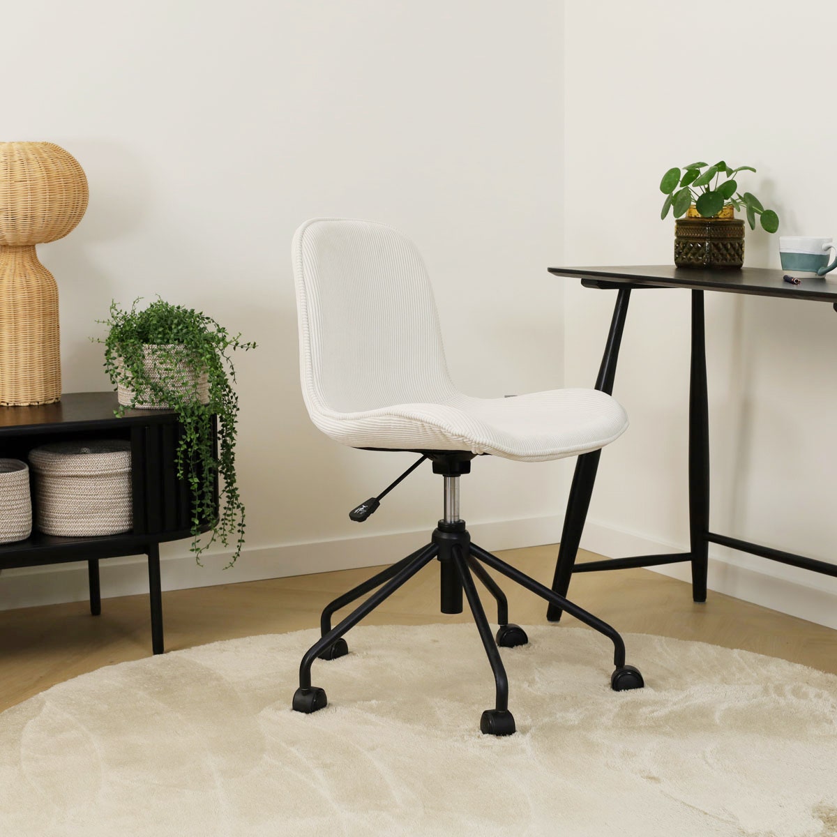 Deze bureaustoelen zijn de ideale keuze als je op zoekt bent naar een exemplaar dat stijlvol, comfortabel en functioneel tegelijk is. Het metalen onderstel van deze bureaustoel is in hoogte verstelbaar, zodat je overal op de juiste zithoogte zit. De zitting kan 360 graden draaien op het onderstel en de stoel is voorzien van wieltjes, zodat je veel bewegingsvrijheid hebt aan je bureau. De zitting is bekleed met hoogwaardige stof voor een zachte zitervaring, en heeft subtiele rondingen en een gevleugeld zitvlak voor een hoog zitcomfort. Dankzij de actieve zithouding zit je rechtop achter je bureau. Maak een keuze uit de verschillende opties voor de bekleding, waaronder teddy en ribstof, en geef jouw werkruimte een stijlvolle upgrade.