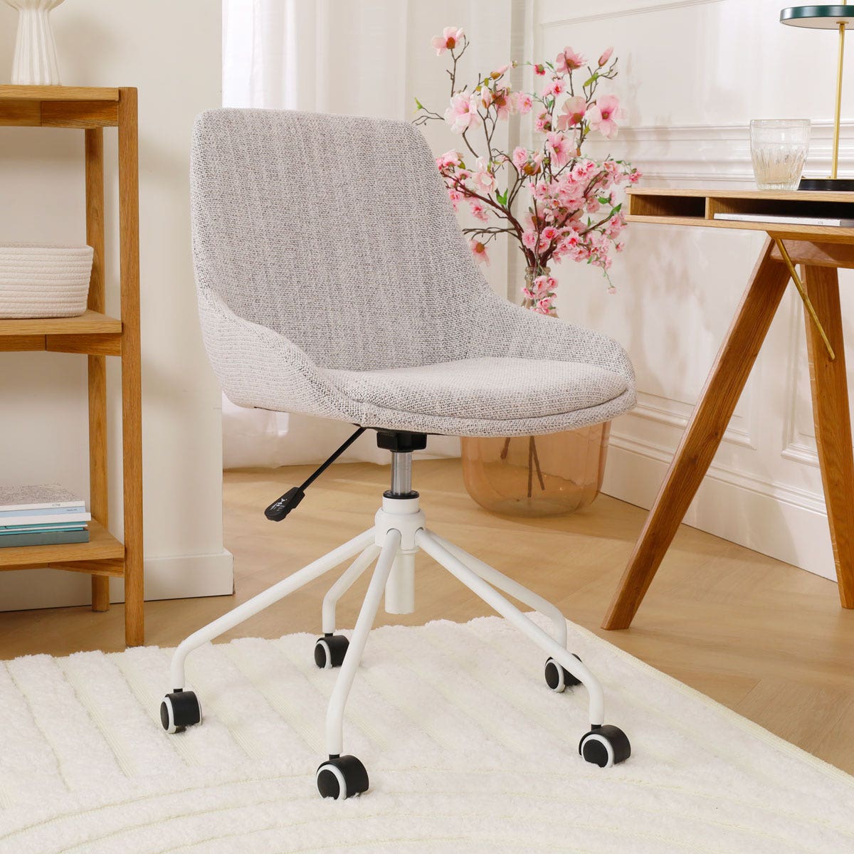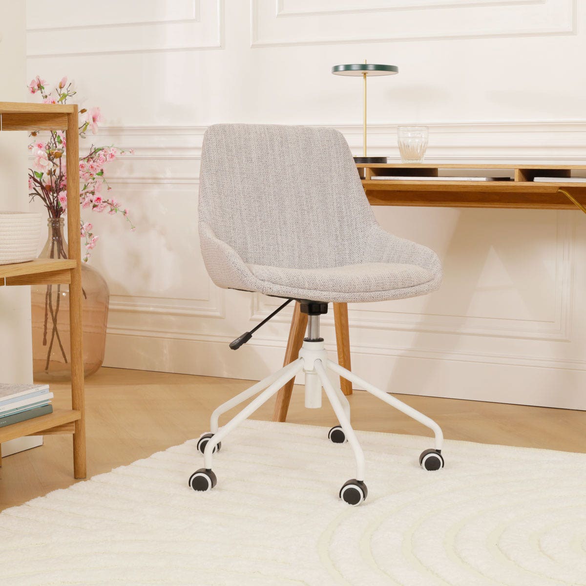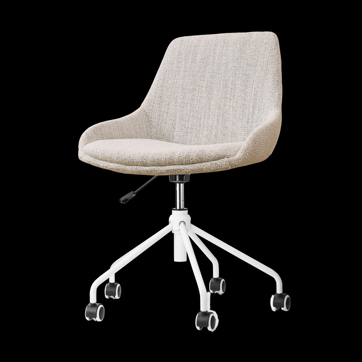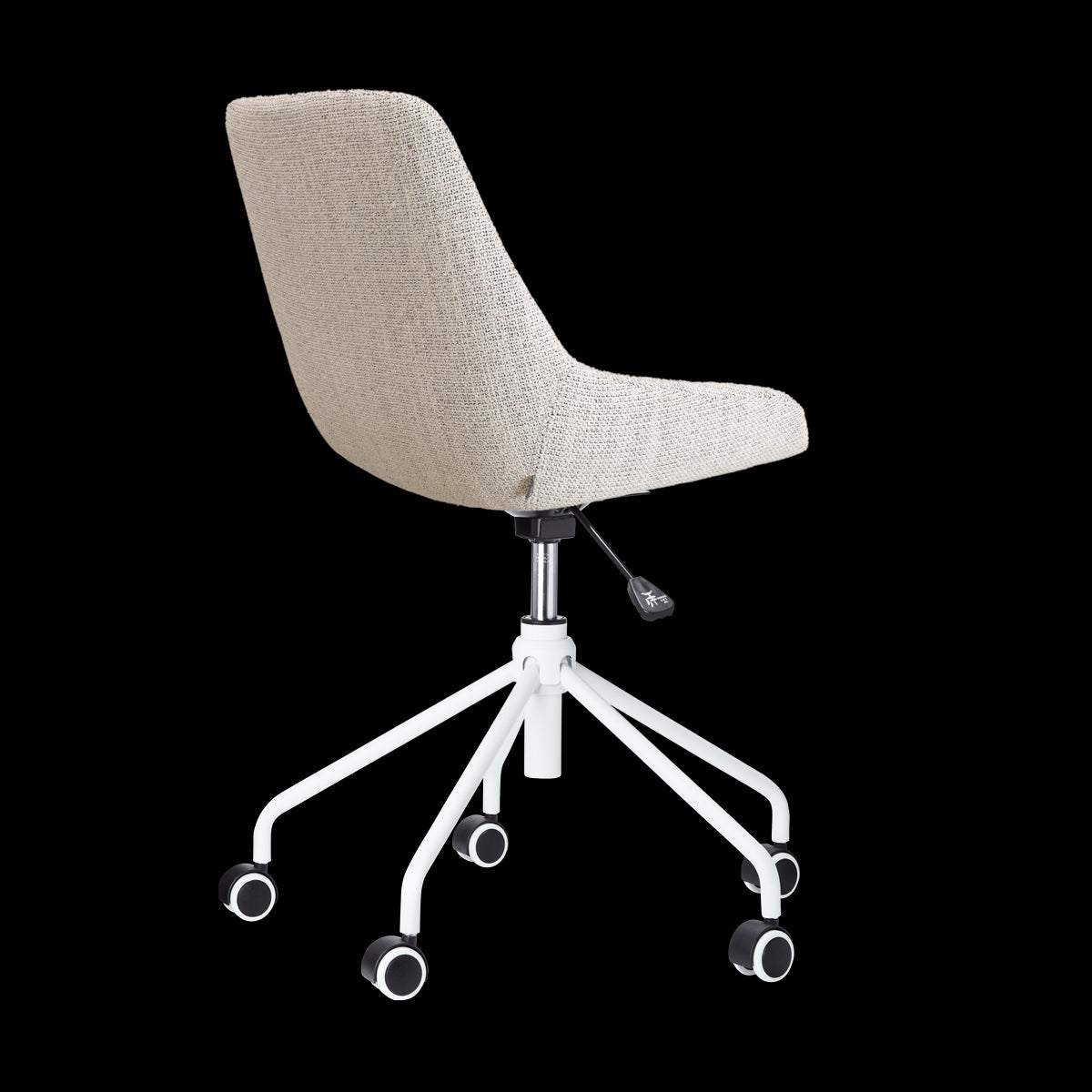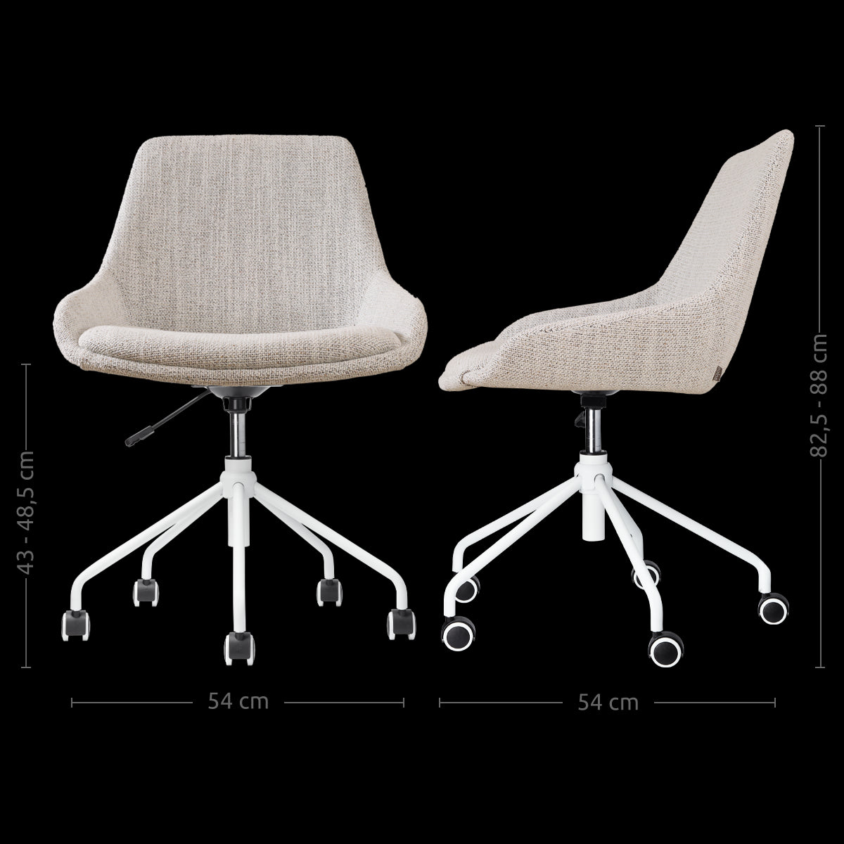 Deze Scandinavisch vormgegeven stoel heeft een beige gemêleerde bekleding en is volledig gestoffeerd, wat een luxe uitstraling geeft en gemakkelijk te combineren is met verschillende interieurstijlen. Het witte metalen onderstel met vijf zwenkwielen zorgt voor flexibiliteit en eenvoud in beweging, terwijl de stoel tevens draaibaar is. Met een zithoogte van 46 cm en een zitdiepte van 40 cm, biedt deze stoel comfort en ondersteuning dankzij de stevige houten kern van de zitting. De afwezigheid van armleuningen maakt dat de stoel minder ruimte inneemt, waardoor hij perfect onder elk bureau past. Met een totale hoogte van 86,5 cm en de optie om de stoel eenvoudig zelf in elkaar te zetten, is de Nout-Isa bureaustoel niet alleen praktisch maar ook een esthetische toevoeging aan je werkruimte. Het gemêleerde textiel geeft een subtiele textuur die bijdraagt aan een ontspannen en stijlvolle werkomgeving.