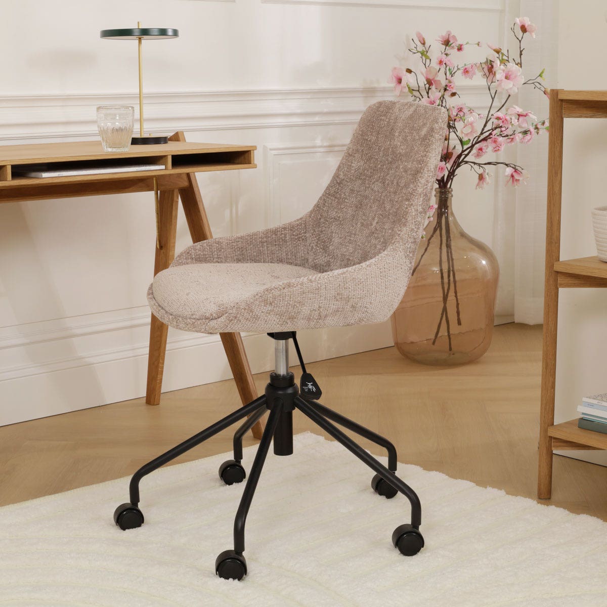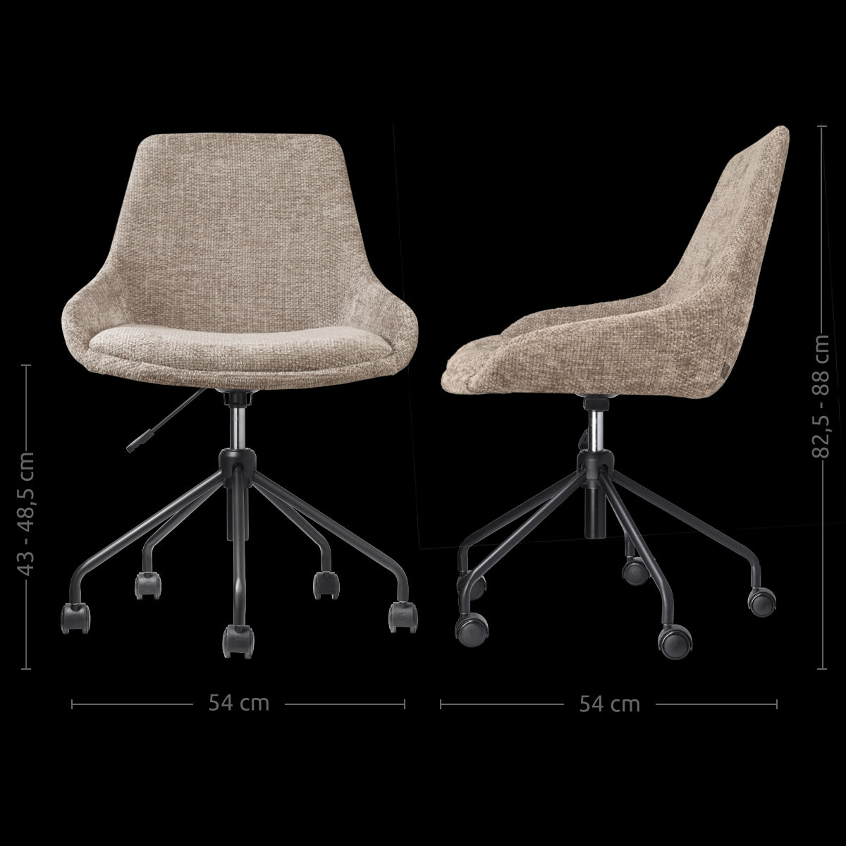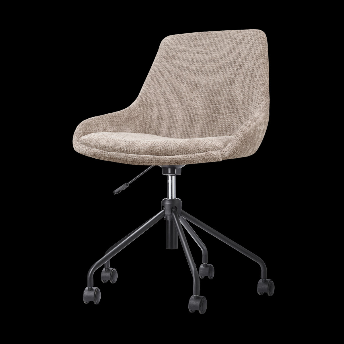 Deze bureaustoel is perfect voor je thuiswerkplek dankzij zijn moderne, trendy uitstraling en praktische functies. Zonder armleuningen biedt hij de vrijheid om gemakkelijk onder elk bureau te passen en de zitting is volledig gestoffeerd voor extra comfort. De Nout-Isa stoel is in hoogte verstelbaar van 43 tot 48,5 centimeter, zodat je altijd de juiste zithouding kunt aannemen. Het draaibare onderstel met vijf wieltjes maakt beweging soepel en eenvoudig, ideaal voor toegang tot verschillende delen van je werkruimte. Met een zithoogte van 46 cm, een totale hoogte van 86,5 cm en een zitdiepte van 40 cm is deze stoel ontworpen met oog voor ergonomie. De metalen poten in zwart zorgen voor stabiliteit en een moderne look. Dit veelzijdige meubelstuk is eenvoudig te monteren zonder gespecialiseerd gereedschap en is onderdeel van de veelzijdige mix en match collectie van Nolon, waardoor je het helemaal naar je eigen smaak kunt samenstellen.