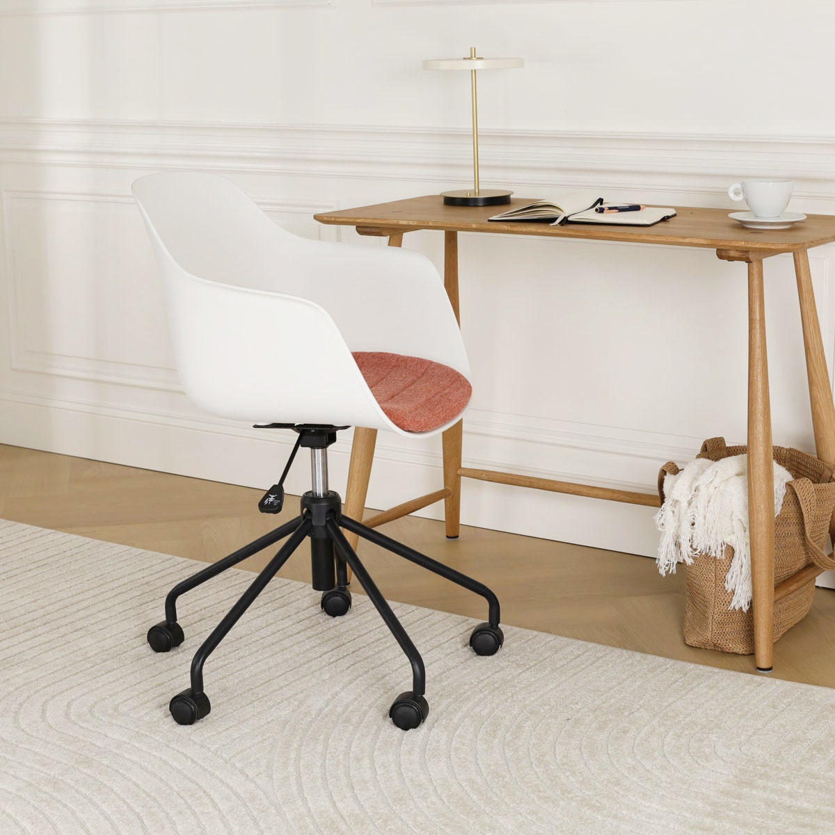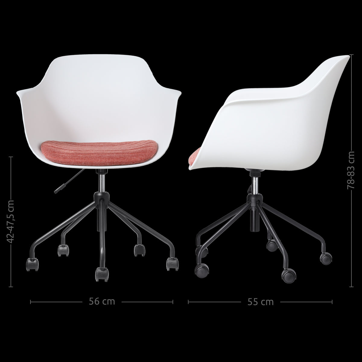 De zitting van de bureaustoel is verkrijgbaar in het kunststof en je kunt kiezen uit verschillende kleuren vaste zitkussens in de stoel. Bovendien heeft de zitting armleuningen, voor net nog iets meer comfort. Het onderstel is gemaakt van metaal en is in hoogte verstelbaar. Kortom, een moderne bureaustoel, waarin je ook lekker zit tijdens lange vergaderingen.