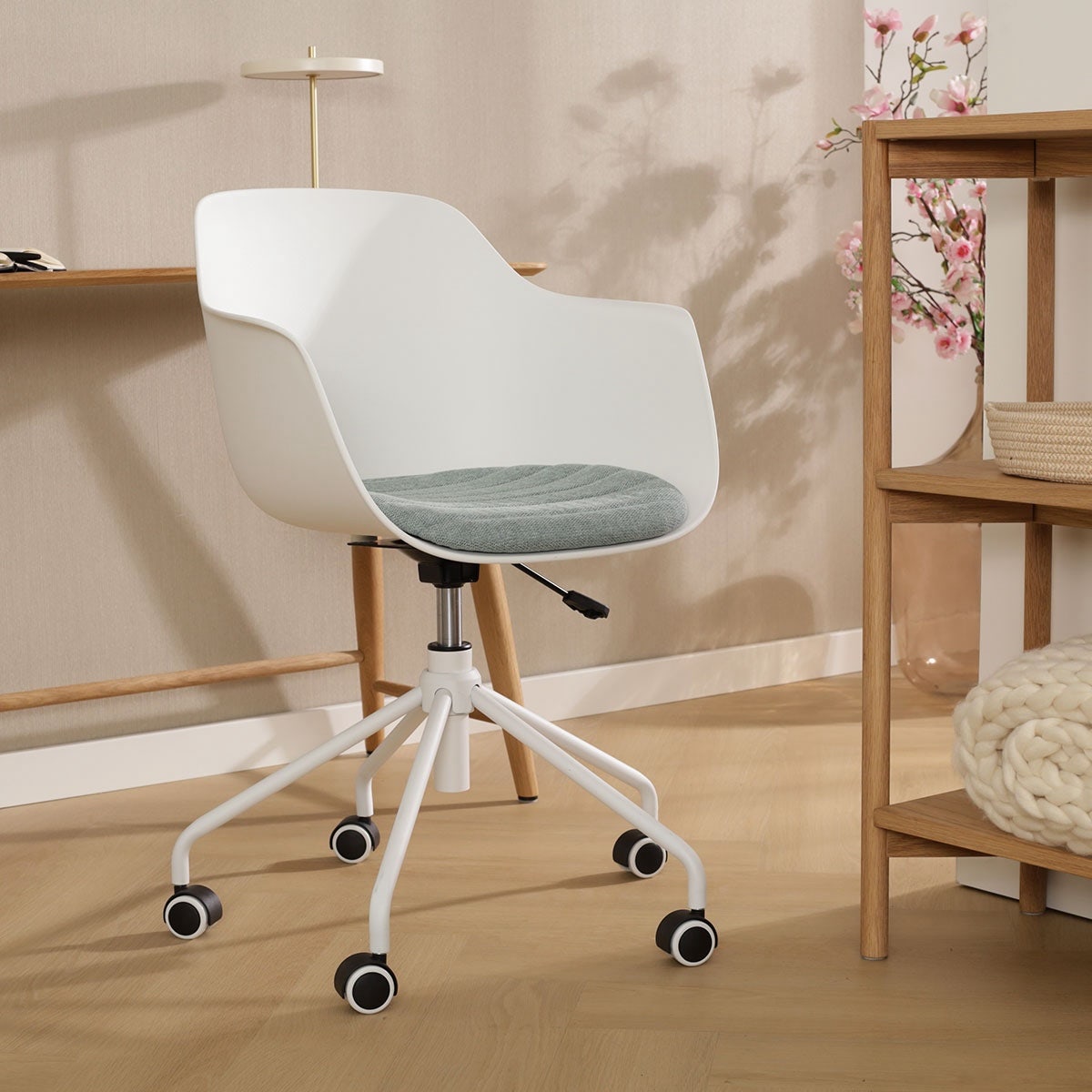 De zitting van de bureaustoel is verkrijgbaar in het kunststof en je kunt kiezen uit verschillende kleuren vaste zitkussens in de stoel. Bovendien heeft de zitting armleuningen, voor net nog iets meer comfort. Het onderstel is gemaakt van metaal en is in hoogte verstelbaar. Kortom, een moderne bureaustoel, waarin je ook lekker zit tijdens lange vergaderingen.