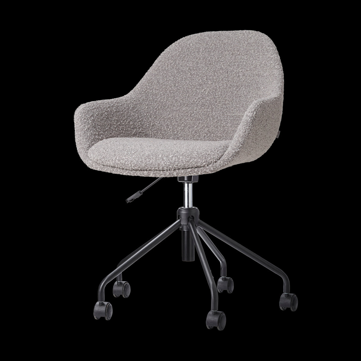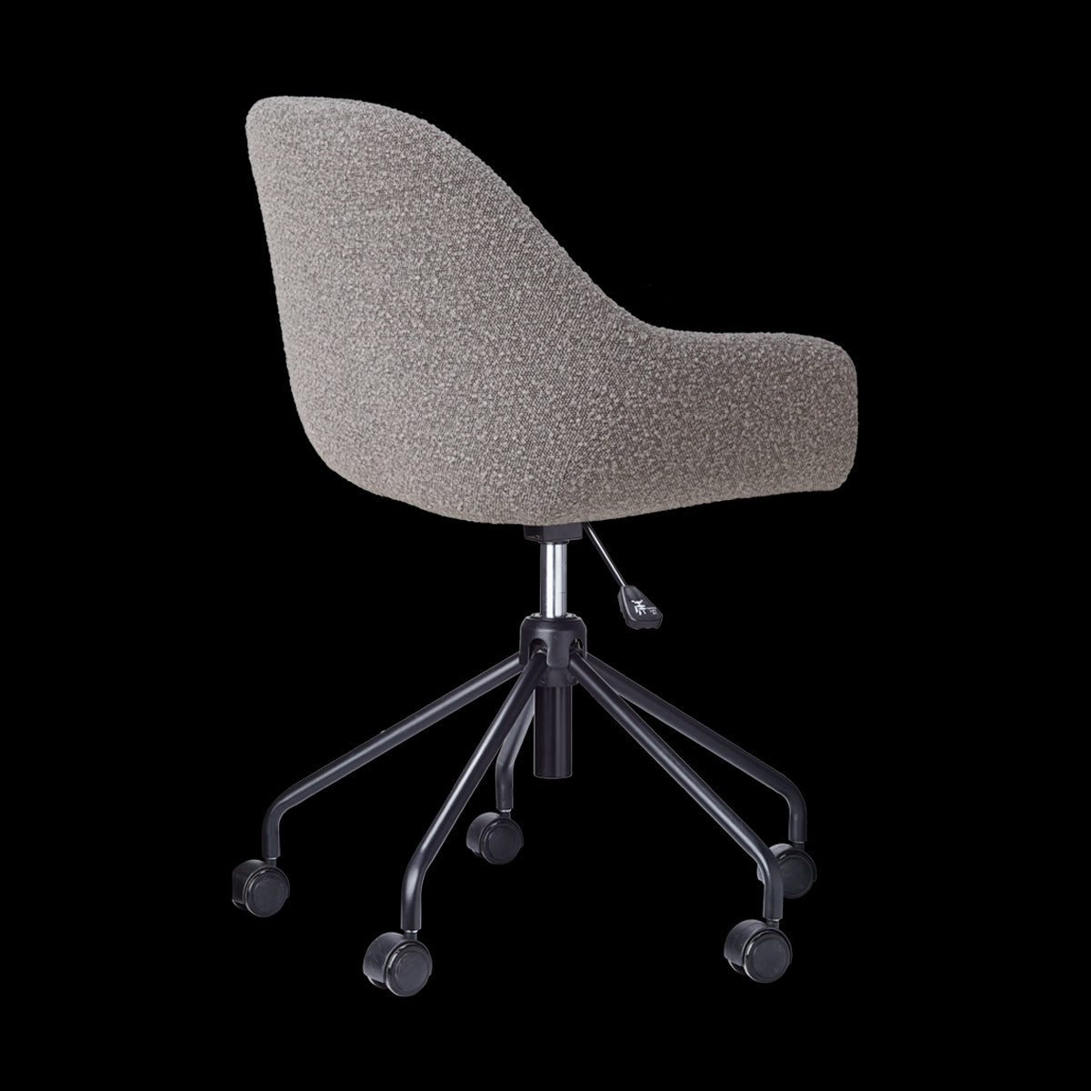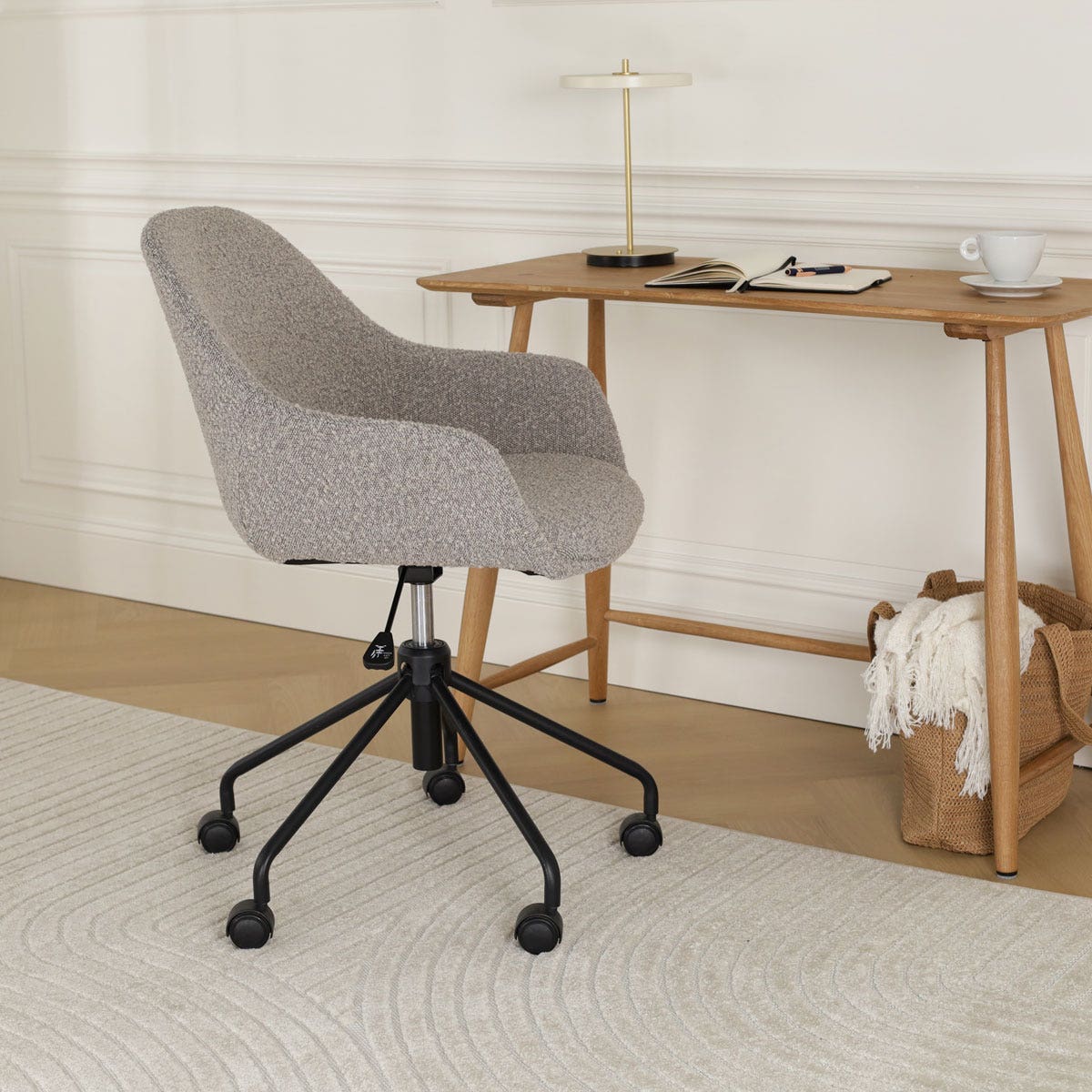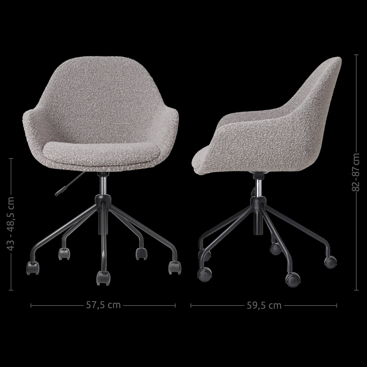 De Nout-Mae bureaustoel in taupe bouclé met zwarte poten combineert modern design met optimaal comfort. Deze stoel is ontworpen om jouw werkplek een stijlvolle en functionele uitstraling te geven. Dankzij de ergonomische kuipzitting en de schuin aflopende armleuningen biedt de stoel langdurig zitcomfort, of je nu urenlang werkt of studeert. Het stevige metalen frame met zwenkwieltjes maakt het eenvoudig om soepel te bewegen. De verstelbare zithoogte, van 43 tot 48,5 cm, zorgt ervoor dat de stoel geschikt is voor verschillende bureaus en persoonlijke voorkeuren. Het gebruik van luxe bouclé-stof geeft niet alleen een warme uitstraling, maar voelt ook prettig aan. Deze draaibare bureaustoel past perfect in een Scandinavische of moderne inrichting, dankzij de subtiele ronde lijnen en minimalistische uitstraling.