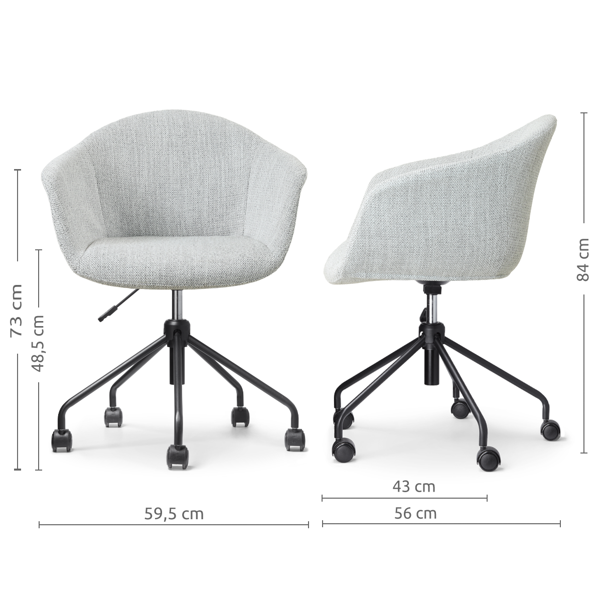 De Nout-Otis bureaustoel in grijs melange stof met zwart frame is zowel comfortabel als tijdloos. De zachte bekleding, draaifunctie en verstelbare zithoogte van 43 tot 38,5 cm maken hem ideaal voor dagelijks gebruik. De subtiele combinatie van grijs melange en zwart past moeiteloos in elk interieur, van Japandi tot industrieel.