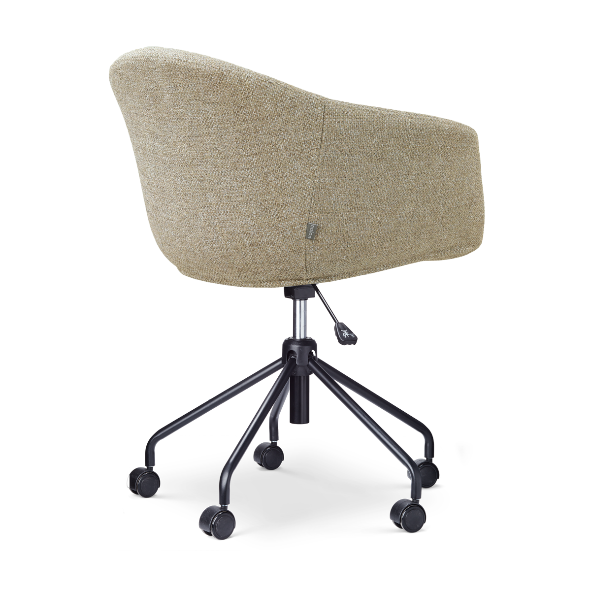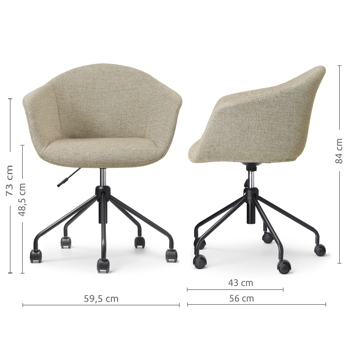 De Nout-Otis bureaustoel in taupe met zwarte poten geeft je werkplek een warme, moderne uitstraling. De zachte stof, ergonomische armleuningen en soepele wielen zorgen voor een comfortabele werkervaring. Het draaibare frame en de verstelbare zithoogte van 43 tot 38,5 cm maken de stoel zowel praktisch als elegant, ideaal voor thuiswerkers die van design houden.