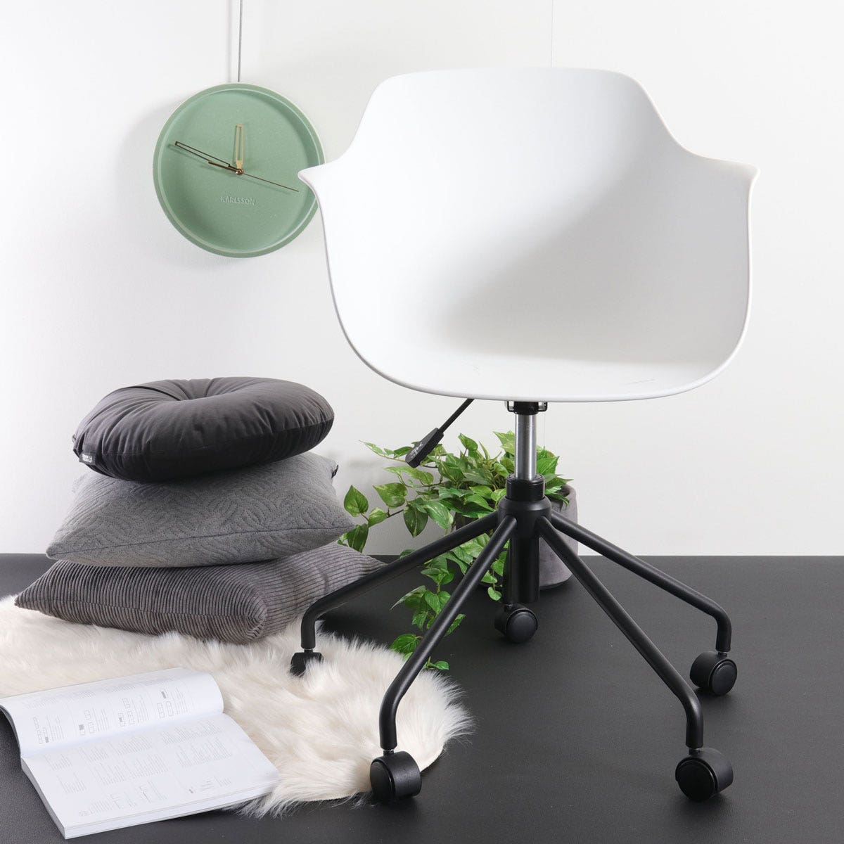 De bureaustoel heeft een kunststof kuipzitting met armleuningen om het lichaam optimaal te ondersteunen tijdens het werken. Dit materiaal is altijd enigszins flexibel, waardoor de zitting met het lichaam mee beweegt en voor veel comfort zorgt. Het metalen onderstel is voorzien van wieltjes en is in hoogte verstelbaar, zodat je op elke plek de juiste zithoogte aan kan houden en dus de perfecte zithouding hebt. Deze moderne bureaustoel heeft een tijdloos design dat in iedere thuiswerkplek tot zijn recht komt. Maak een keuze uit een compleet wit of zwart exemplaar, of ga voor een mix van deze twee kleuren. Met het Fem zitkussen van Nolon voeg je eventueel nog wat extra kleur en flair toe aan je werkplek, en zorg je ervoor dat je nog lekkerder zit. Bovendien is deze bureaustoel ook verkrijgbaar met een vast zitkussen als de Nout-Liz bureaustoel.