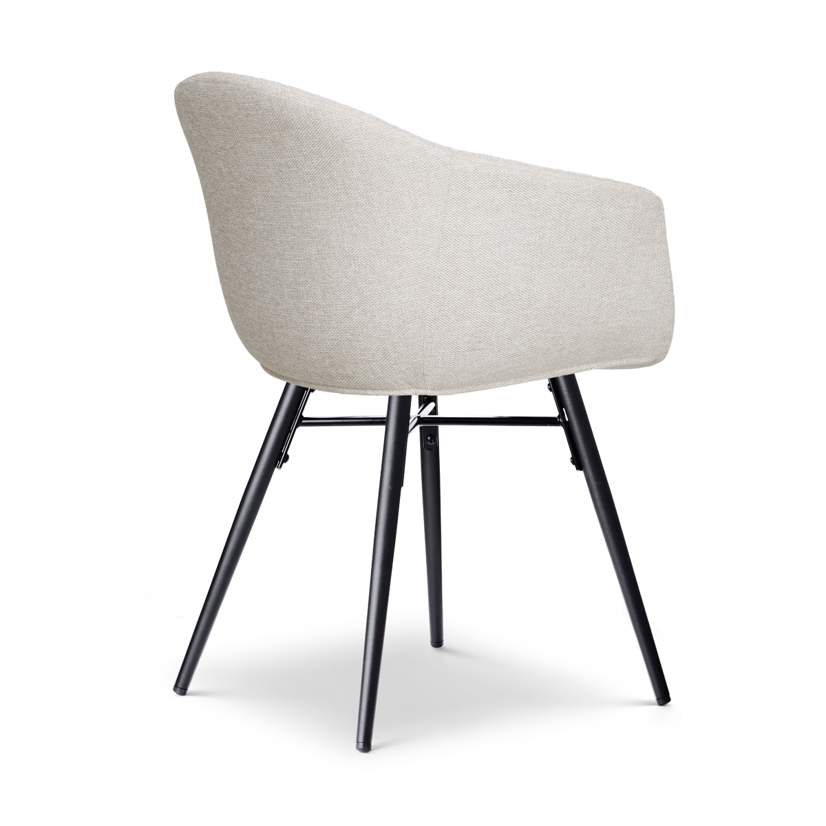 Deze stoel is verkrijgbaar in verschillende kleuren zachte stof, bovendien heeft deze stoel armleuningen, voor nog meer comfort. De gestoffeerde zitting met armleuningen in combinatie met het stijlvolle zwart metalen onderstel, geeft de stoel een moderne en stijlvolle uitstraling. De stoel is licht van gewicht en hierdoor gemakkelijk te verplaatsen, waardoor hij in iedere ruimte in je woning te gebruiken is. Kortom, een ideale stoel voor bij jou thuis!
