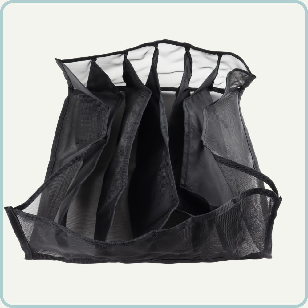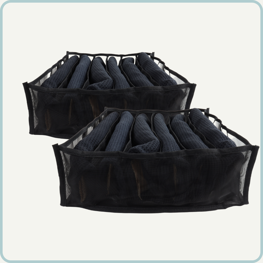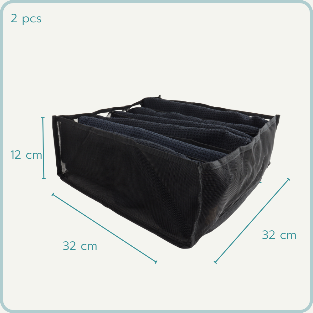 De Nordix Kleding Organizer is een set van 2 zwarte kunststof vakken die een lade in 6 delen opdeelt. Het helpt bij het sorteren van kledingstukken en accessoires en maakt het gemakkelijk om te vinden wat je zoekt. Het is verstelbaar, dus past in elke lade. De productafmeting is 32 x 32 x 12 cm