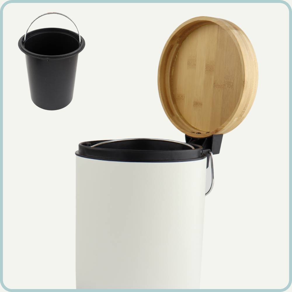 De prullenbak van NORDIX is geschikt voor 3 L aan afval. Het is een pedaalemmer en wordt niet geleverd met zakken. De prullenbak is rond van vorm en is wit van kleur. De pedaalemmer is gemaakt van metaal en bamboe.