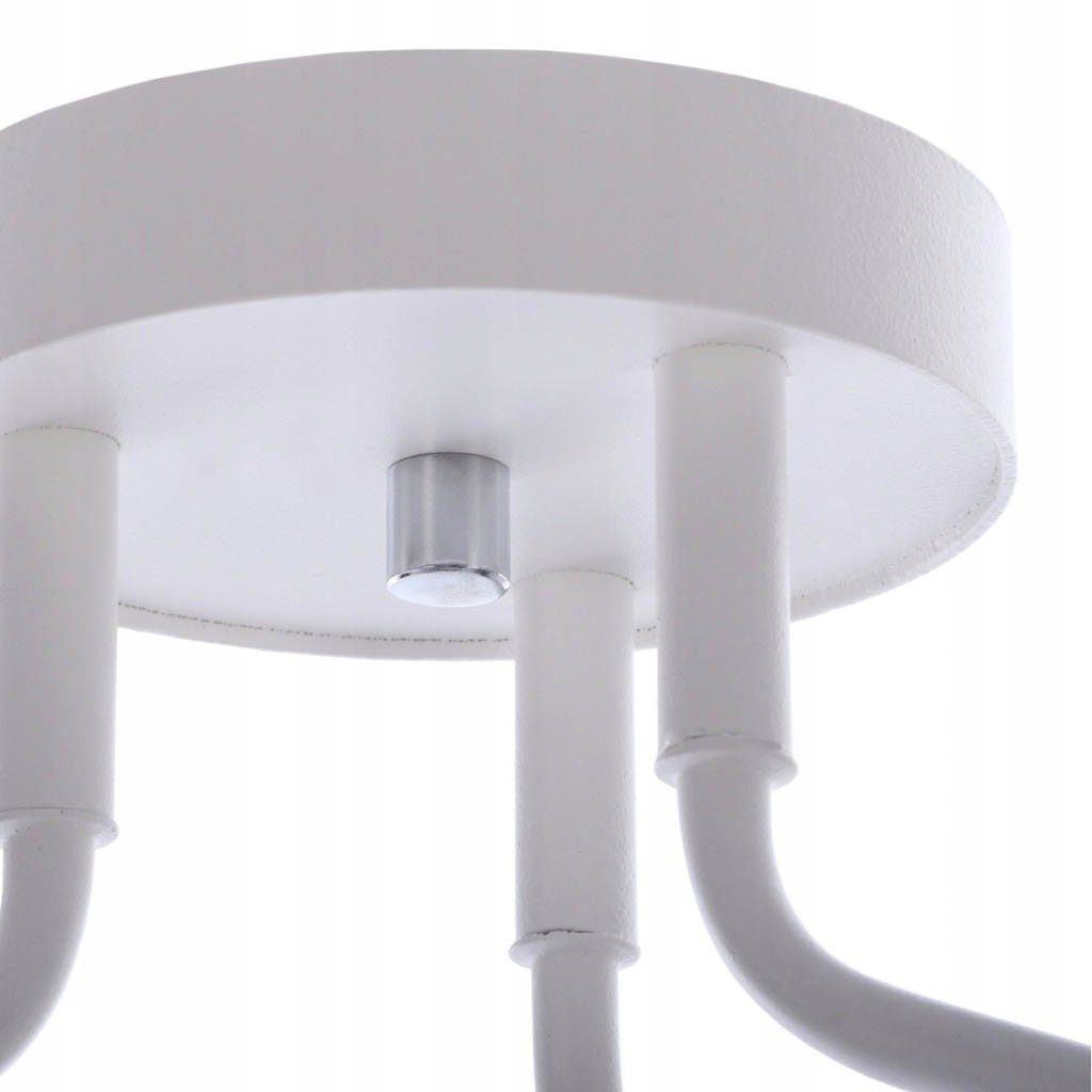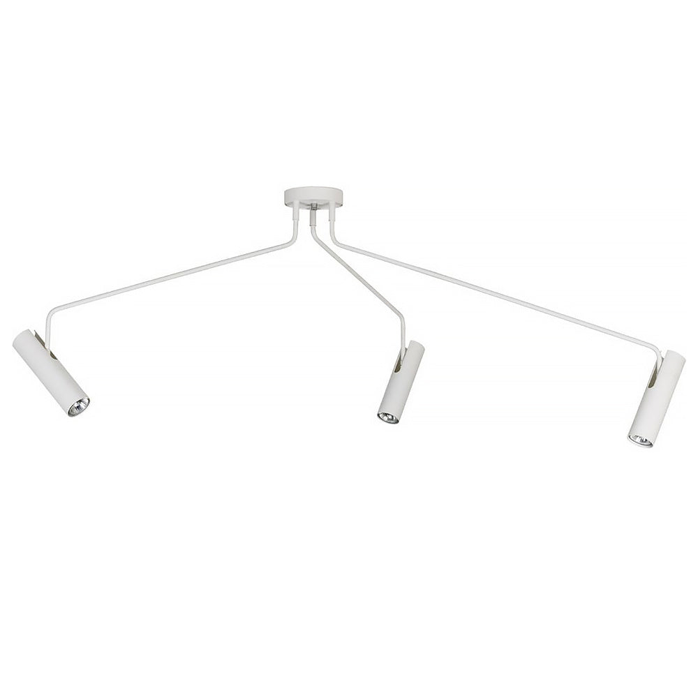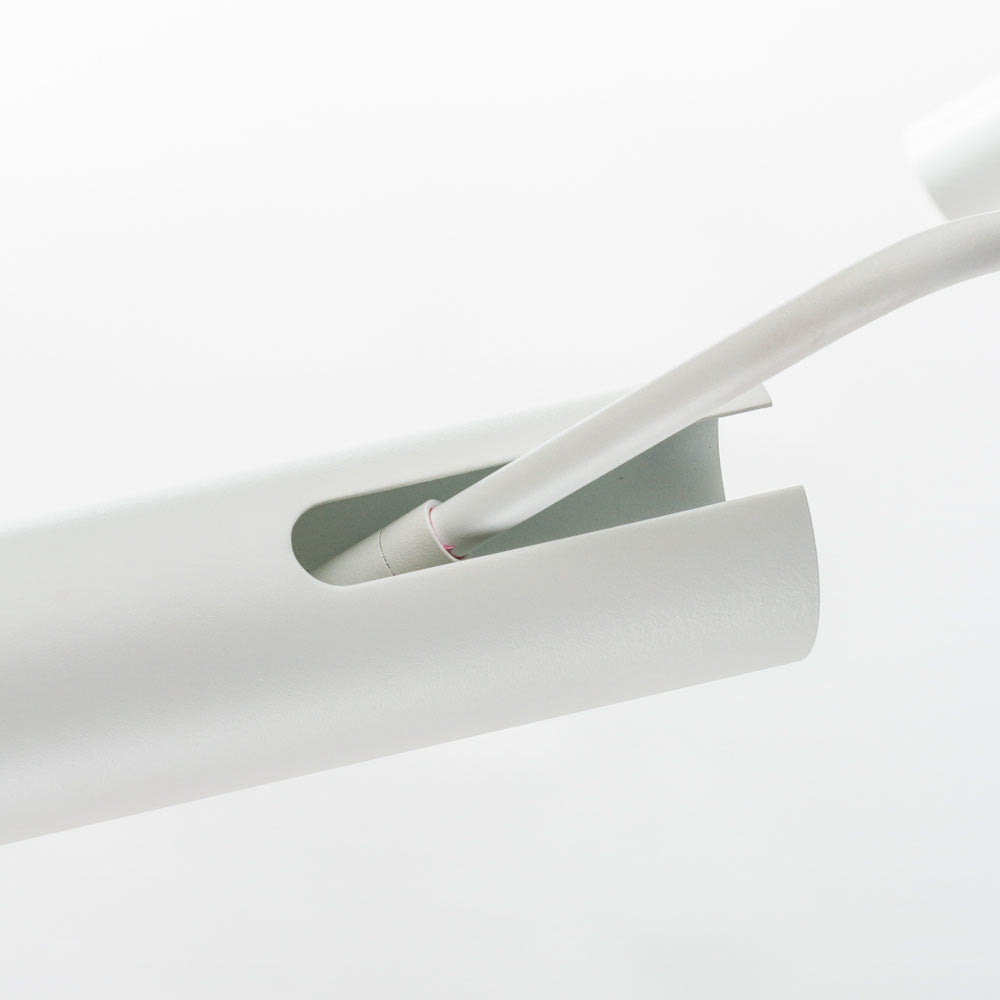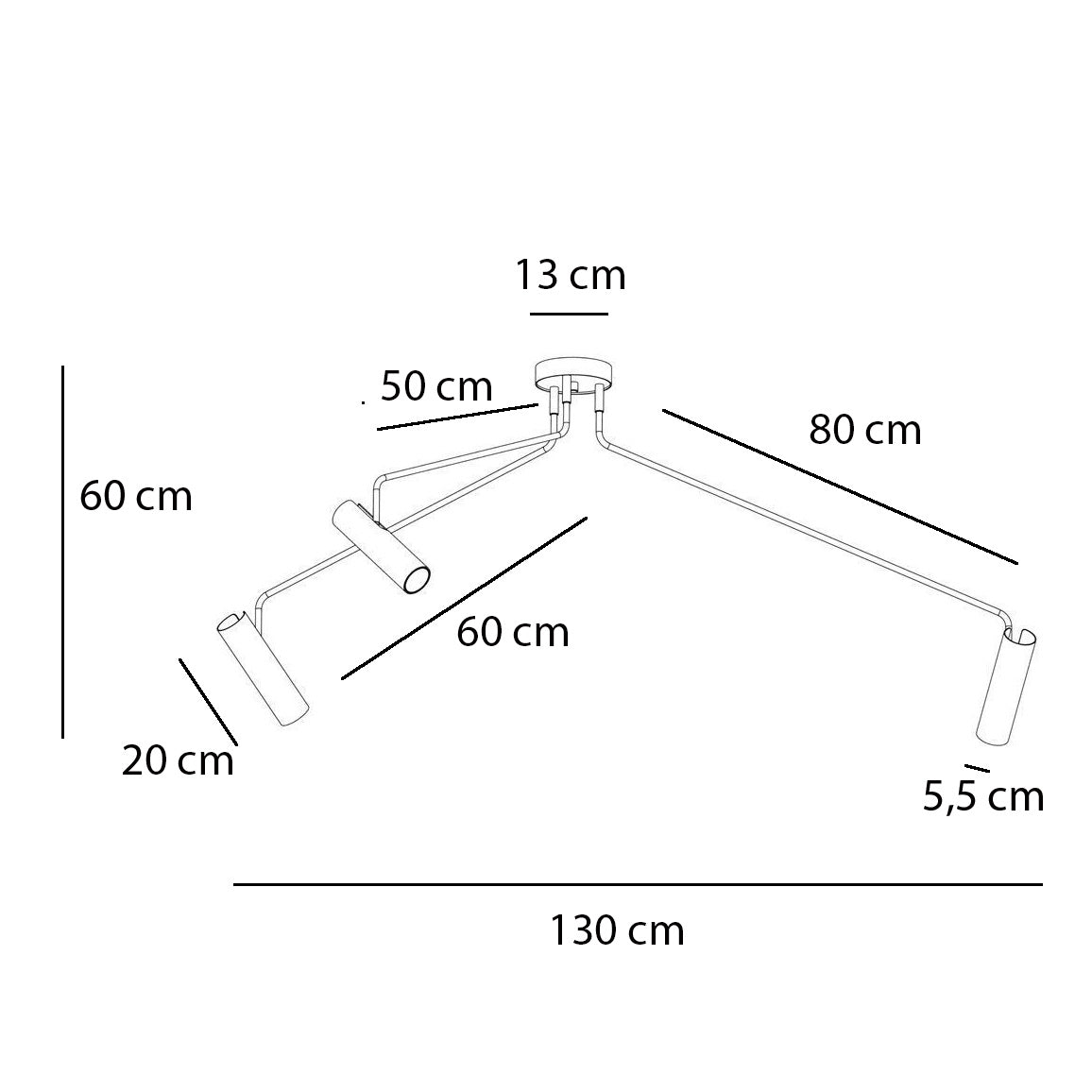 Arm 1 is ong. 80 cm, arm 2 is ong. 60 cm en de derde arm heeft een lengte van ong. 50 cm. De koker waar de lichtbron in kan heeft een lengte van 20 cm en een doorsnede van 5,5 cm. De totale doorsnede van dit armatuur is ongeveer 130 cm. Dit armatuur wordt geleverd zonder lichtbronnen maar is geschikt voor 3x GU10 (LED) lampen van maximaal 35 Watt. Deze metalen spot is mat-wit van kleur.