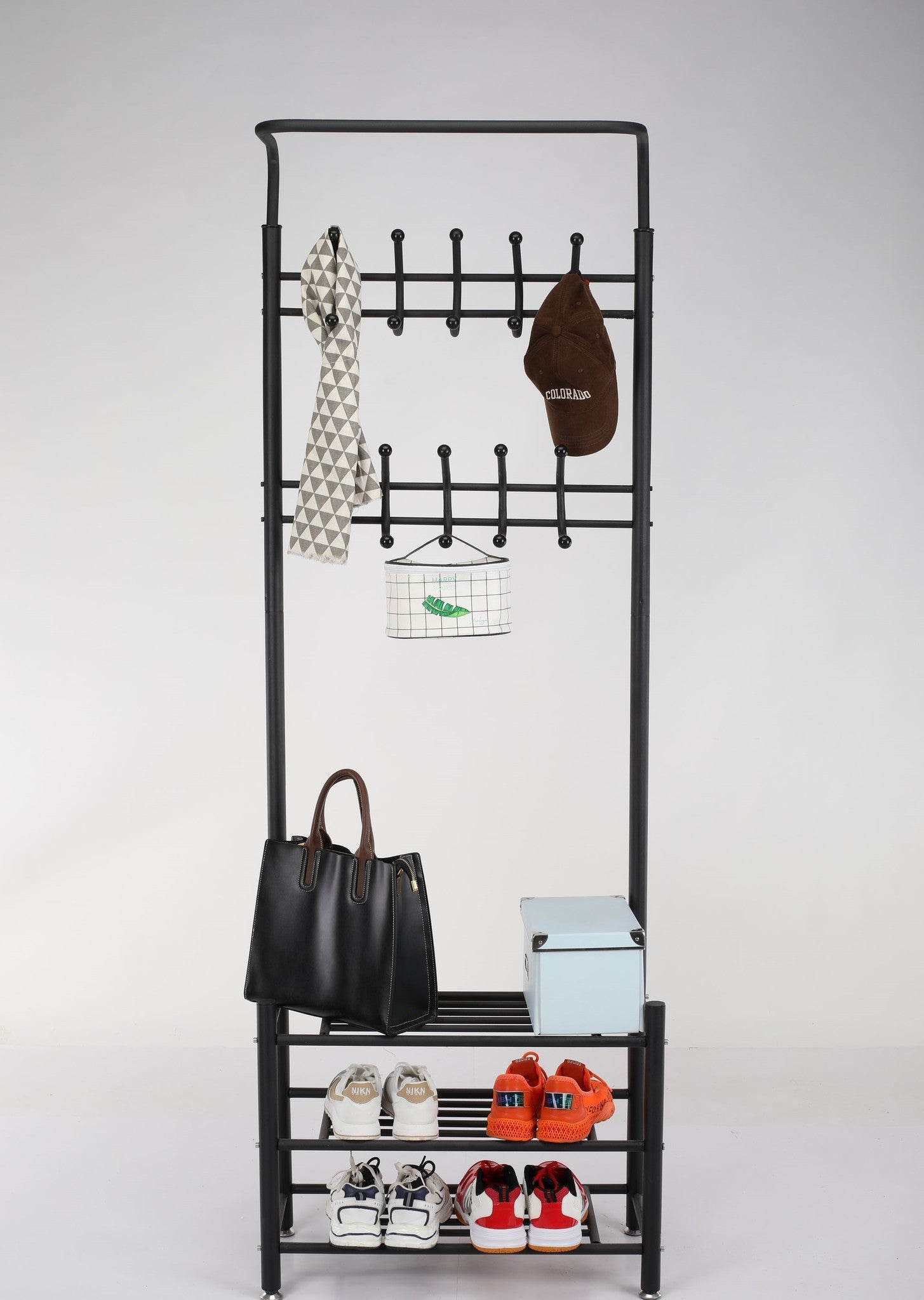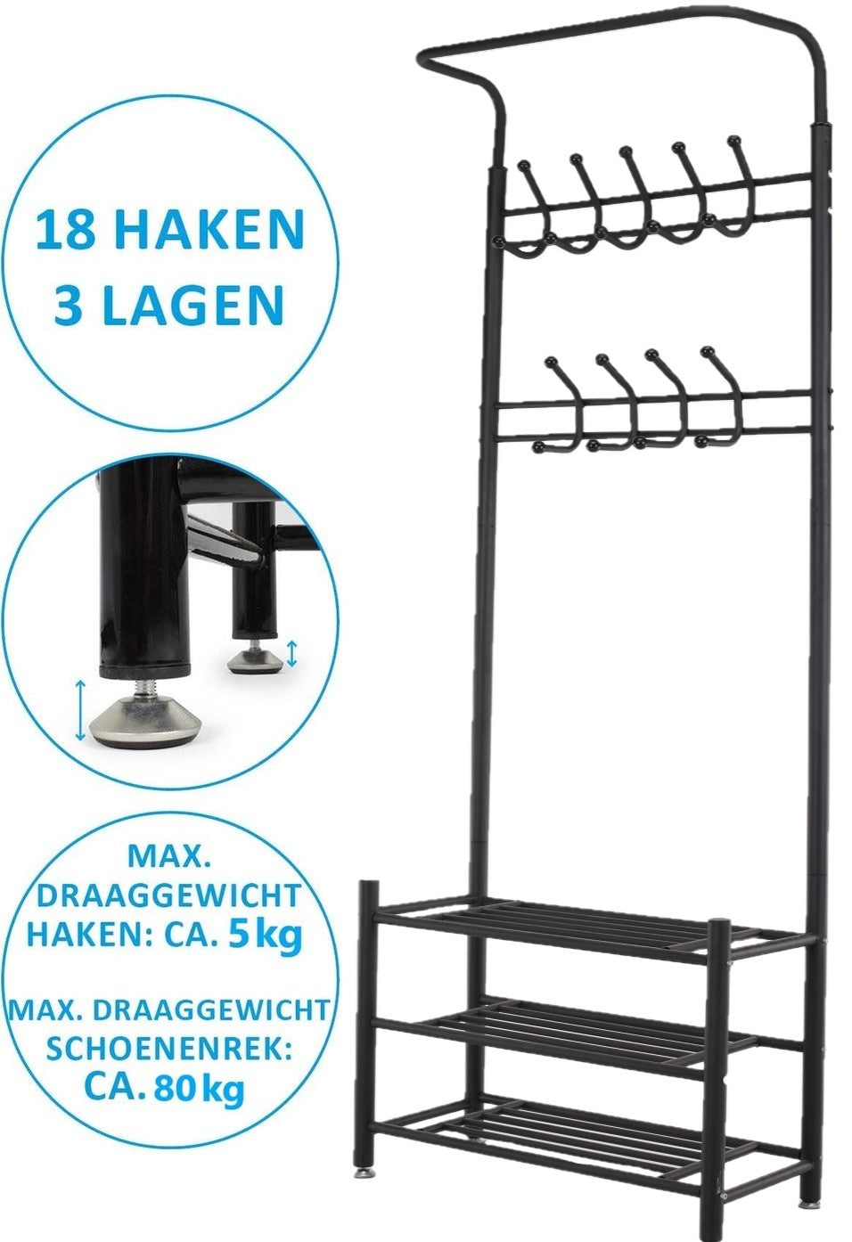 - Kapstok met schoenenrek: Staande kapstok met 18 Haken en 3 planken voor 6 paar schoenen.