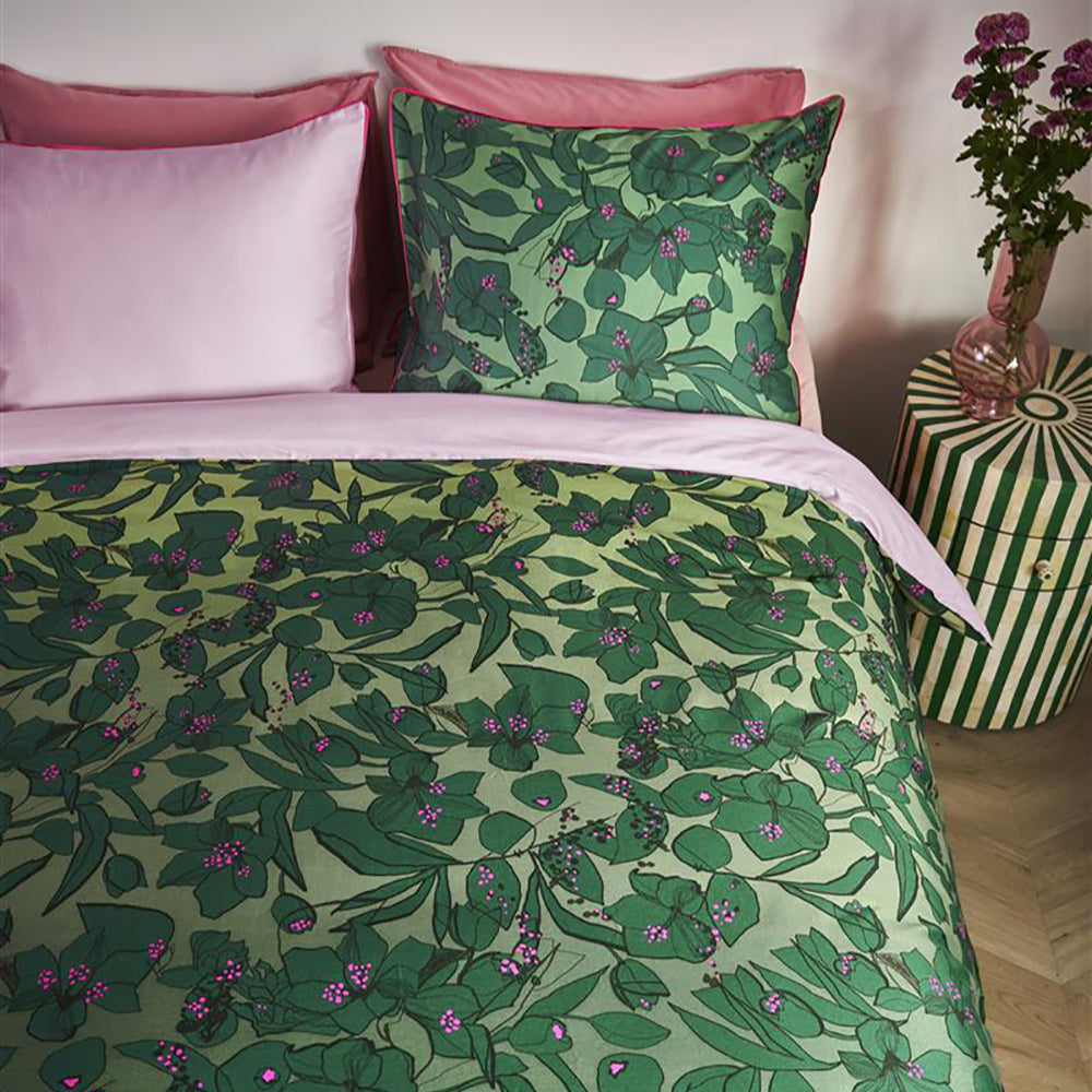 Op zoek naar een trendy en hip dekbedovertrek? Het dekbedovertrek Sketchy Flower van Oilily is dan de perfecte keuze! Het overtrek bestaat uit een allover bloemenprint van losjes geschetste bloemen en takken op een achtergrond met een subtiel kleurverloop. Het kleurverloop is van licht- naar donkergroen. De felroze bies rondom het kussensloop zorgt voor een luxe uitstraling. De achterkant in uni roze maakt het geheel helemaal af.
