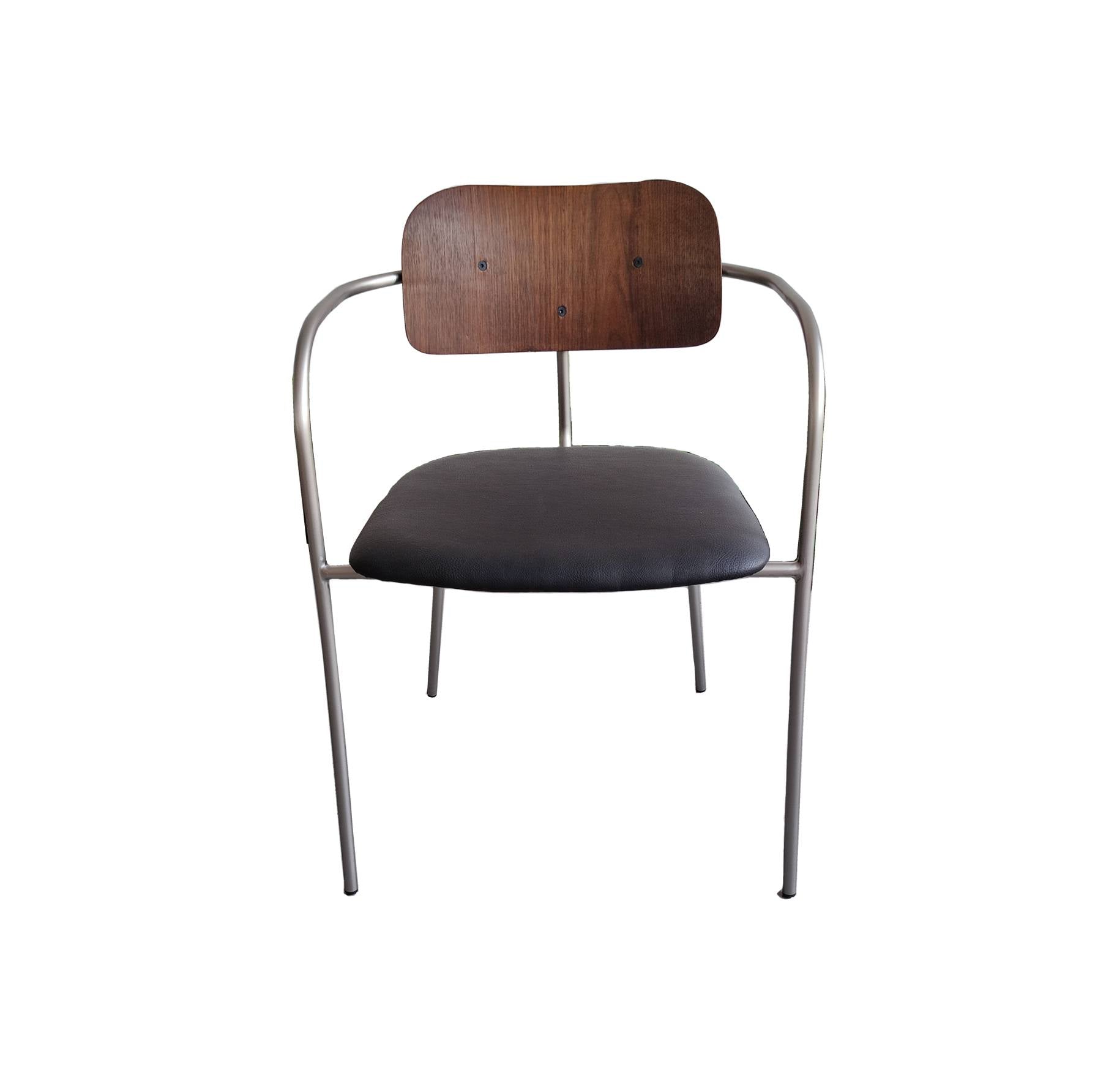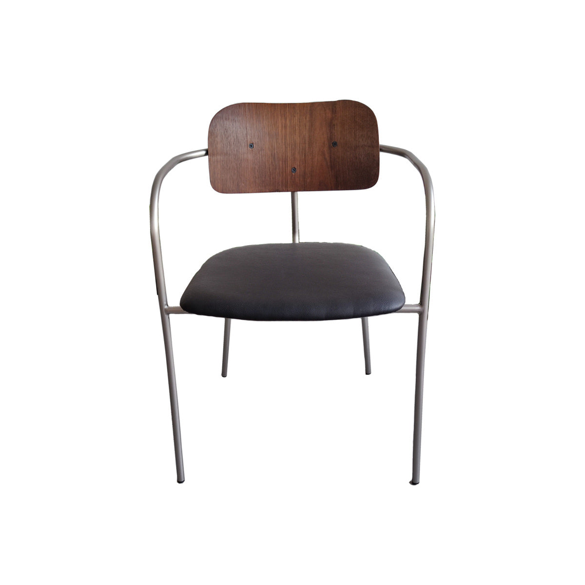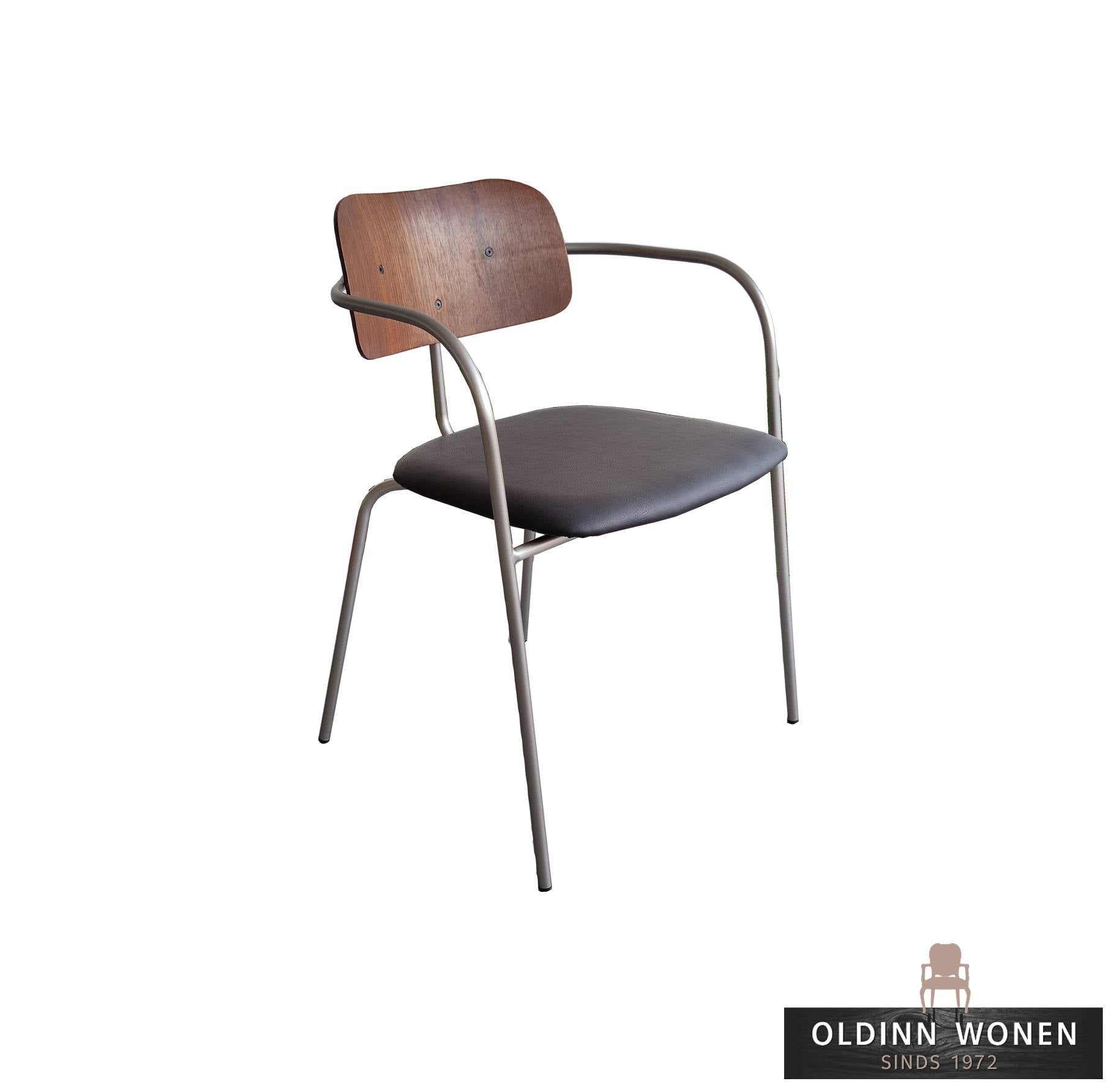 - MATERIAAL ✔ De stoel bestaat uit een metalen frame, met een zitting van imitatieleer, en daarnaast een houten rugleuning.