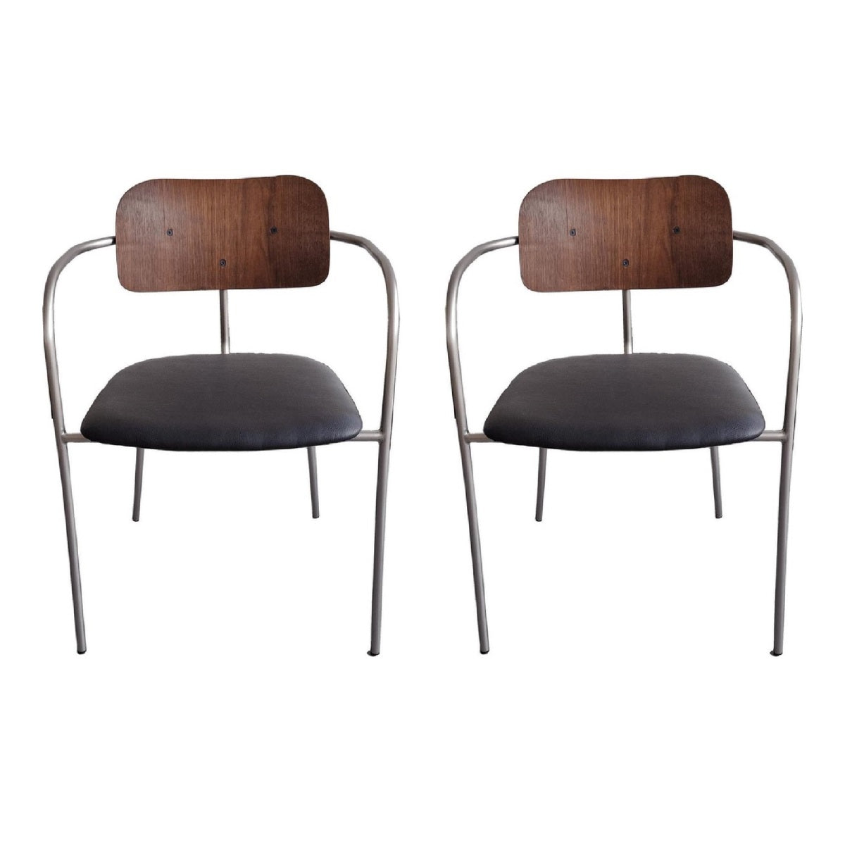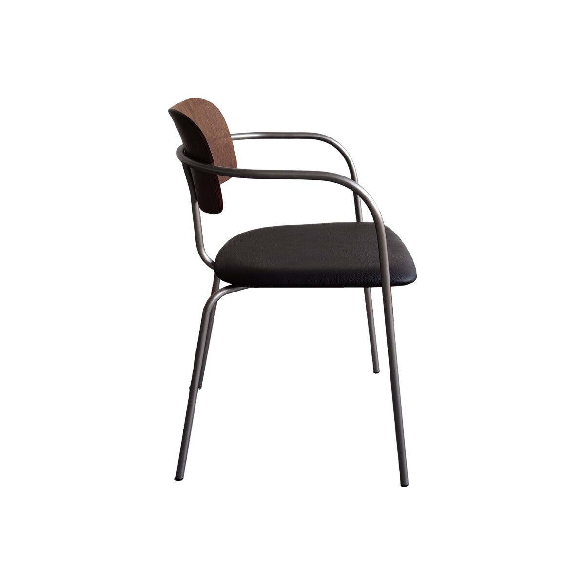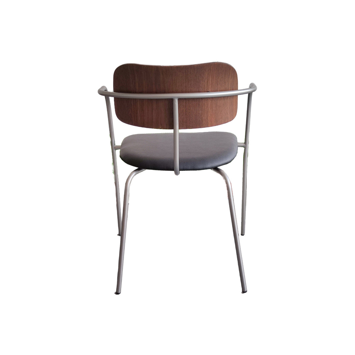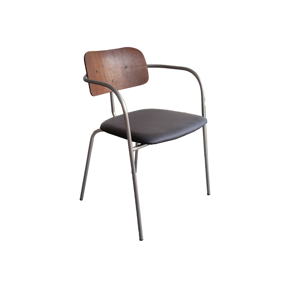 - MATERIAAL ✔ De stoel bestaat uit een metalen frame, met een zitting van imitatieleer, en daarnaast een houten rugleuning.