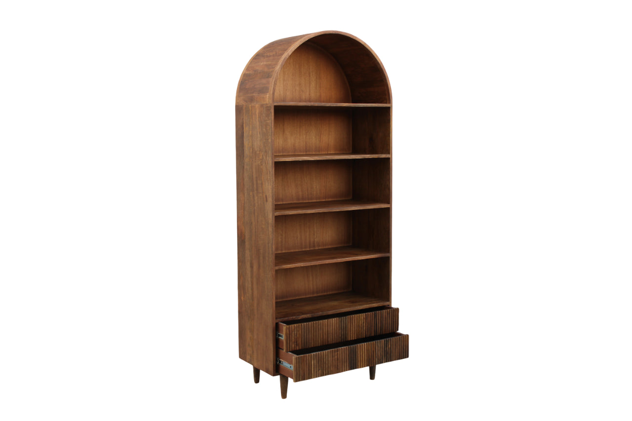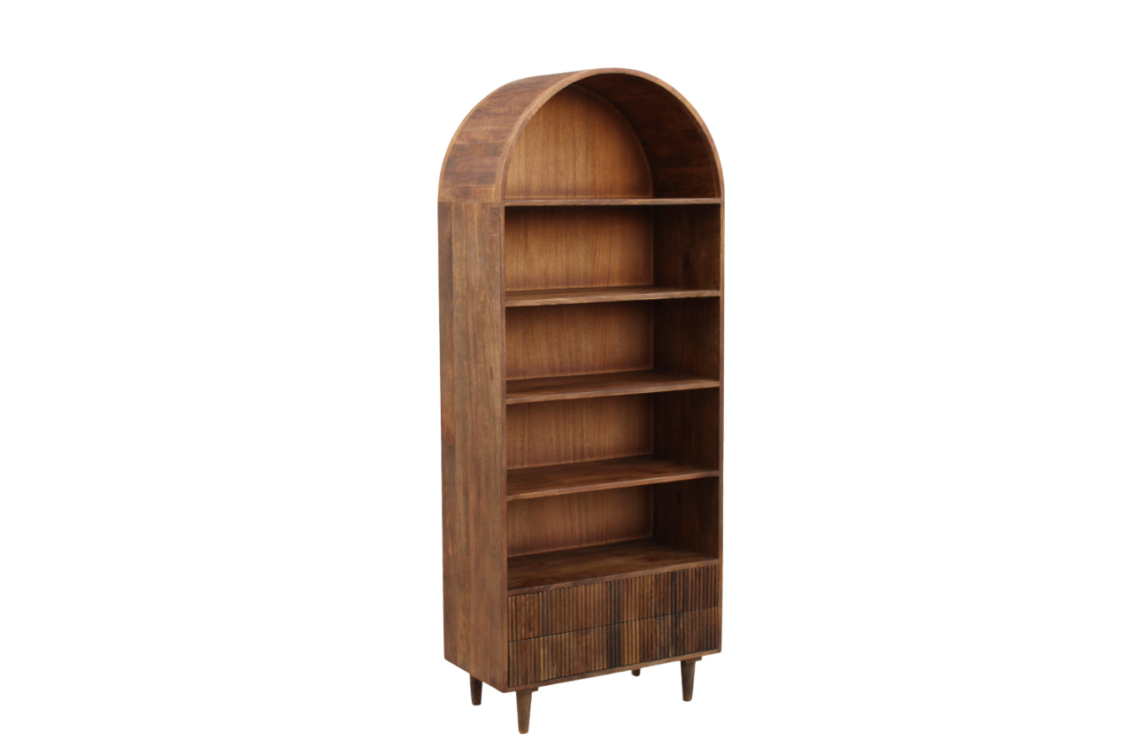 Geef je interieur een elegante en moderne touch met Boekenkast Milaan. Deze stijlvolle kast is gemaakt van duurzaam mangohout en heeft een warme bruine tint die perfect past in elk interieur. De ronde bovenkant en strakke lijnen zorgen voor een uniek design dat een echte blikvanger is in je woonkamer, kantoor of slaapkamer.