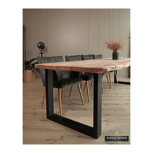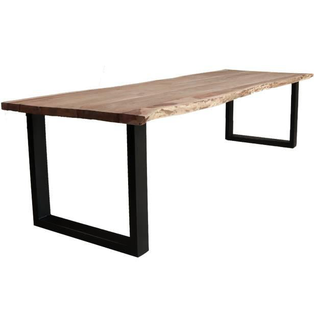 Eettafel boomstamtafel rechthoekig voor 4 personen met een tafelblad van onbewerkt acacia hout. De bruine eettafel heeft dankzij het mooie houten blad en de zwart metalen U Poot Smal een industriële uitstraling.