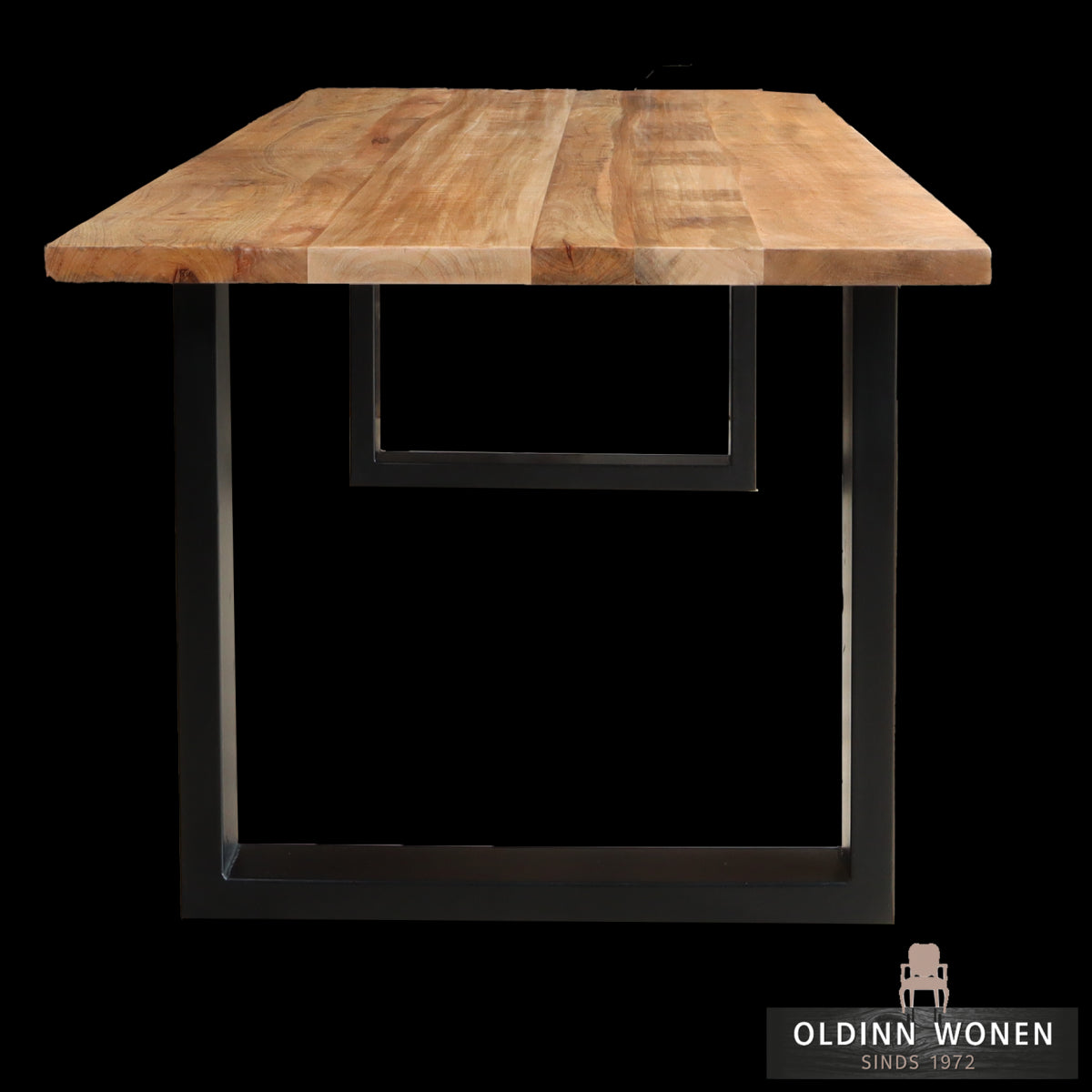 Eettafel voor 6 personen met een tafelblad van mangohout. De bruine eettafel heeft een industriële uitstraling met een zwarte metalen U Poot smal.