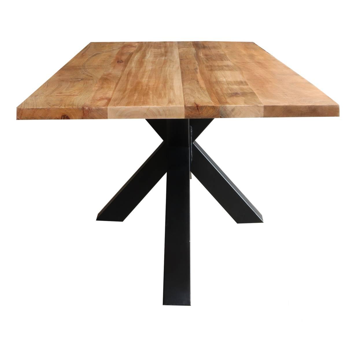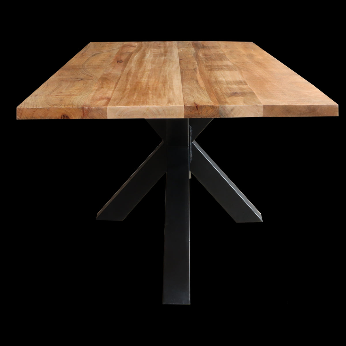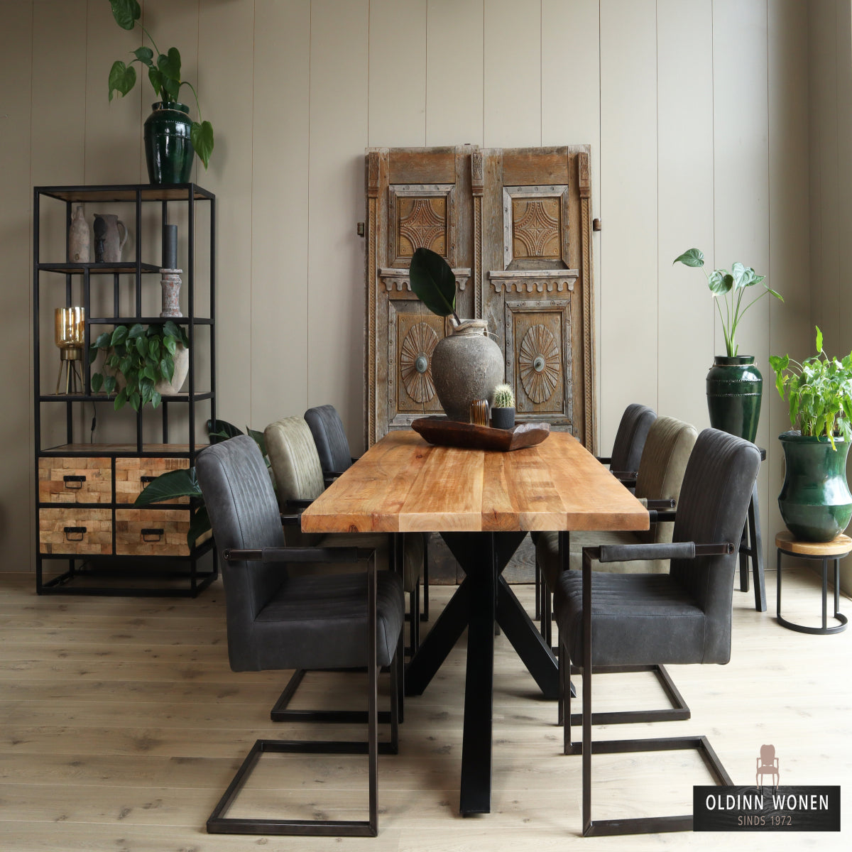 Eettafel voor 8 personen met een tafelblad van mangohout. De bruine eettafel heeft een industriële uitstraling met een zwarte metalen spinpoot.